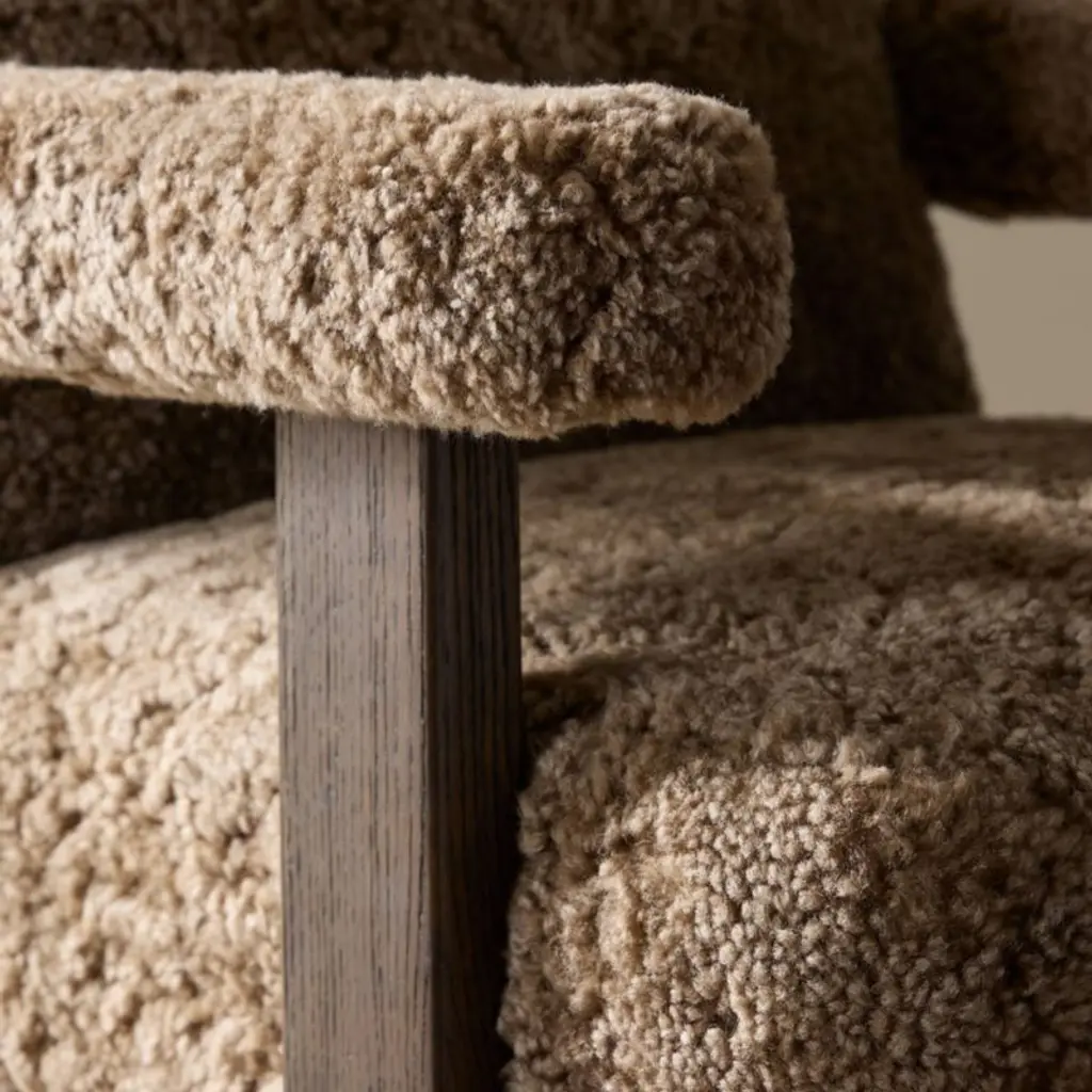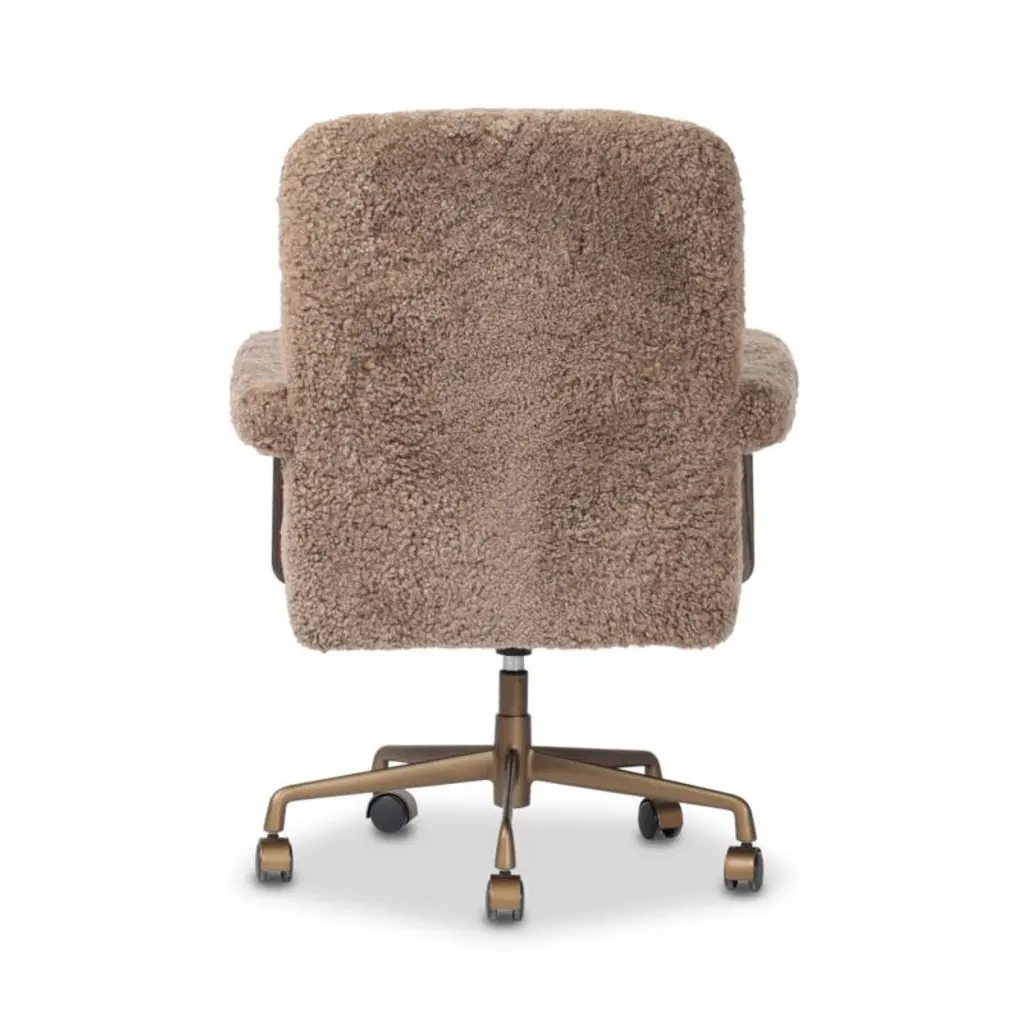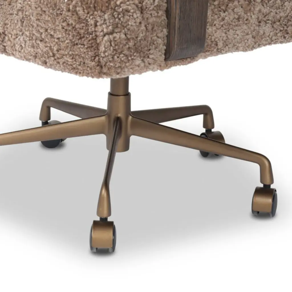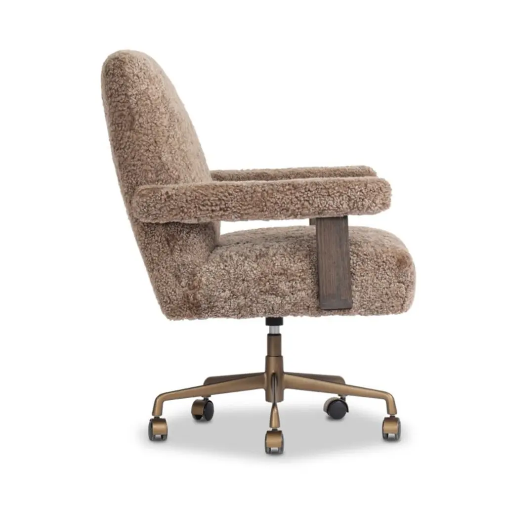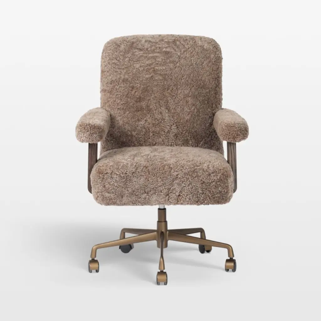Taupe shearling wraps Bergen's comfortable contours in luxury. Bringing living room indulgence to the home workspace, the plush office chair features a generously sized seat, supportive back and upholstered arms. Solid oak arm supports and a brushed brass finish on the stainless steel base add to the chair's warm and inviting appearance. Caster wheels and a 360-degree swivel make it easy to maneuver about the office.