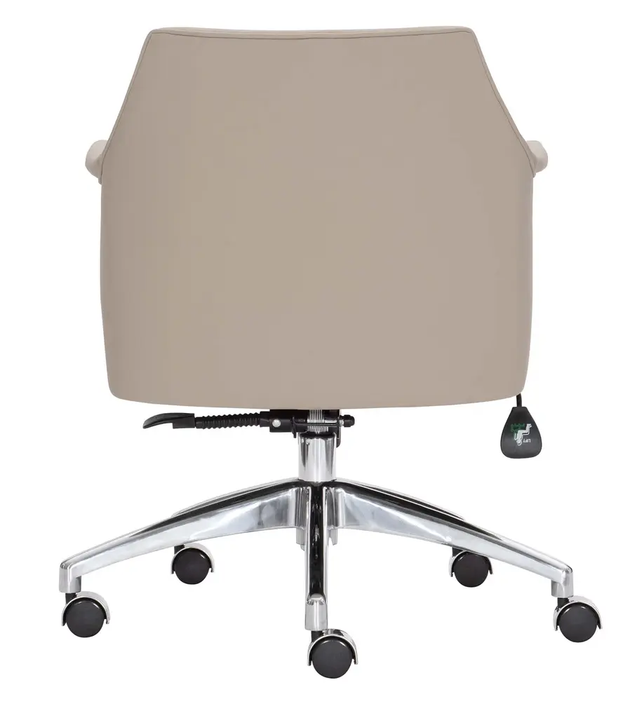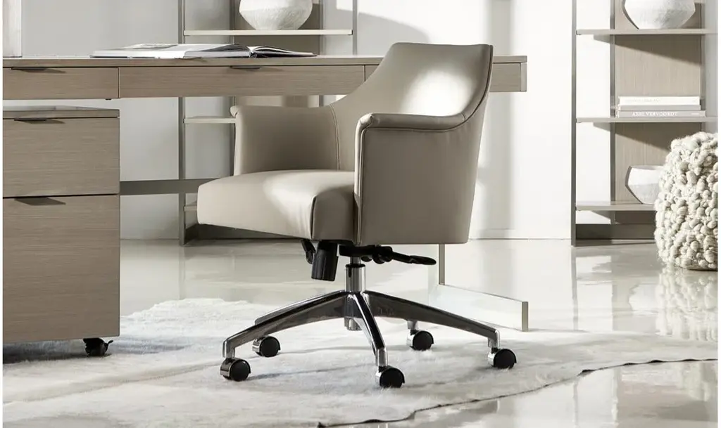 Experience the Bernhardt Tiemann Office Chair's flawless fusion of design and use. This chair is perfect for a modern home office since it combines an elegant interior design with useful features that keep you comfortable and productive all day. With its flared arms and softly curved back, the Tiemann Office Chair is unique and offers a supportive yet fashionable seating experience. With its elegant knife-edge finish and sleek form, it exudes a sophisticated look that goes well with any office setting. This chair is made for convenience, not just style. You may move easily and fluidly from activity to task thanks to the stainless steel swivel base. Even on carpeted flooring, mobility is never a problem thanks to the five sturdy casters. You may tailor your seating position to your preferences using the chair's tilt mechanism and height adjustments, which will help you maintain better posture and comfort throughout extended workdays. Enhance your home office with the Bernhardt Tiemann Office Chair and enjoy a seamless blend of style and practicality.
