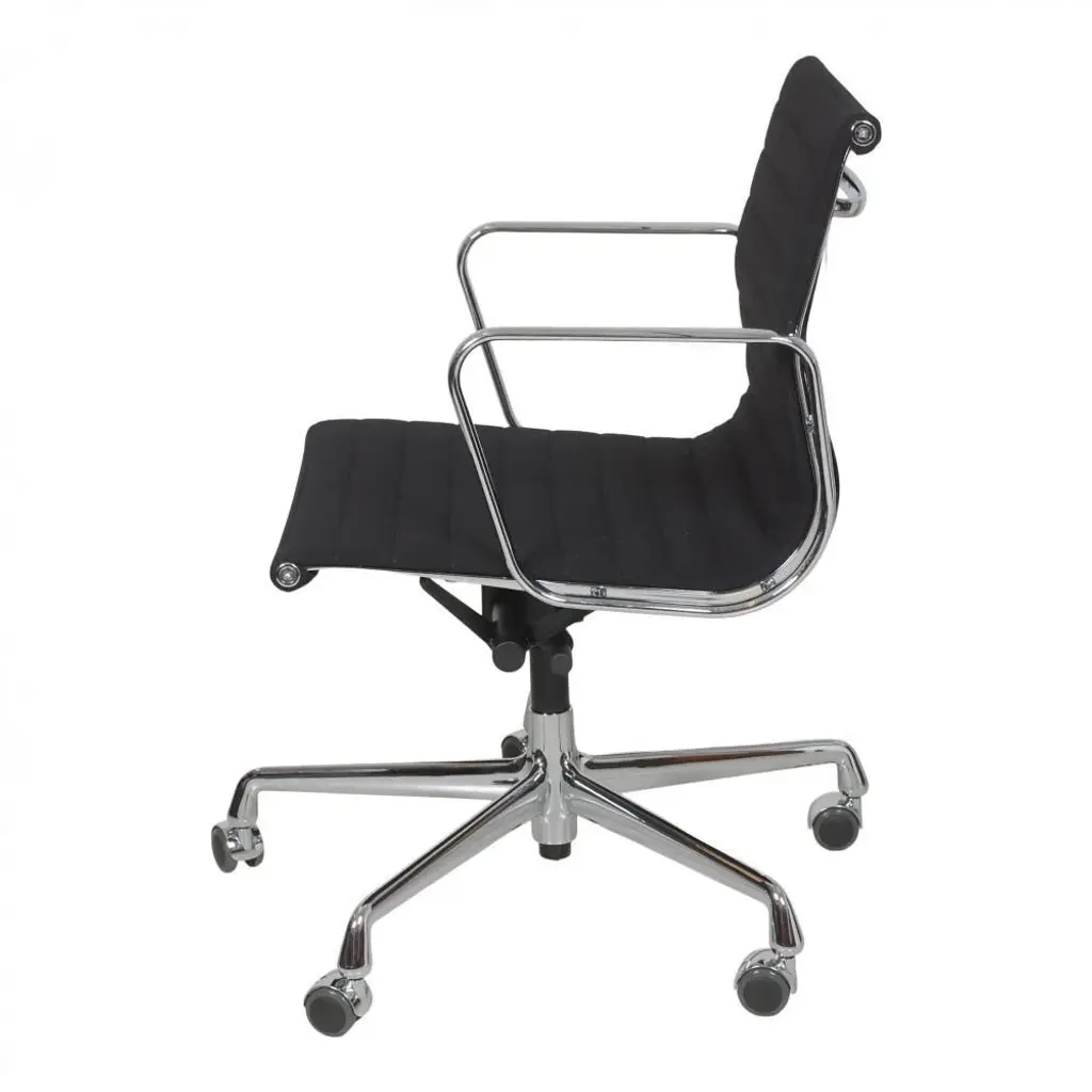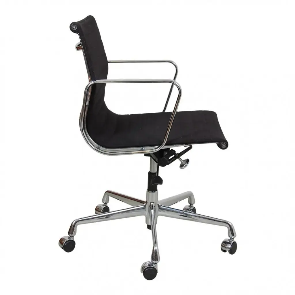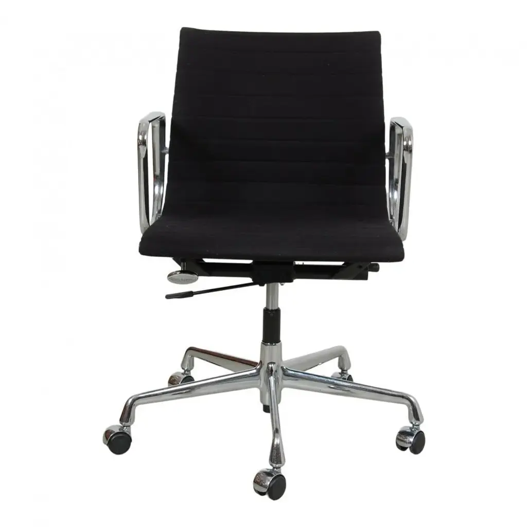 Charles Eames EA-117 office chairs in black fabric and with chrome frame. The chairs are from 1997 and appear in good condition with some patina. Designer : Charles Eames. Manufacturer : Vitra. Model : Ea-117 Dimensions: Height: 81.5-92.5 Width: 58 Depth: 57 Seat height: 38.5 - 50 cm. Materials: Black hopsack fabric, chrome base, and arms. Functions : Tilt, and height adjustment as well as hard wheels. Condition : Second-hand chairs from 1997, appears in good condition with some small stains and the fabric, and a few scratches on the arms.