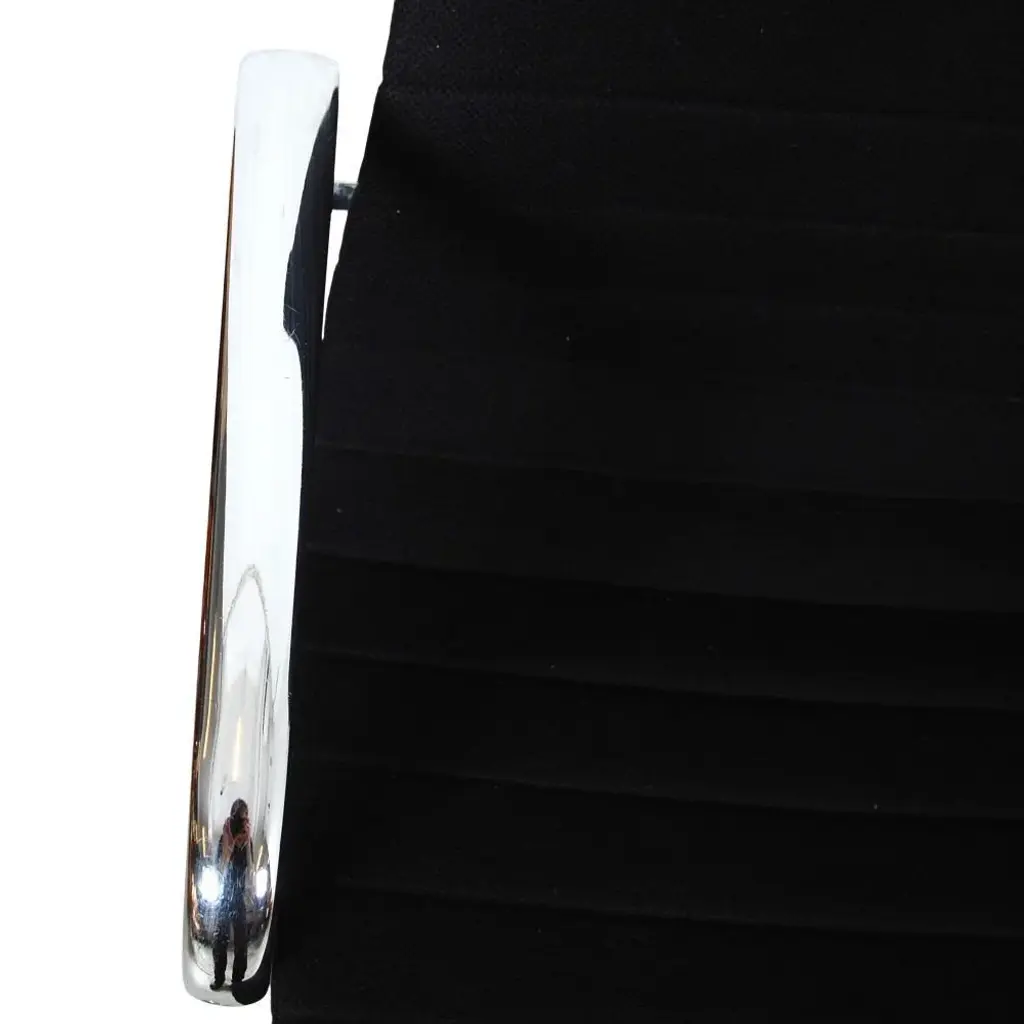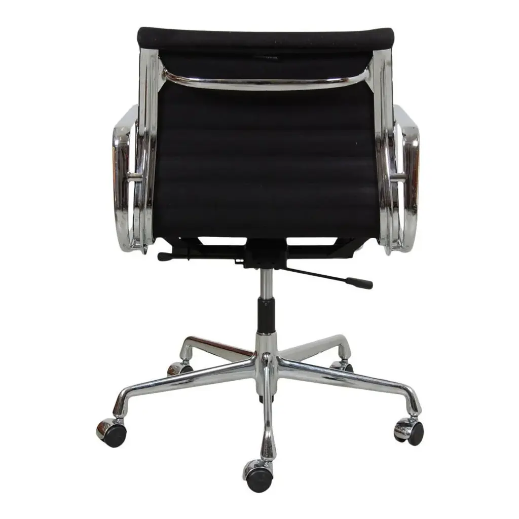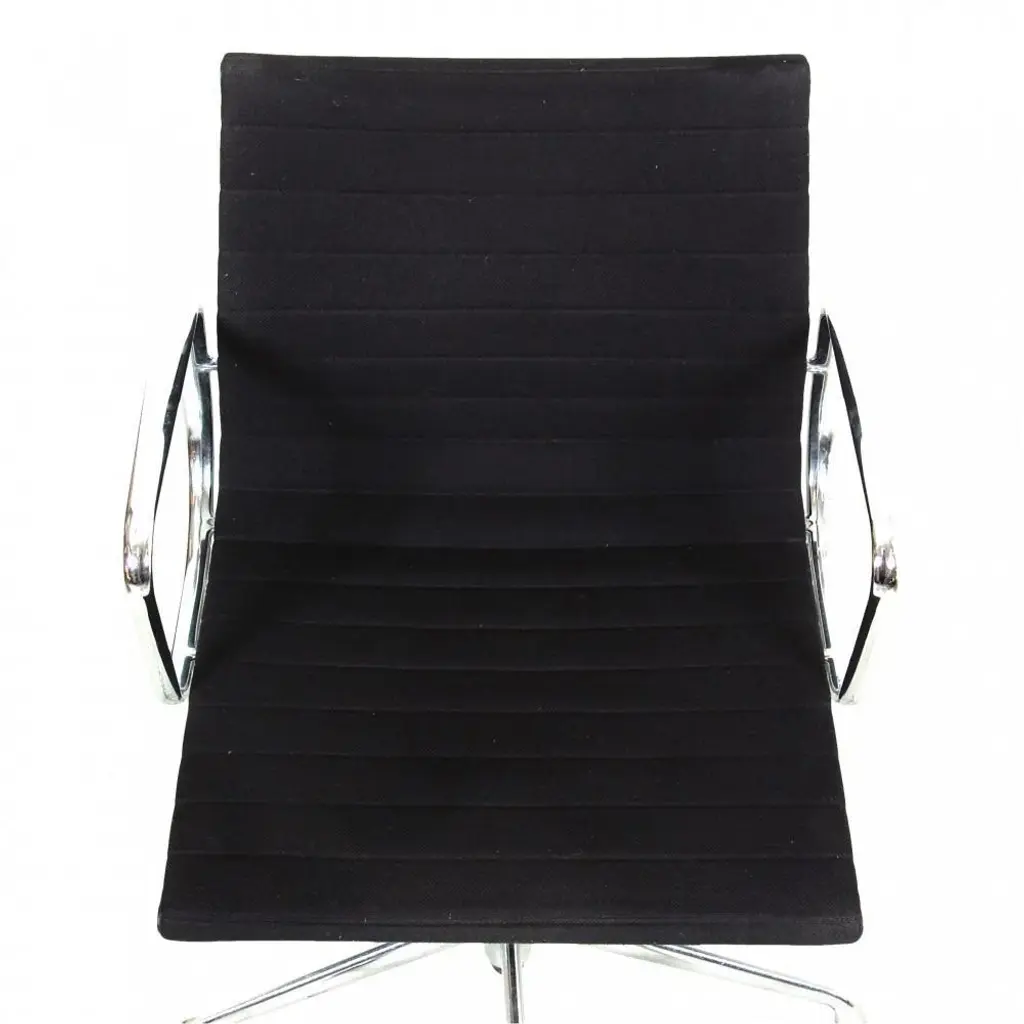 Charles Eames EA-117 office chairs in black fabric and with chrome frame. The chairs are from 1997 and appear in good condition with some patina. Designer : Charles Eames. Manufacturer : Vitra. Model : Ea-117 Dimensions: Height: 81.5-92.5 Width: 58 Depth: 57 Seat height: 38.5 - 50 cm. Materials: Black hopsack fabric, chrome base, and arms. Functions : Tilt, and height adjustment as well as hard wheels. Condition : Second-hand chairs from 1997, appears in good condition with some small stains and the fabric, and a few scratches on the arms.