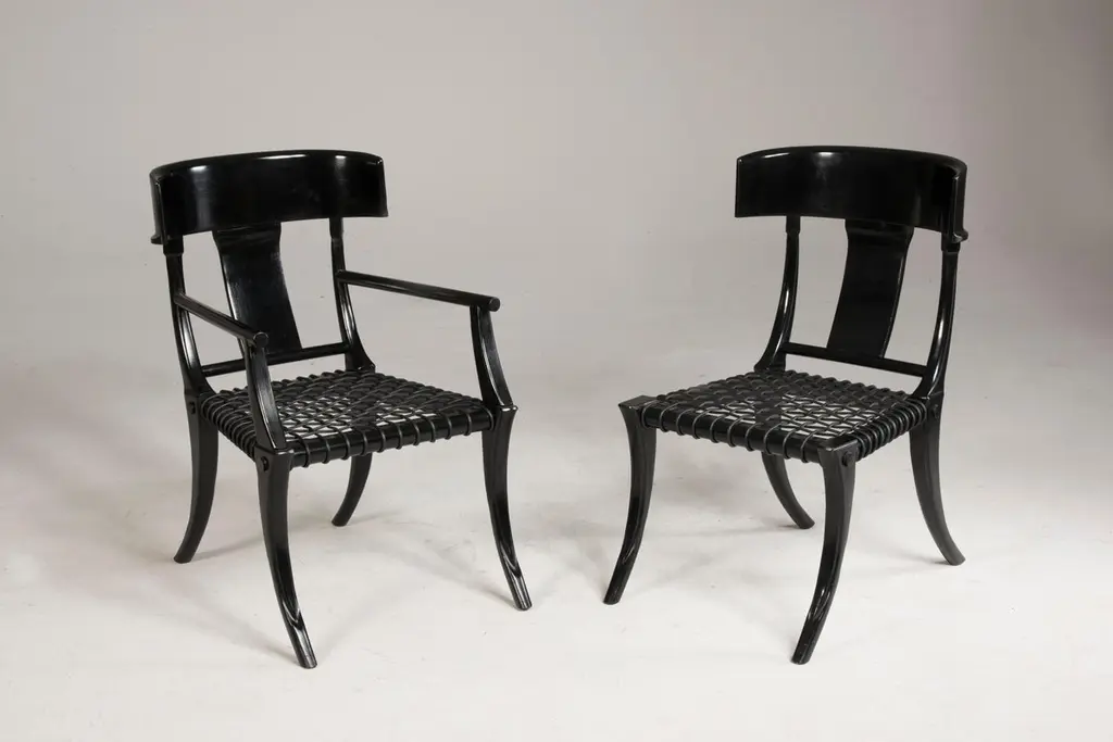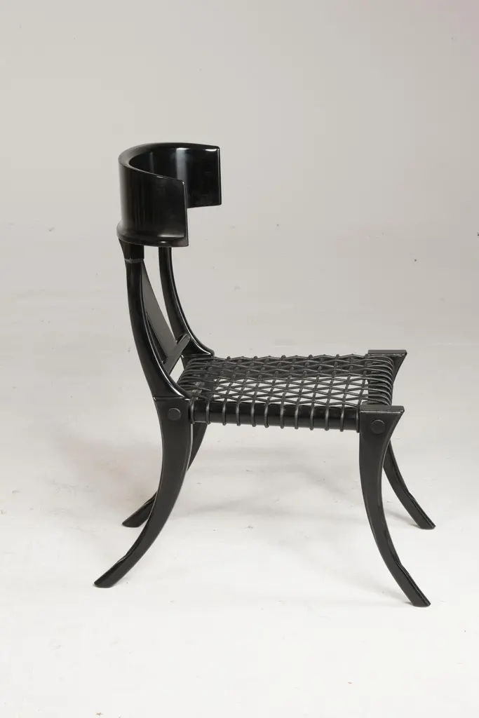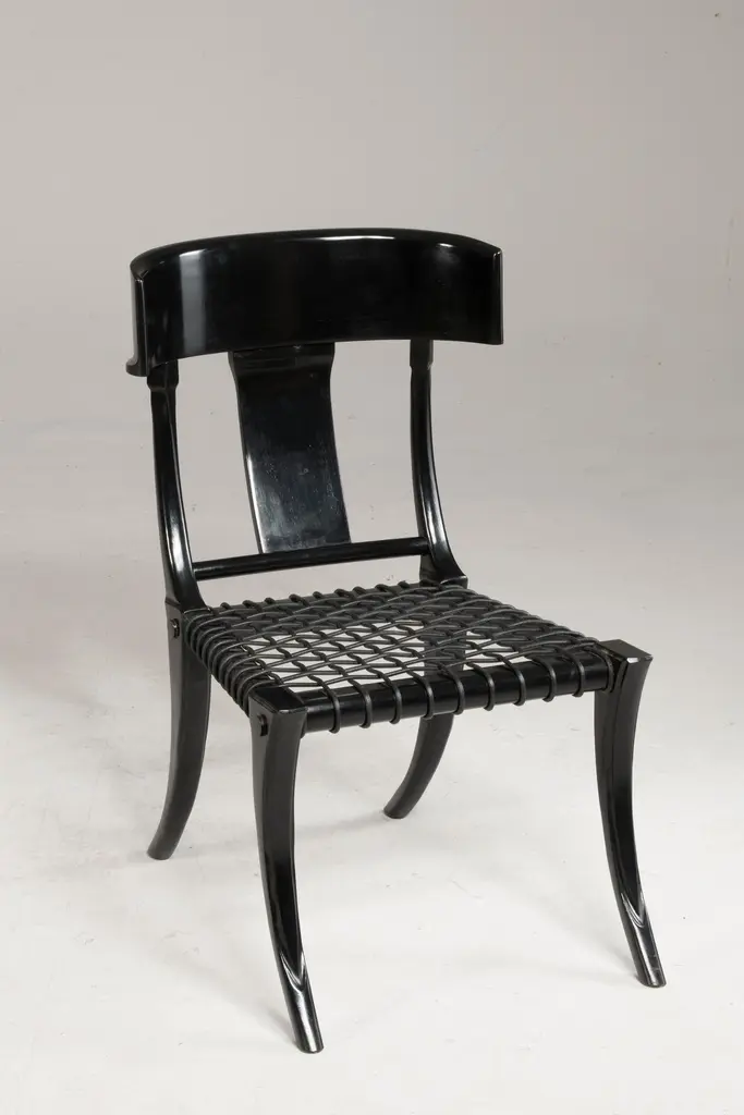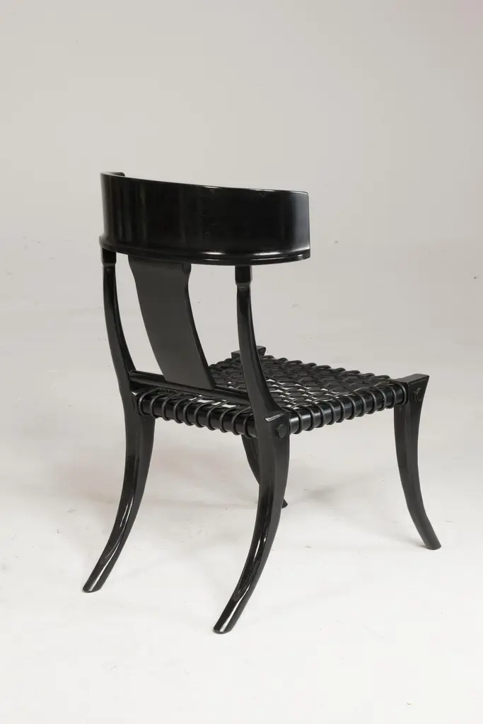 Klismos customizable dining chairs with saber legs, black lacquered wood and black woven leather seats. Available in other colors and upholstery. Italian artisanal production by Pescetta Home Decoration.Klismos are walnut wood chairs with deep and large seat and back wraparound feeling backrest. These chairs are made in Italy. They are realized according to the historical model named "Klismos" which is a type of ancient Greek chair, very often depicted on ancient furniture or on painted pottery and in bas-reliefs from the mid-5th century BCE onwards. The simple and elegant lines of the saber legs have been proposed and reconsidered several times during the history, making it a chair without age and never out of fashion. The long and elegant curve for the backrest is quite difficult to create and it is obtained from a single piece of wood.They are extremely comfortable and wraparound, the seat is large and deep allowing them to be suitable in a meeting room, as well in the dining room or used as desk chairs. You can complete the seat with a separate pillow (see the pictures as example).Price refers to chairs with following characteristics: Wood: Black lacquer, shiny finishing Upholstery: Black woven leather Possible customizations:Wood: Natural wood, black, shabby white, lacquer on request. Upholstery: Velvet, cotton, leather, eco leather. You can provide your own fabric.Upholstery seat: plain, capitonnè (with buttons), woven leather. Kind of seating: Chairs, armchairs, stools and benches are available. Dimensions:H of backrest 35.44 in. x legs max W 19.7 in. x legs max D 28.35 in. seat H 15.7"H of backrest 90 cm x legs max W 50 cm x legs max D 72 cm x seat H 40 cm. Lead time is around 20 business day depending on the customizations requested. A video of the item Is available upon request You can even arrange the pick up of the objects.