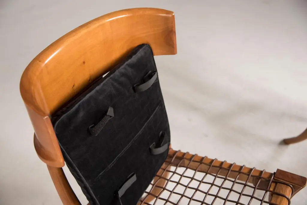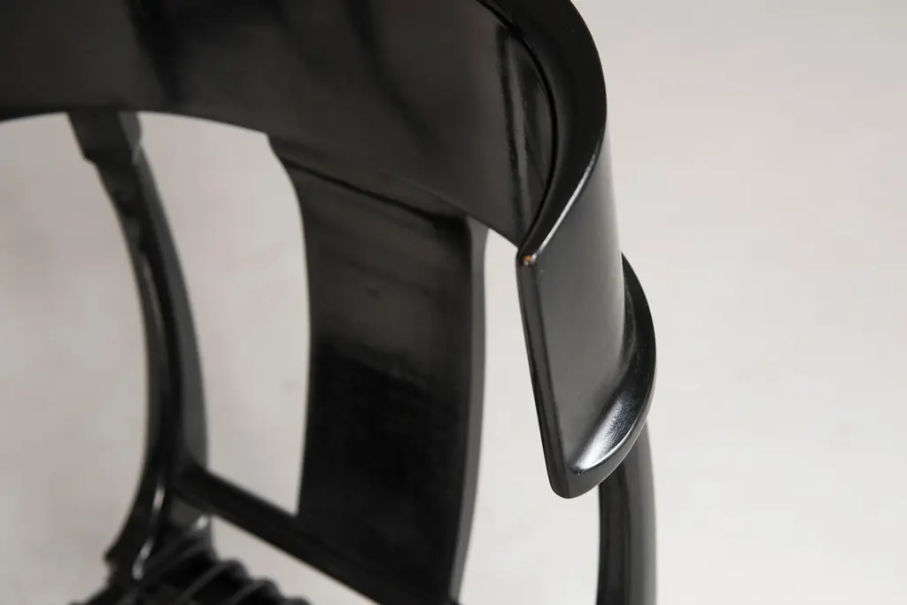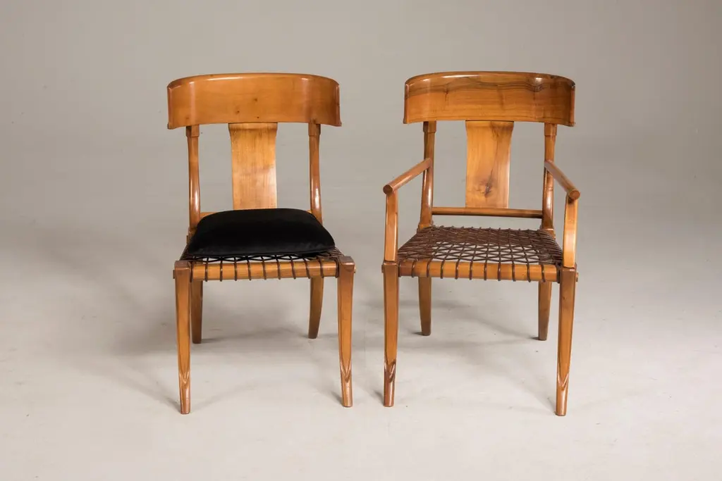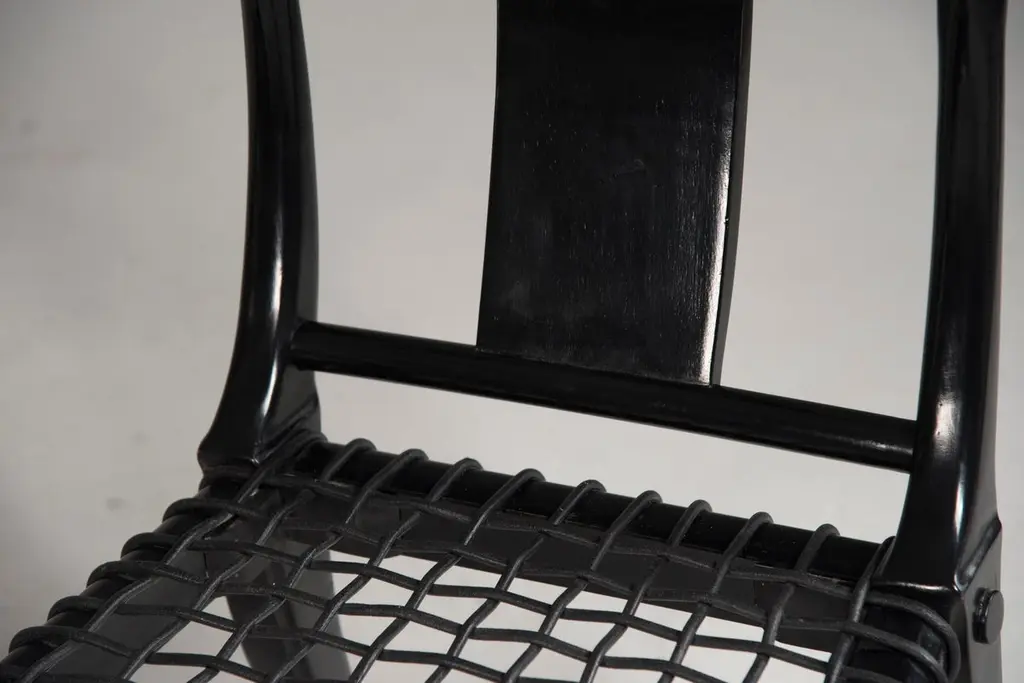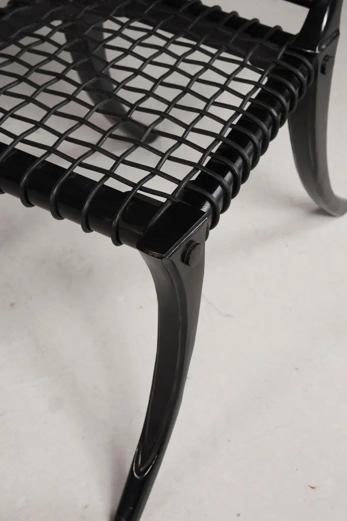 Klismos customizable dining chairs with saber legs, black lacquered wood and black woven leather seats. Available in other colors and upholstery. Italian artisanal production by Pescetta Home Decoration.Klismos are walnut wood chairs with deep and large seat and back wraparound feeling backrest. These chairs are made in Italy. They are realized according to the historical model named "Klismos" which is a type of ancient Greek chair, very often depicted on ancient furniture or on painted pottery and in bas-reliefs from the mid-5th century BCE onwards. The simple and elegant lines of the saber legs have been proposed and reconsidered several times during the history, making it a chair without age and never out of fashion. The long and elegant curve for the backrest is quite difficult to create and it is obtained from a single piece of wood.They are extremely comfortable and wraparound, the seat is large and deep allowing them to be suitable in a meeting room, as well in the dining room or used as desk chairs. You can complete the seat with a separate pillow (see the pictures as example).Price refers to chairs with following characteristics: Wood: Black lacquer, shiny finishing Upholstery: Black woven leather Possible customizations:Wood: Natural wood, black, shabby white, lacquer on request. Upholstery: Velvet, cotton, leather, eco leather. You can provide your own fabric.Upholstery seat: plain, capitonnè (with buttons), woven leather. Kind of seating: Chairs, armchairs, stools and benches are available. Dimensions:H of backrest 35.44 in. x legs max W 19.7 in. x legs max D 28.35 in. seat H 15.7"H of backrest 90 cm x legs max W 50 cm x legs max D 72 cm x seat H 40 cm. Lead time is around 20 business day depending on the customizations requested. A video of the item Is available upon request You can even arrange the pick up of the objects.