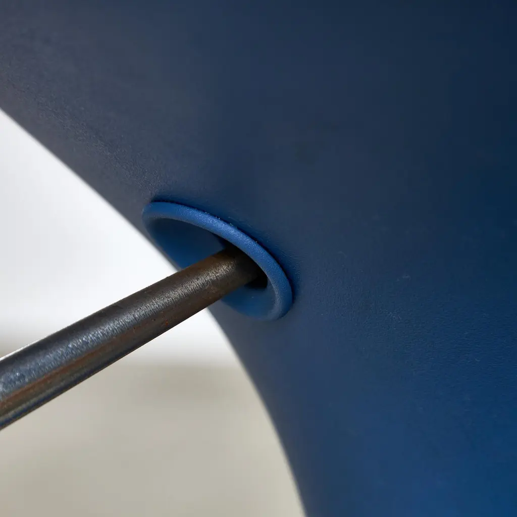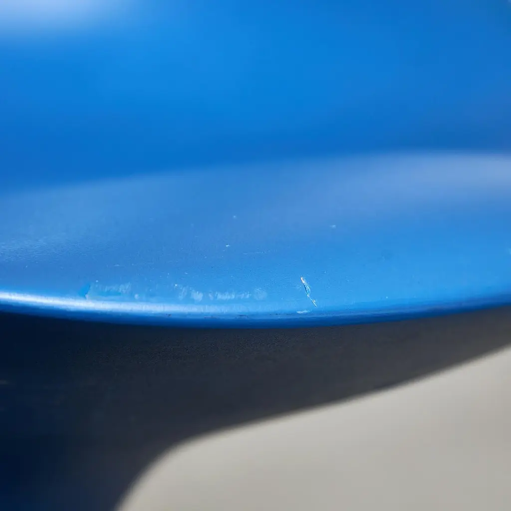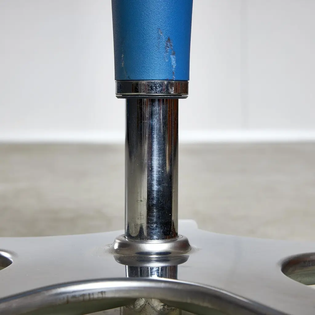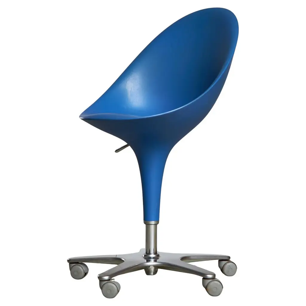 These adjustable swivel chairs from the Bombo collection by Stefano Giovannoni for Magis from the 1990s feature cupped seats made of durable ABS plastic. The chairs' height can be easily adjusted using a chrome handle located at the base of the seat, which is mounted on a brushed chromed steel circular base. These chairs are versatile and suitable for both home and office environments thanks to their flexible design and colour that uplifts any space. The blue shade brings energy to any setting, making them perfect for creating a vibrant ambiance. Available with minor signs of use and scratches.
