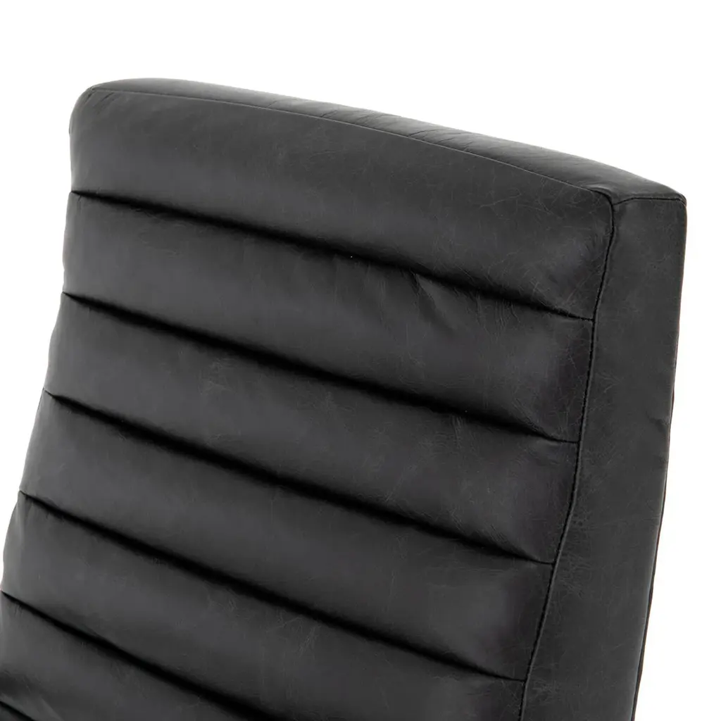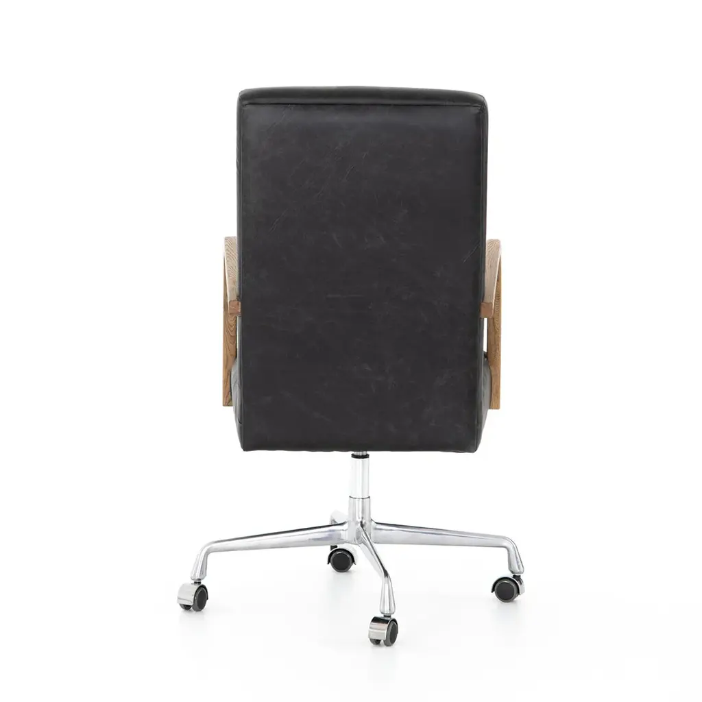 High style. Smoky black top-grain leather covers a channeled seat and back which seem to float between elegantly arched arms of toasted oak. Metal casters make for ease in the workplace. Height not adjustable. Ships In 10-14 Business Days 360 degree swivel base Top grain leather This image is for illustrative purposes only. The colors shown are accurate within the constraints of lighting, photography, and the color accuracy of your screen.