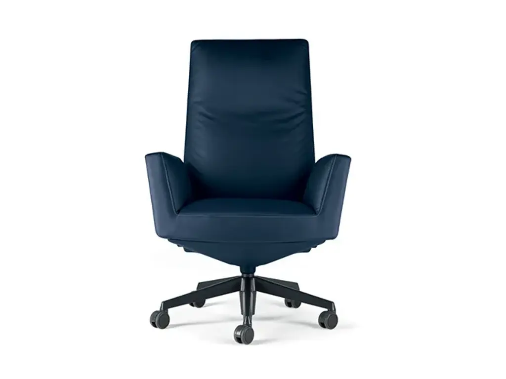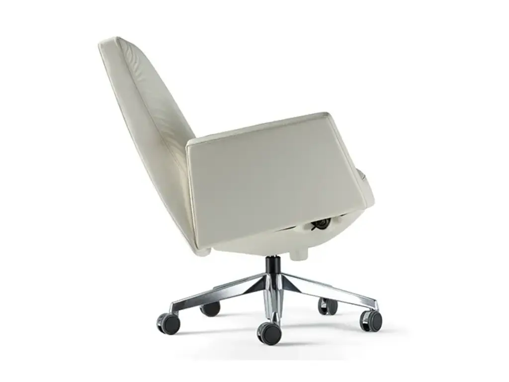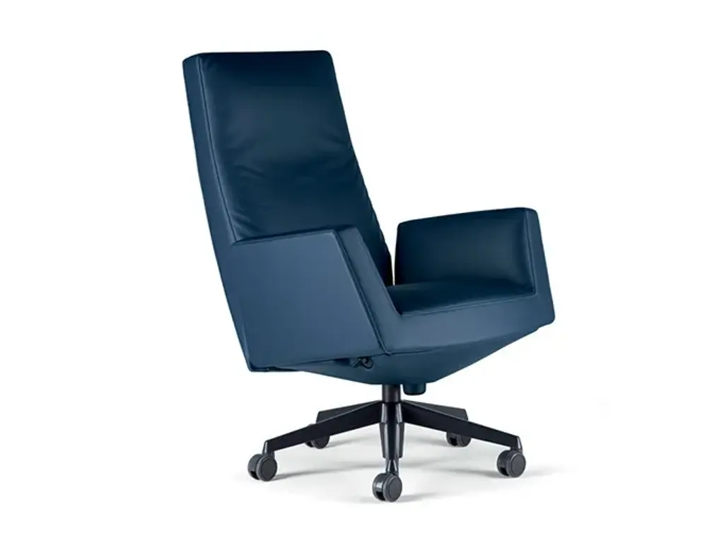 Chencellor is a recliner leather executive chair with 5-spoke base with castors by Poltrona Frau, design by Lievore Altherr Molina.The Chancellor President, Executive and Managerial versions are height-adjustable, swivel and the backrest and seat come with a sophisticated “Syncron” oscillation mechanism that allows the user to assume a continuous series of 5 positions ranging from a straight seat back to genuine chaise-longue.The Chancellor Visitor chair is equipped with a sophisticated swivel mechanism whose thrust bearing allows the chair to rotate and return to its original position. The base of the Chancellor chairs is in tubular steel, chrome-plated or with dark grey lacquer. The President, Executive and Managerial versions have a five-spoke base with soft automatic-braking castors or slides, while the Visitor chair has a four-spoke base with slides. The armrests are upholstered in leather and finished with terminal joints in polished aluminium or painted dark grey to match the base. The Pelle Frau® upholstery can also be extended to include the "Syncron" mechanism cover where applicable.The Chancellor Conference chair with sled base completes the family.Designers Lievore - Altherr - Molina have designed a seat collection with understated geometries and a strong visual presence in the workspace.In the Chancellor chairs, the armrests are a continuation of the seat and offer new scope for expression as well as improved levels of comfort and relaxation.The Chancellor chair is available in the President, Executive, Managerial, Meeting and Visitor models.A collection of sober, geometrical chairs with a strong scenic presence in the workplace. The arms that continue on from the seat provide a new expression and are designed to improve comfort levels and enhance relaxation time. The President, Executive and Managerial versions are height adjustable, rotate and are fitted with a sophisticated 'Syncron' turning mechanism for the seat and backrest, that gives the seat 5 different positions, ranging from an erect sitting position and transforming it graduallyinto a chaise-longue. Chancellor Visitor is fitted with an automatic return rotation mechanism provided by a resistant bearing, which allows the armchair to rotate and return to its original position. Completes the range the new armchair with sled base, the Chancellor Conference. The fixed height tubular steel resting base is available in a polished chrome plate or in a dark grey finish with plastic feet. Arms are upholstered in leather and finished with ends attached to the structure in a polished aluminum or dark grey finish to match the base. Upholstery is in Pelle Frau® leather from the Color System and it can also be axtended to the protecting covering of the "Syncron" movement, where applicable.
