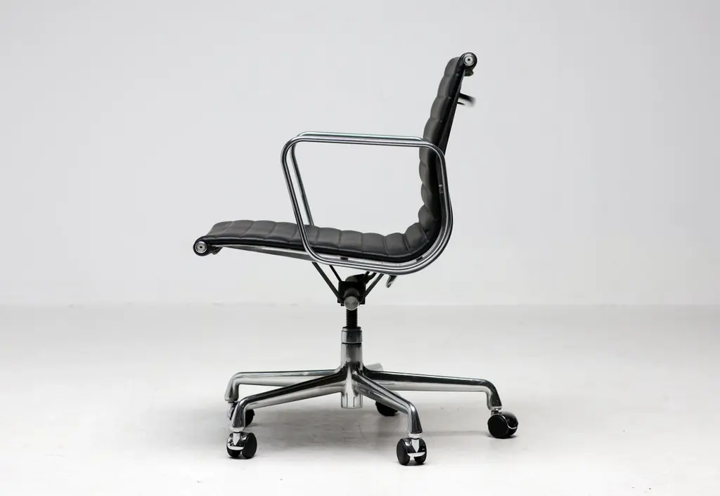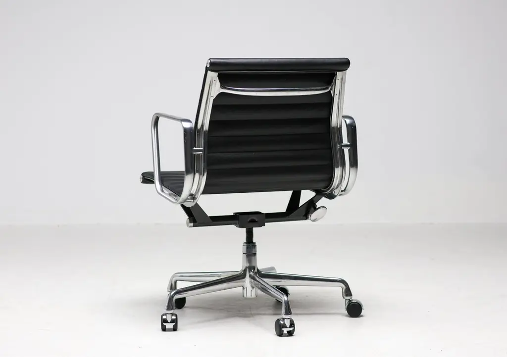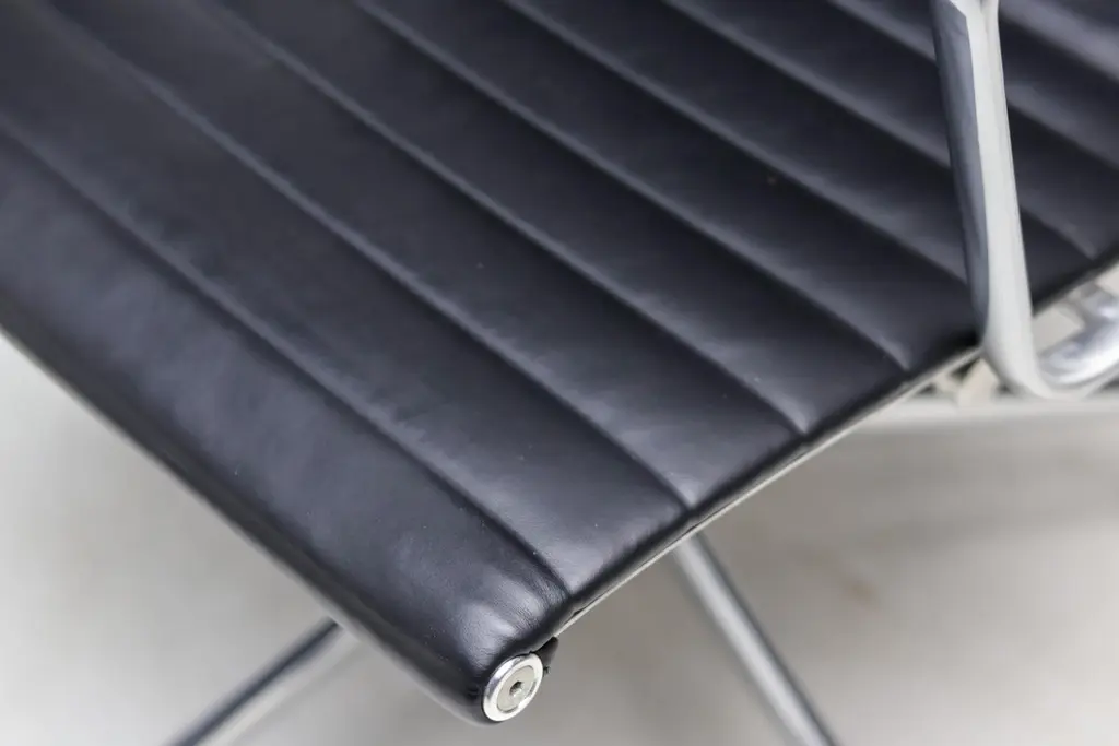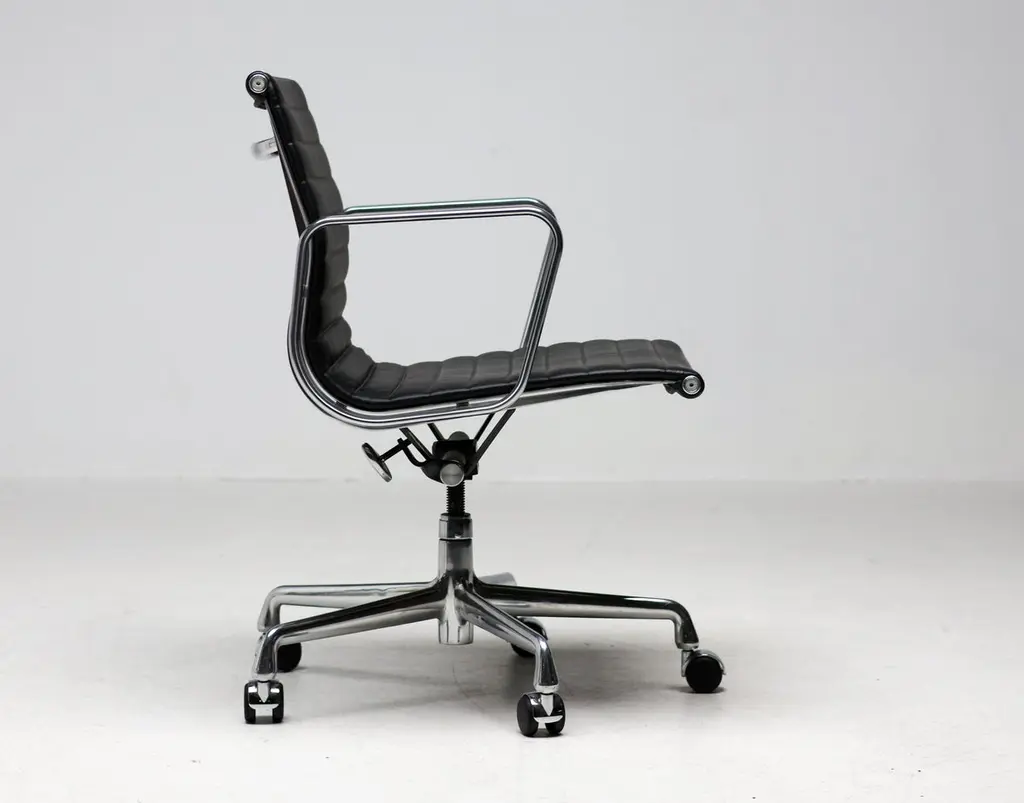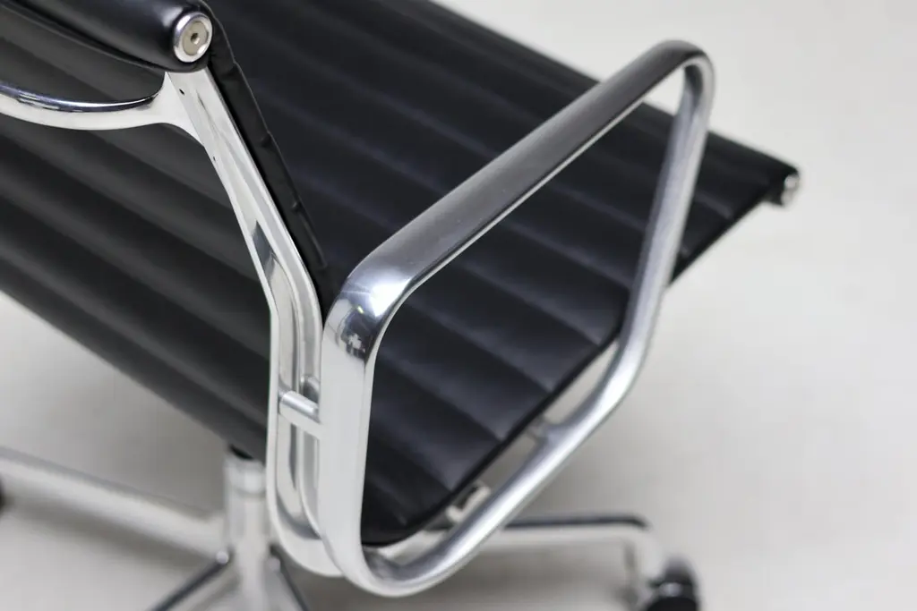 Executive office chair, model EA117, in the USA known as EA335, designed by Charles and Ray Eames for Herman Miller. Backrest and seat in black leather, both front and rear. Frame, armrests and five-star base in die-cast aluminium. Seat mechanism with adjustable backward tilt. Continuous seat height adjustment. Signed with manufacturer's label. These chairs were ordered new by a real estate agent in Amsterdam in 2007 for their meeting room. They were very sparingly used and are in excellent condition. Unique opportunity to order the original Herman Miller version of this iconic design in Europe.Priced individually, we have a total of 3 chairs available.Charles and Ray Eames married in 1941 and moved to Los Angeles, where together they began experimenting with techniques for the three-dimensional moulding of plywood. The aim was to create comfortable chairs that were affordable. However, the war interrupted their work, and Charles and Ray turned instead to the design and development of leg splints made of plywood, which were manufactured in large quantities for the US Navy. In 1946, they exhibited their experimental furniture designs at MoMA. The Herman Miller Company in Zeeland, Michigan, subsequently began to produce Eames furniture. Charles and Ray participated in the 1948 'Low-Cost Furniture' competition at MoMA, and they built the Eames House in 1949 as their own private residence. In addition to their work in furniture design and architecture, they also regularly turned their hand to graphic design, photography, film and exhibition design.