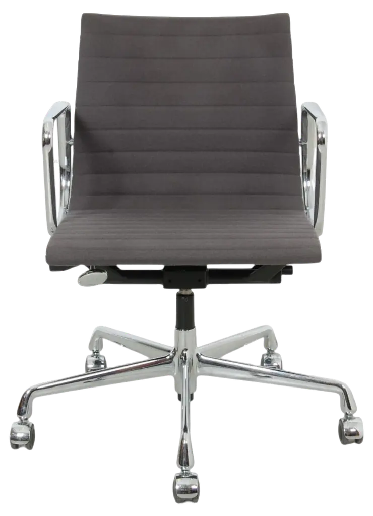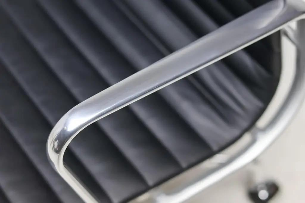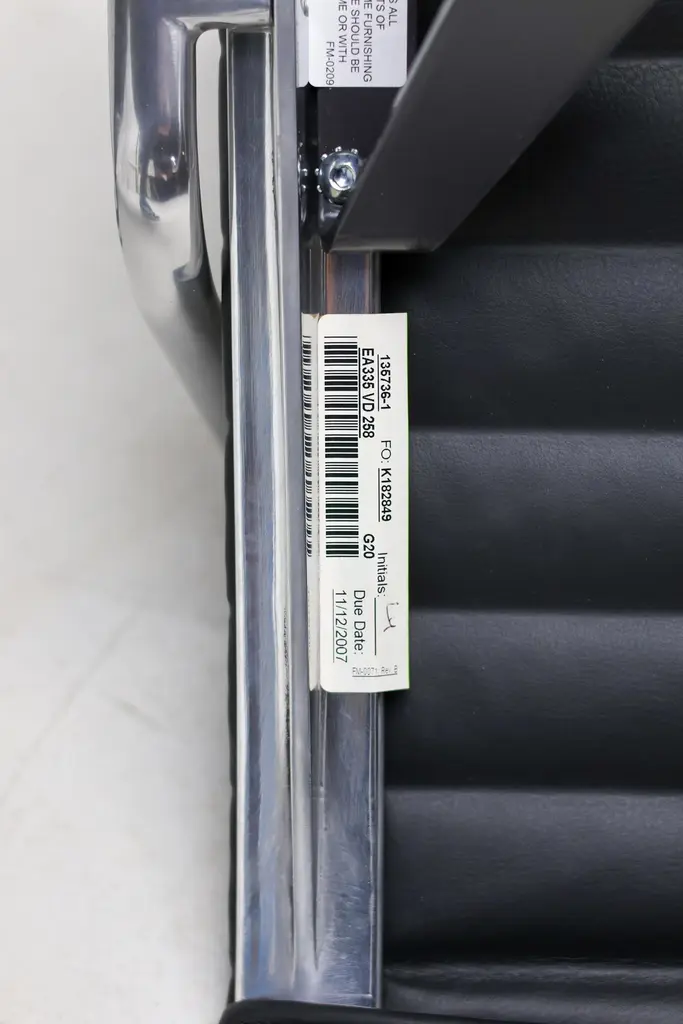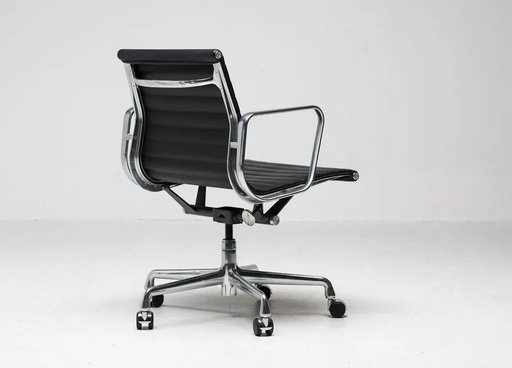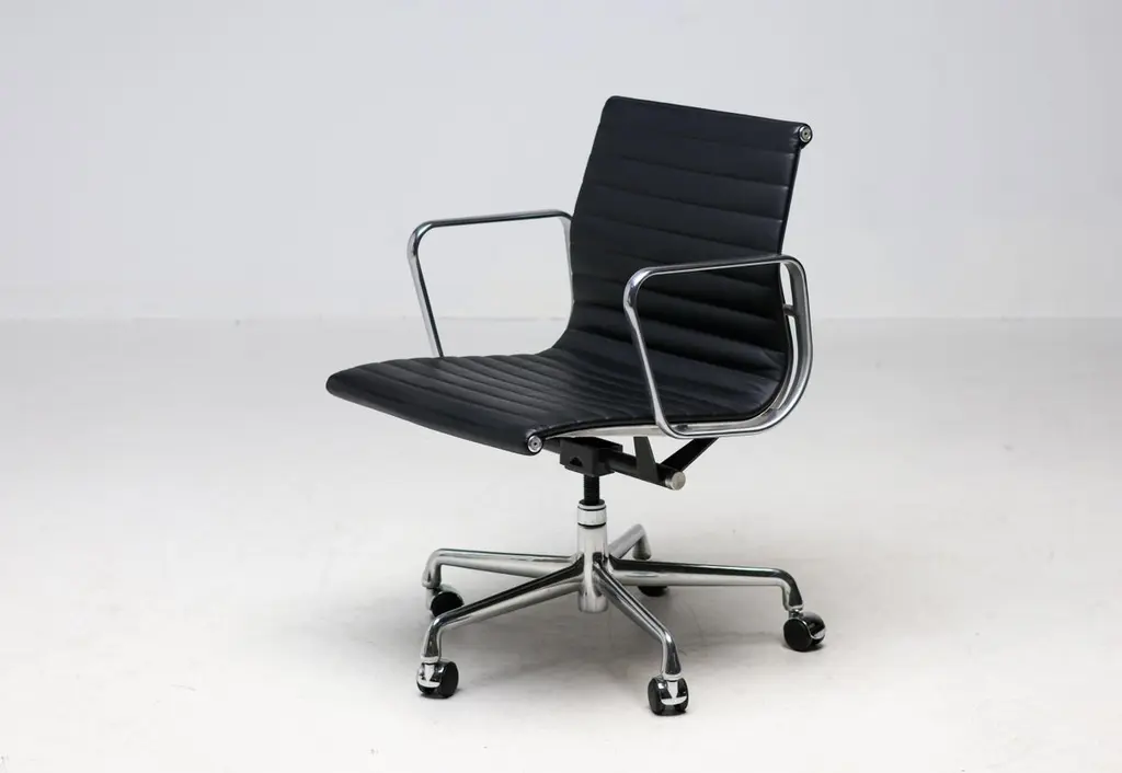 Executive office chair, model EA117, in the USA known as EA335, designed by Charles and Ray Eames for Herman Miller. Backrest and seat in black leather, both front and rear. Frame, armrests and five-star base in die-cast aluminium. Seat mechanism with adjustable backward tilt. Continuous seat height adjustment. Signed with manufacturer's label. These chairs were ordered new by a real estate agent in Amsterdam in 2007 for their meeting room. They were very sparingly used and are in excellent condition. Unique opportunity to order the original Herman Miller version of this iconic design in Europe.Priced individually, we have a total of 3 chairs available.Charles and Ray Eames married in 1941 and moved to Los Angeles, where together they began experimenting with techniques for the three-dimensional moulding of plywood. The aim was to create comfortable chairs that were affordable. However, the war interrupted their work, and Charles and Ray turned instead to the design and development of leg splints made of plywood, which were manufactured in large quantities for the US Navy. In 1946, they exhibited their experimental furniture designs at MoMA. The Herman Miller Company in Zeeland, Michigan, subsequently began to produce Eames furniture. Charles and Ray participated in the 1948 'Low-Cost Furniture' competition at MoMA, and they built the Eames House in 1949 as their own private residence. In addition to their work in furniture design and architecture, they also regularly turned their hand to graphic design, photography, film and exhibition design.