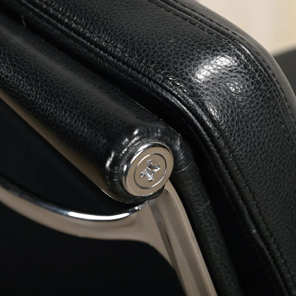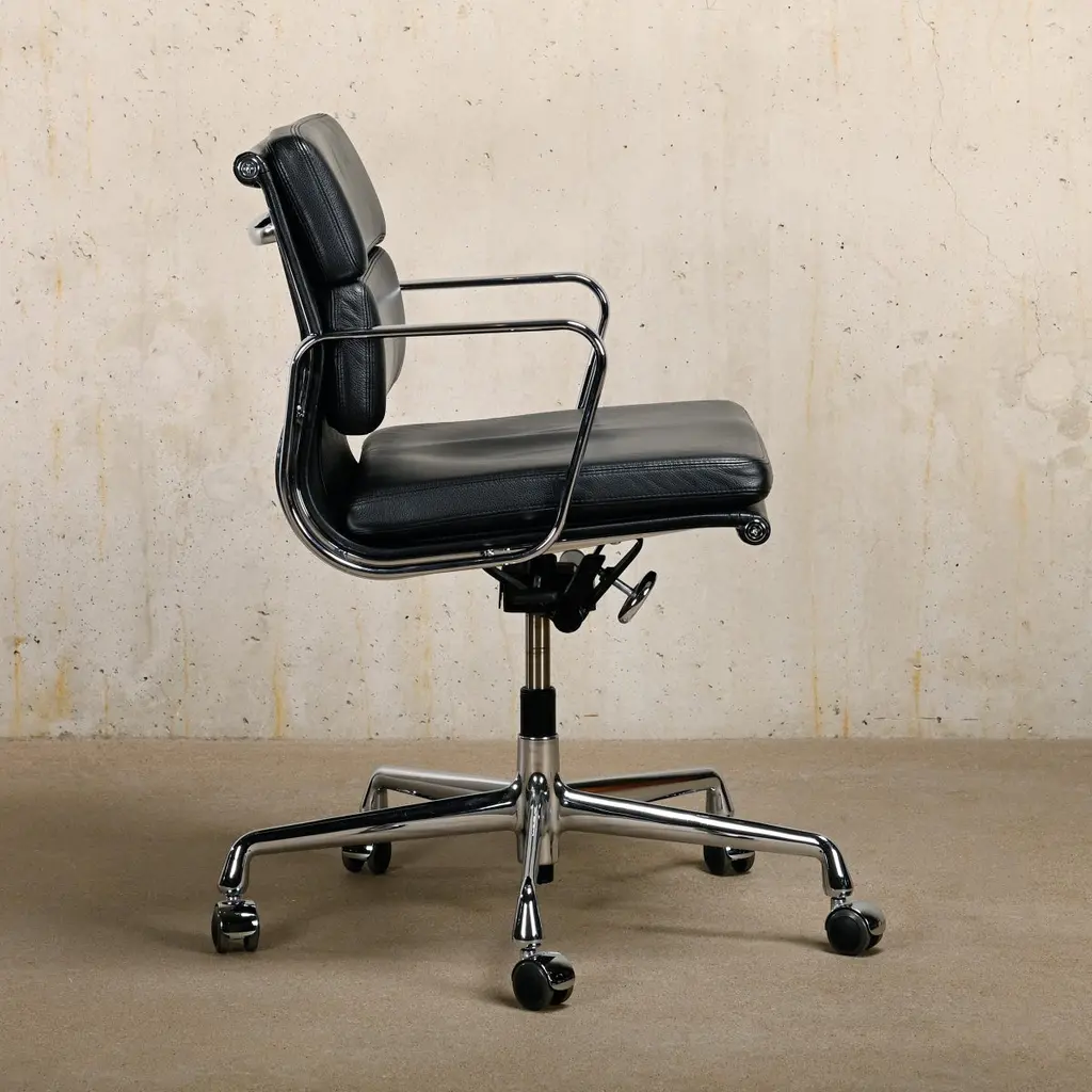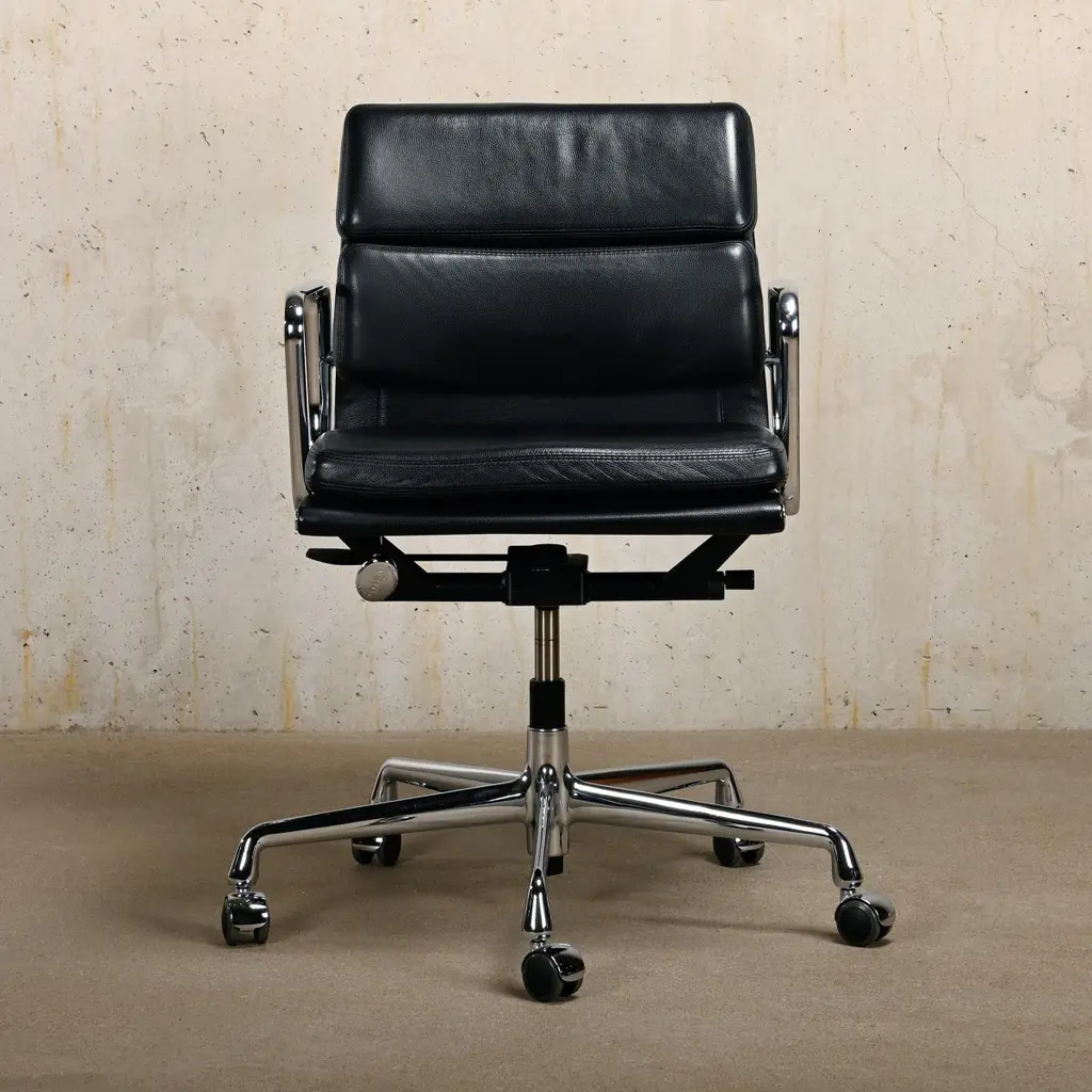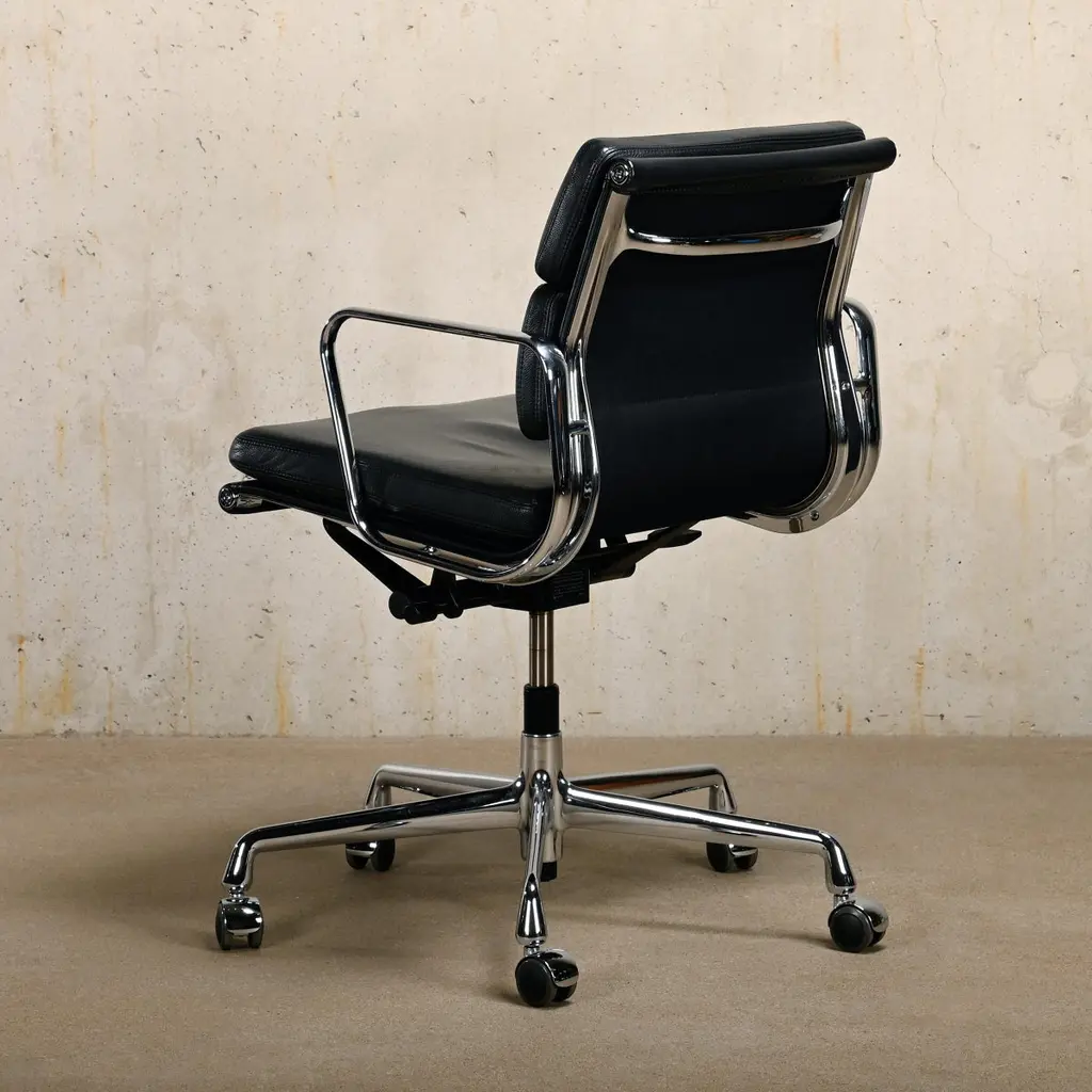 Beautiful office chair EA217 belonging to the iconic Aluminium Series designed by Charles & Ray Eames for Herman Miller (US) / Vitra (EU). Exceptional comfort is guaranteed with the cushions in soft leather, height adjustment and tilt/swivel mechanism, which can be adjusted to the user''s weight. Chrome plated aluminium frame and hight quality leather seat in the colour Nero (black). Very good / excellent original condition with minimal traces of use. Signed with manufacture label. Multiple chairs available.