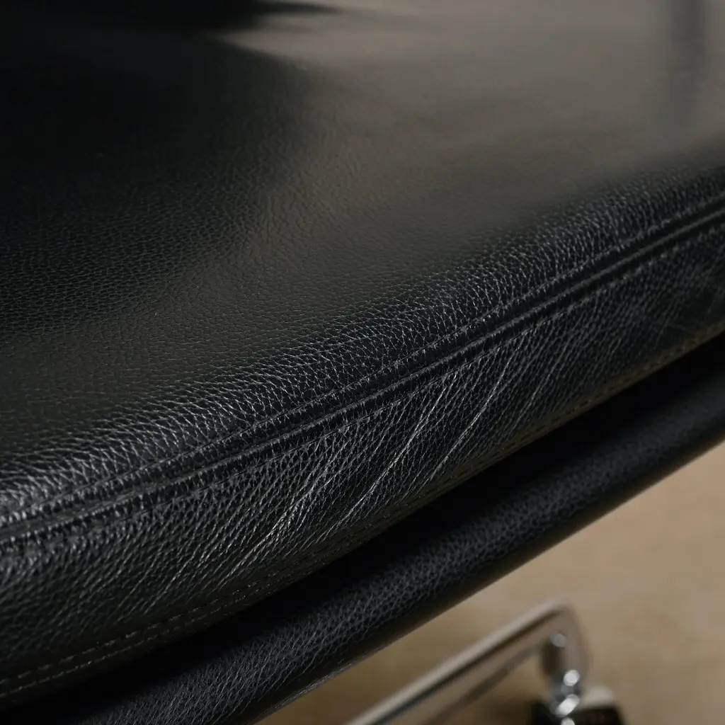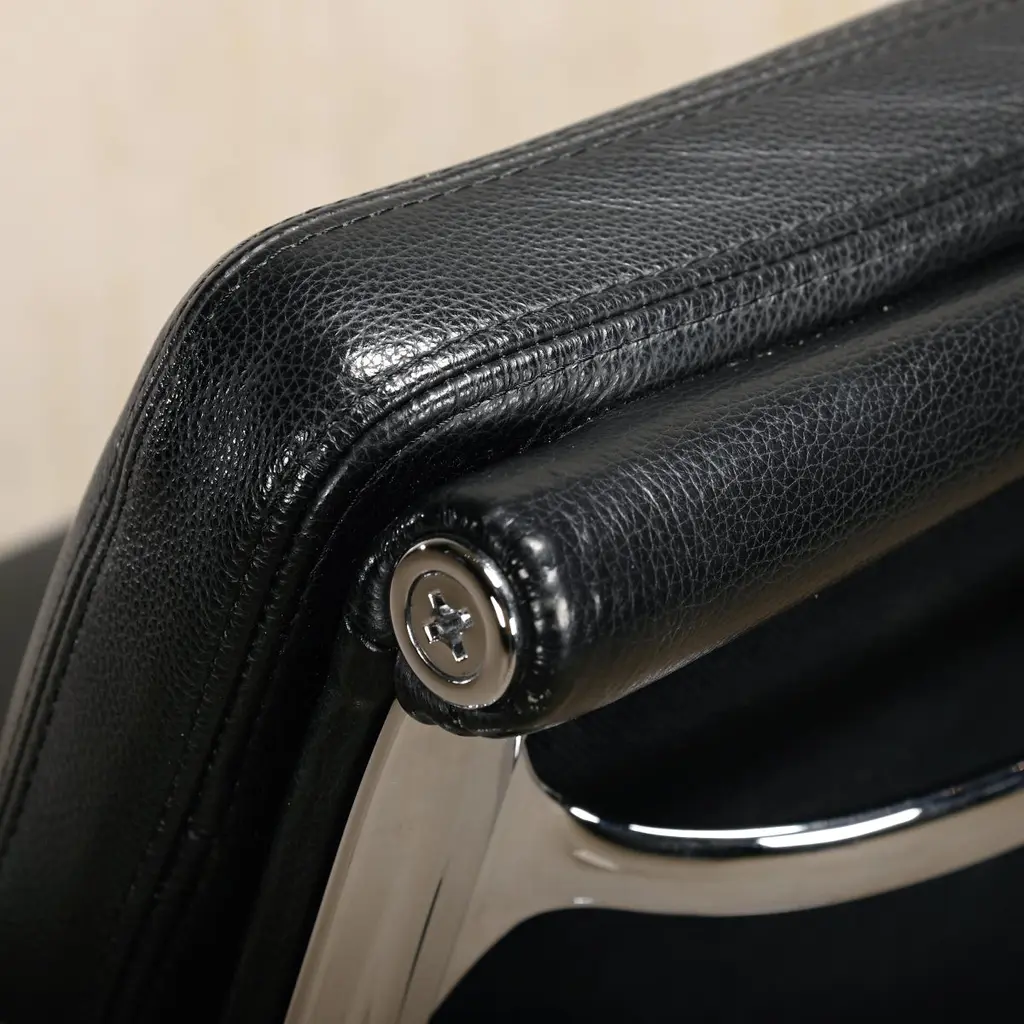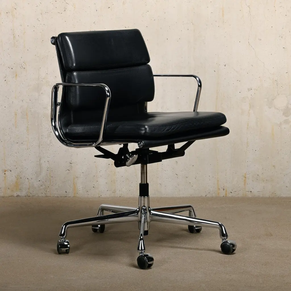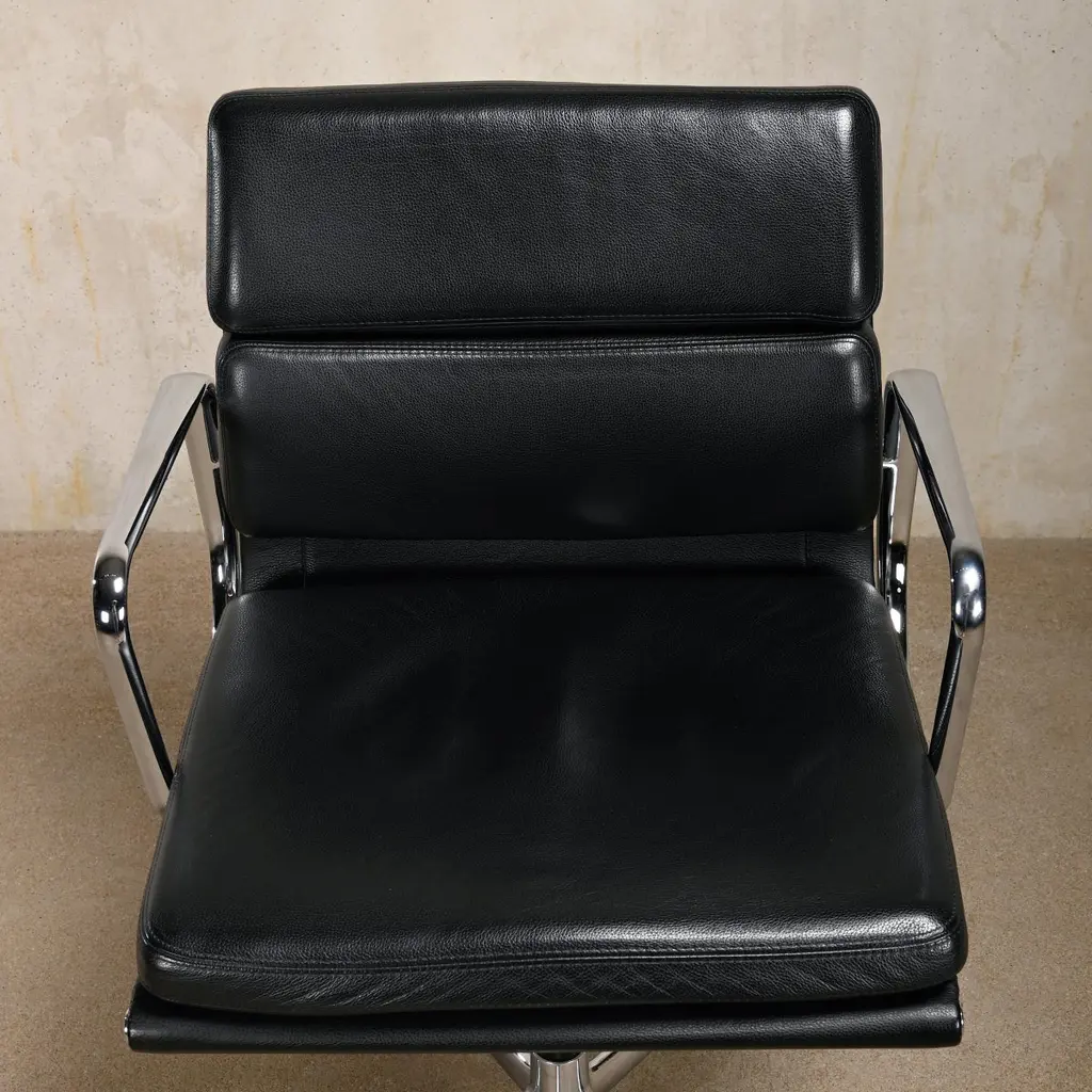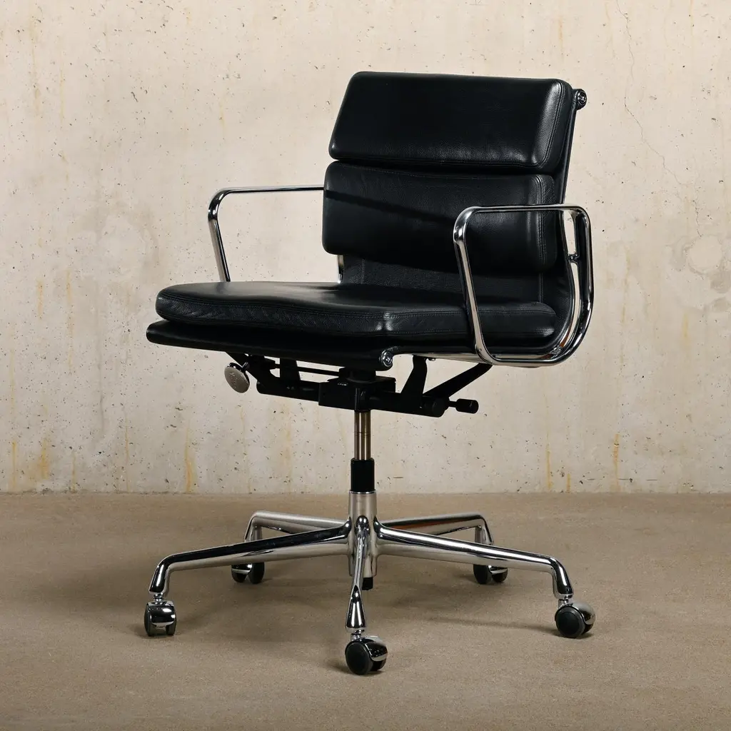 Beautiful office chair EA217 belonging to the iconic Aluminium Series designed by Charles & Ray Eames for Herman Miller (US) / Vitra (EU). Exceptional comfort is guaranteed with the cushions in soft leather, height adjustment and tilt/swivel mechanism, which can be adjusted to the user''s weight. Chrome plated aluminium frame and hight quality leather seat in the colour Nero (black). Very good / excellent original condition with minimal traces of use. Signed with manufacture label. Multiple chairs available.