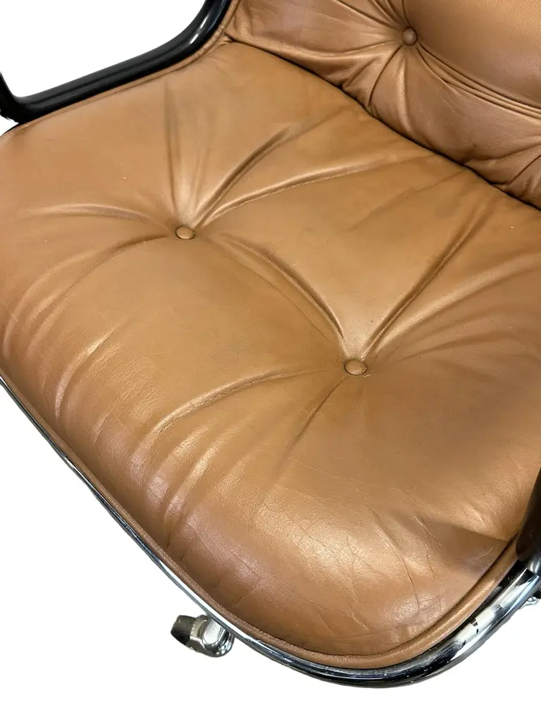 Vintage Charles Pollock for Knoll leather executive chair redone in medium brown color. This executive desk chair has a swivel base with adjustable height. Swivel base with all wheels in working condition.