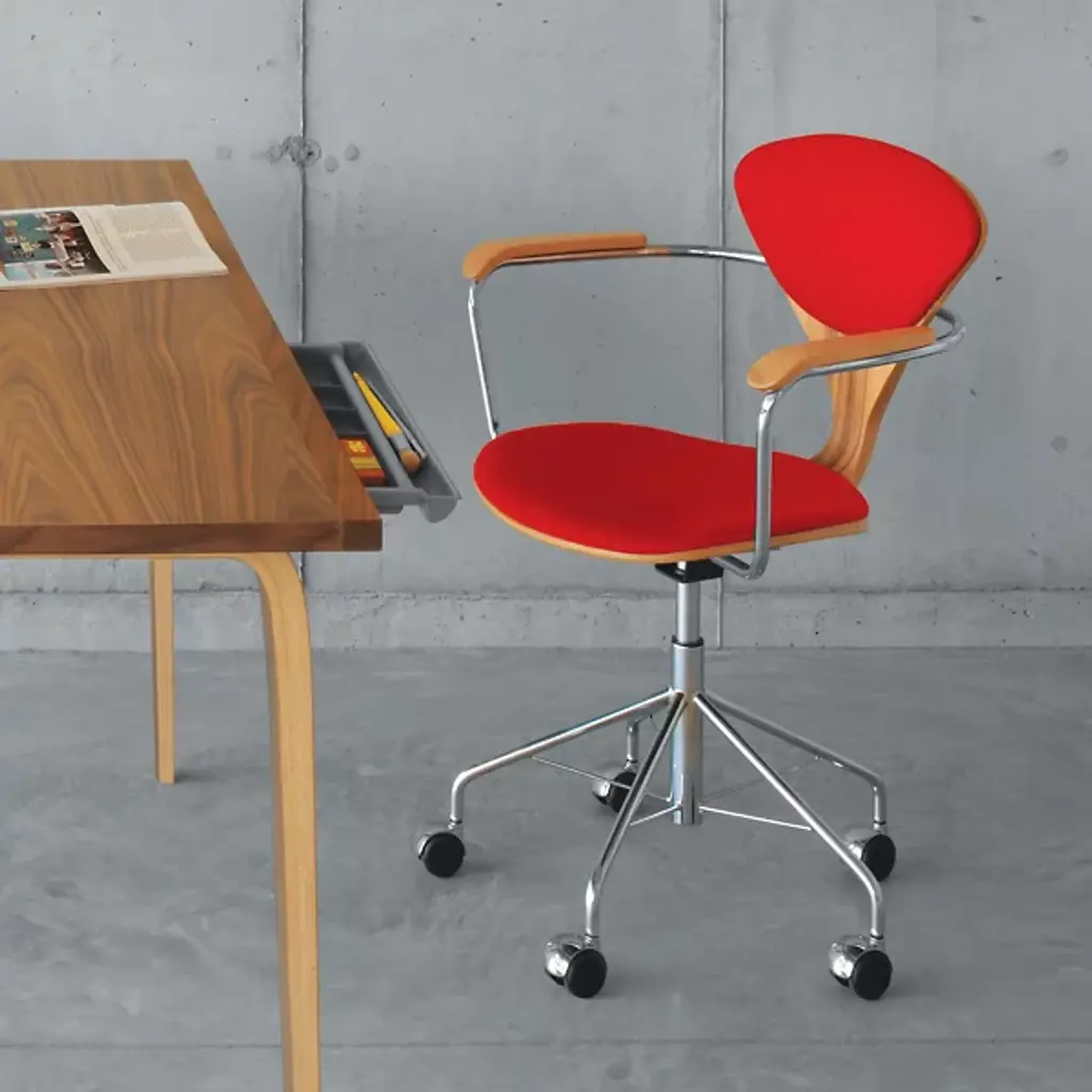 Thinking of spicing up your modern workspace? The Cherner Seat and Back Upholstered Task Armchair by Cherner Chair Company adds plenty of zing with its classic Cherner Chair silhouette. This durable desk chair puts together a molded plywood shell, steel arms with matched wood armrests and a steel base with chic casters. Minimal look and design make this upholstered chair, an excellent choice for a modern-day work environment. It yields remarkable color consistency and fewer VOCs, with the help of a completely water-based veneer finishing system.