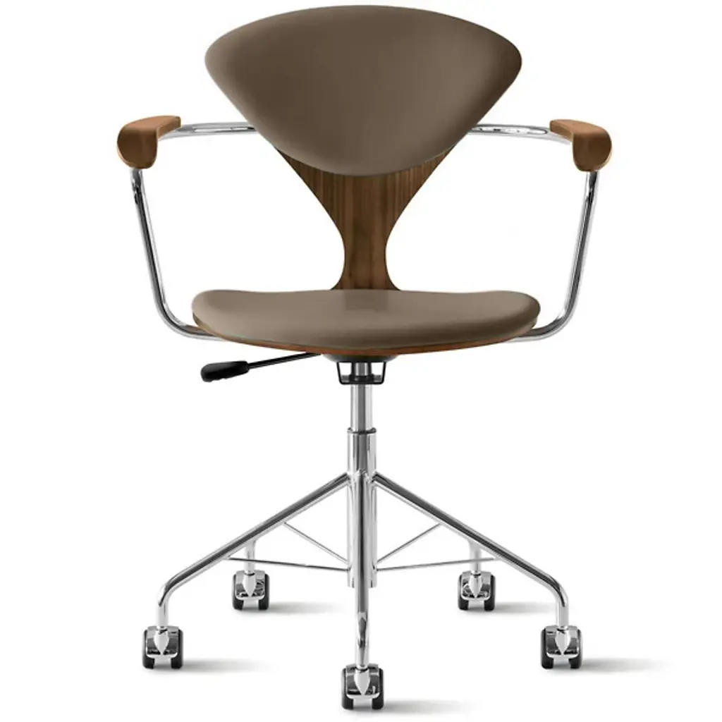 Thinking of spicing up your modern workspace? The Cherner Seat and Back Upholstered Task Armchair by Cherner Chair Company adds plenty of zing with its classic Cherner Chair silhouette. This durable desk chair puts together a molded plywood shell, steel arms with matched wood armrests and a steel base with chic casters. Minimal look and design make this upholstered chair, an excellent choice for a modern-day work environment. It yields remarkable color consistency and fewer VOCs, with the help of a completely water-based veneer finishing system.