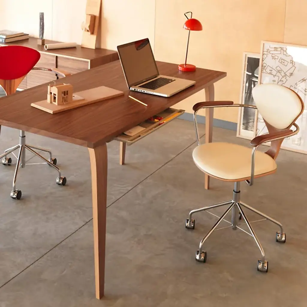 Thinking of spicing up your modern workspace? The Cherner Seat and Back Upholstered Task Armchair by Cherner Chair Company adds plenty of zing with its classic Cherner Chair silhouette. This durable desk chair puts together a molded plywood shell, steel arms with matched wood armrests and a steel base with chic casters. Minimal look and design make this upholstered chair, an excellent choice for a modern-day work environment. It yields remarkable color consistency and fewer VOCs, with the help of a completely water-based veneer finishing system.