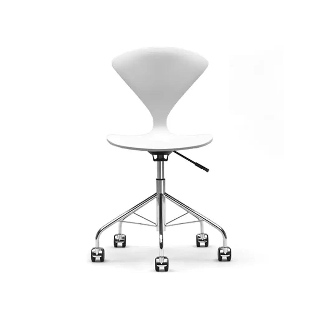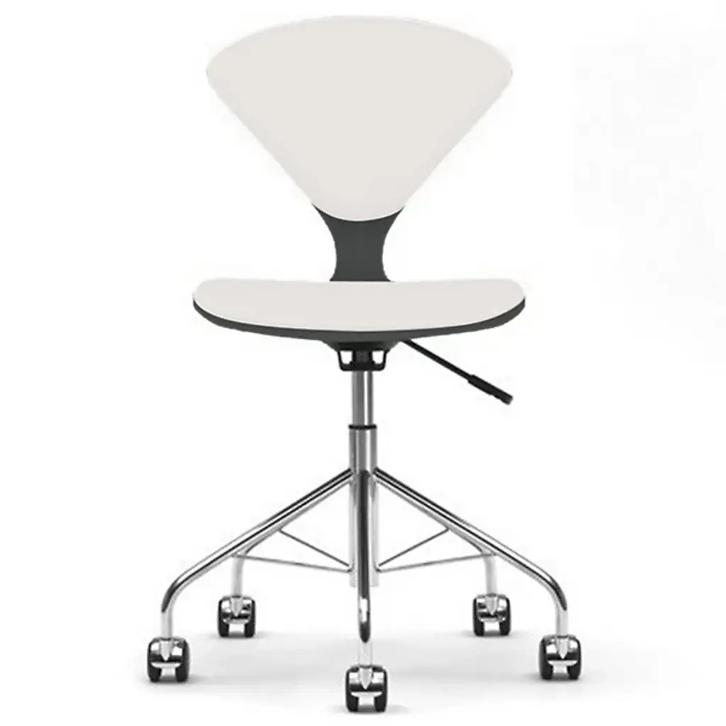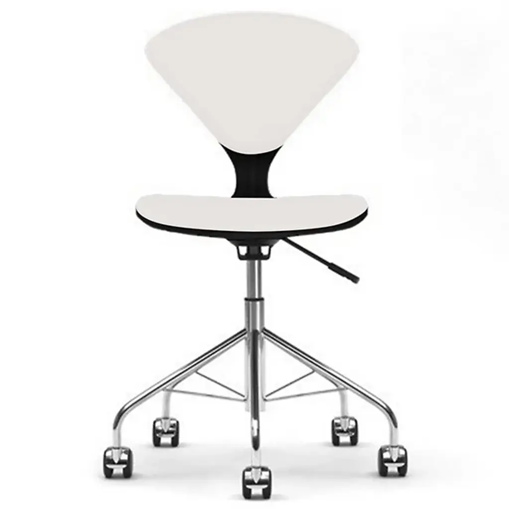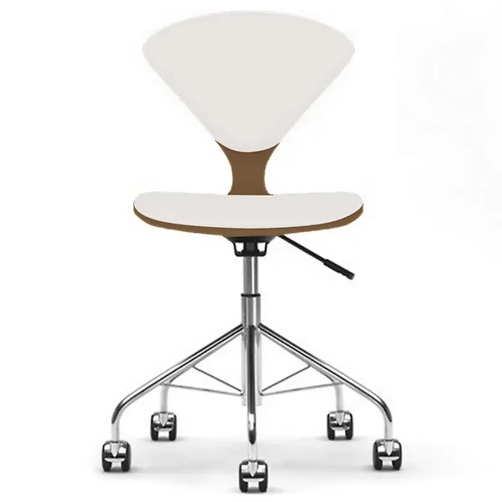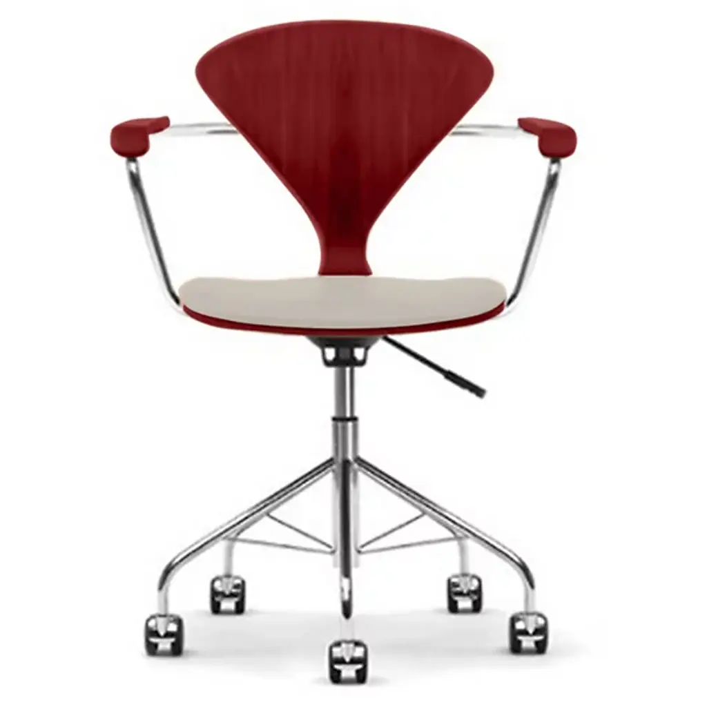 Glide through your workplace with elegance and ease. The Cherner Seat and Back Upholstered Task Chair by Cherner Chair Company keeps you comfortable all through the day. This upholstered desk chair is created by fabricating a molded plywood shell and a strong steel base with rolling casters. Mid-century modern furniture with minimal design, this task chair lasts for a long time, and its lightweight construction makes it easy to move around. It uses a completely water-based veneer finishing system, resulting in high color consistency and fewer VOCs.