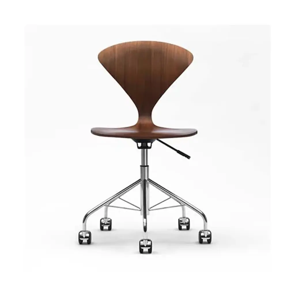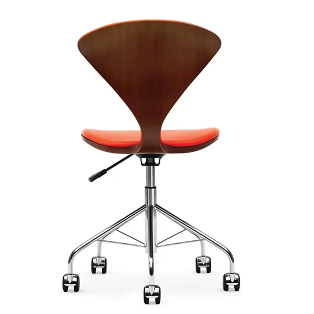 Glide through your workplace with elegance and ease. The Cherner Seat and Back Upholstered Task Chair by Cherner Chair Company keeps you comfortable all through the day. This upholstered desk chair is created by fabricating a molded plywood shell and a strong steel base with rolling casters. Mid-century modern furniture with minimal design, this task chair lasts for a long time, and its lightweight construction makes it easy to move around. It uses a completely water-based veneer finishing system, resulting in high color consistency and fewer VOCs.