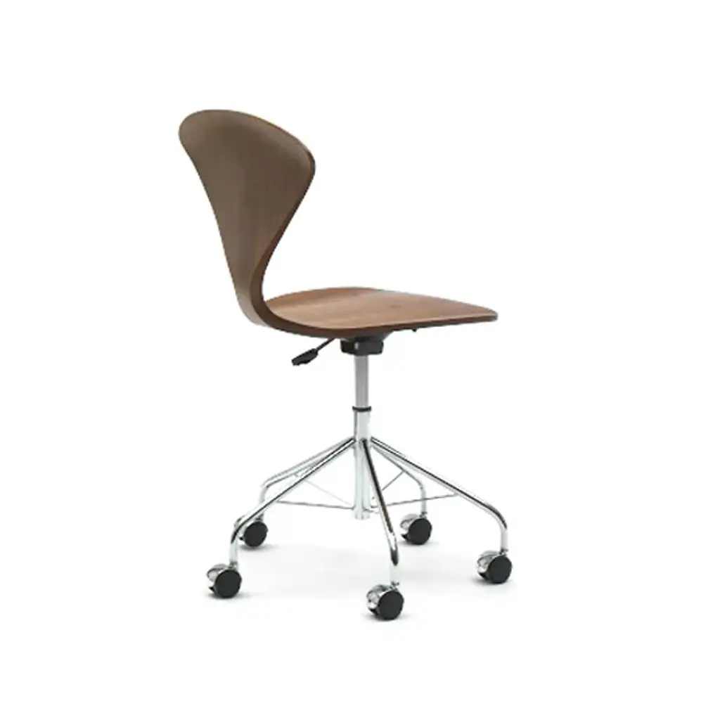 Glide through your workplace with elegance and ease. The Cherner Seat and Back Upholstered Task Chair by Cherner Chair Company keeps you comfortable all through the day. This upholstered desk chair is created by fabricating a molded plywood shell and a strong steel base with rolling casters. Mid-century modern furniture with minimal design, this task chair lasts for a long time, and its lightweight construction makes it easy to move around. It uses a completely water-based veneer finishing system, resulting in high color consistency and fewer VOCs.