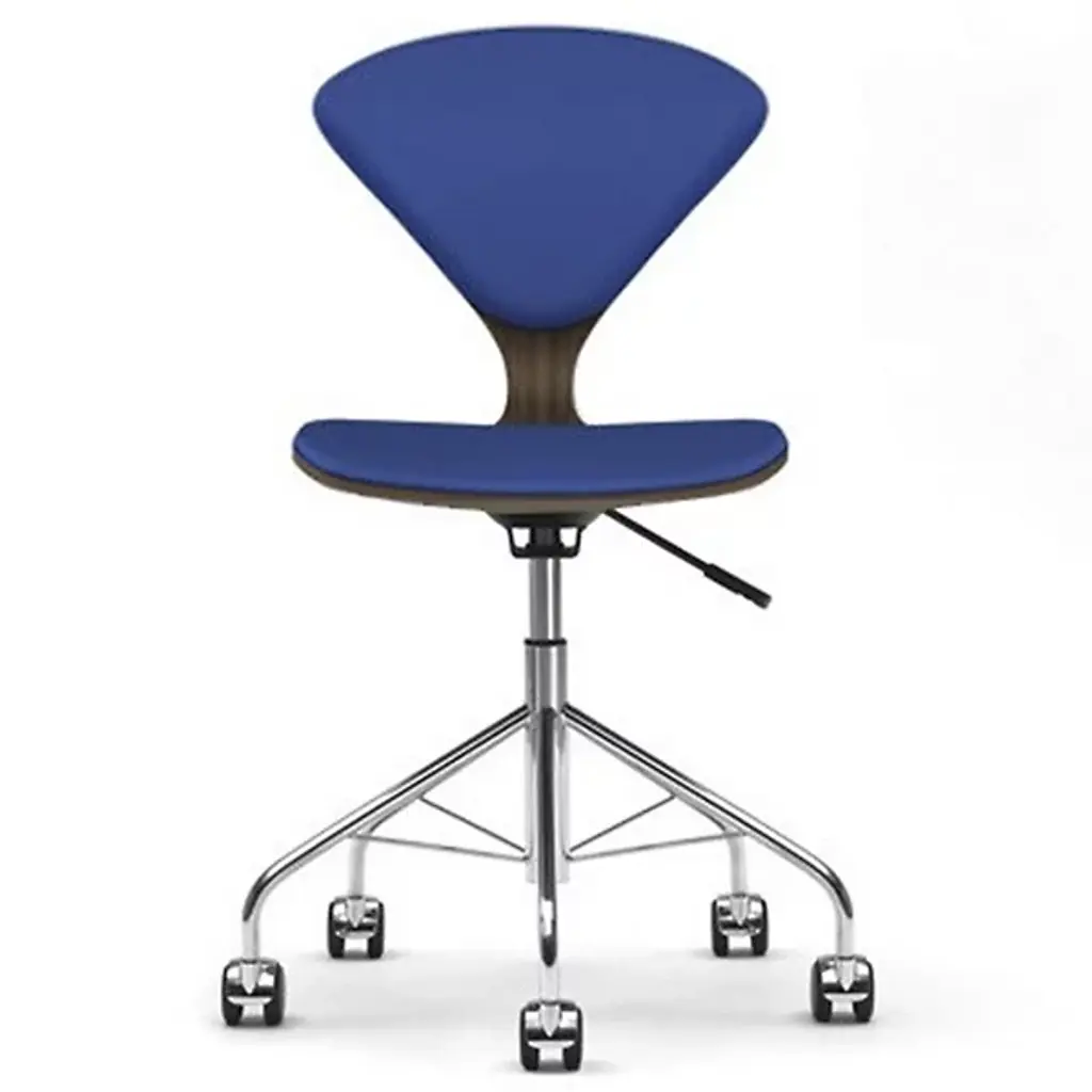 Glide through your workplace with elegance and ease. The Cherner Seat and Back Upholstered Task Chair by Cherner Chair Company keeps you comfortable all through the day. This upholstered desk chair is created by fabricating a molded plywood shell and a strong steel base with rolling casters. Mid-century modern furniture with minimal design, this task chair lasts for a long time, and its lightweight construction makes it easy to move around. It uses a completely water-based veneer finishing system, resulting in high color consistency and fewer VOCs.