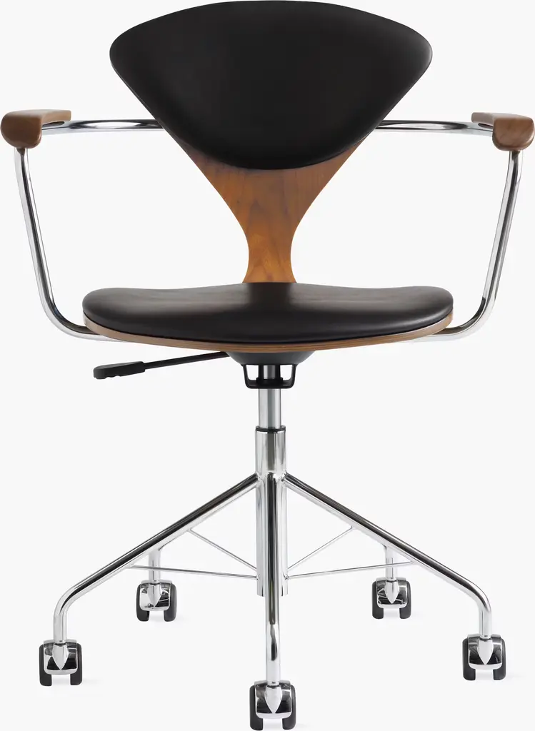 Constructed of laminated wood of graduating thicknesses, from 5 ply at the seat edge to 15 ply at the slender waist, the Cherner Task Chair possesses exceptional structural strength and dramatic sculptural beauty. This chair is an evolution of the Cherner Chair (1958), produced by Norman Cherner's sons from their father's sketches. Lightweight and hardworking, it has steel arms, walnut armrests, and a seat upholstered in exquisite leather. This authentic Cherner Chair is made by Cherner Chair Company.