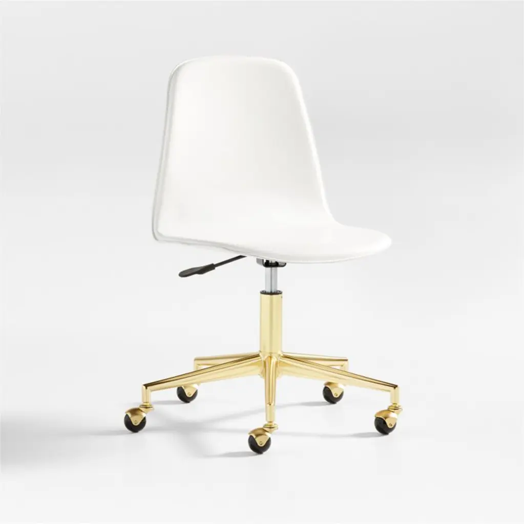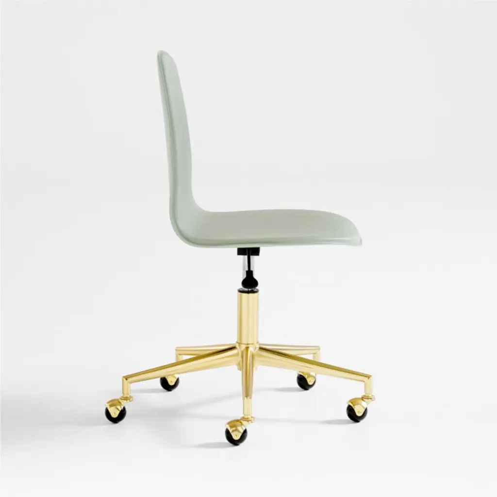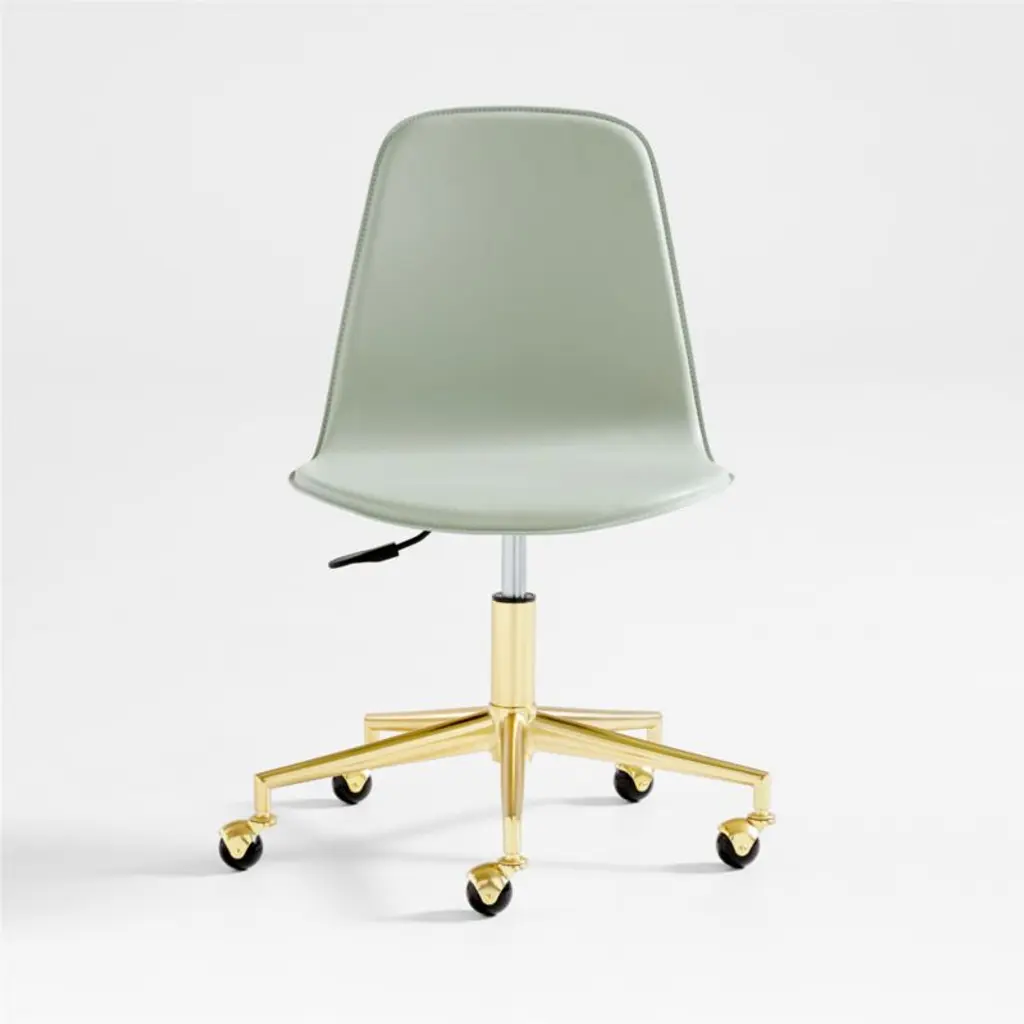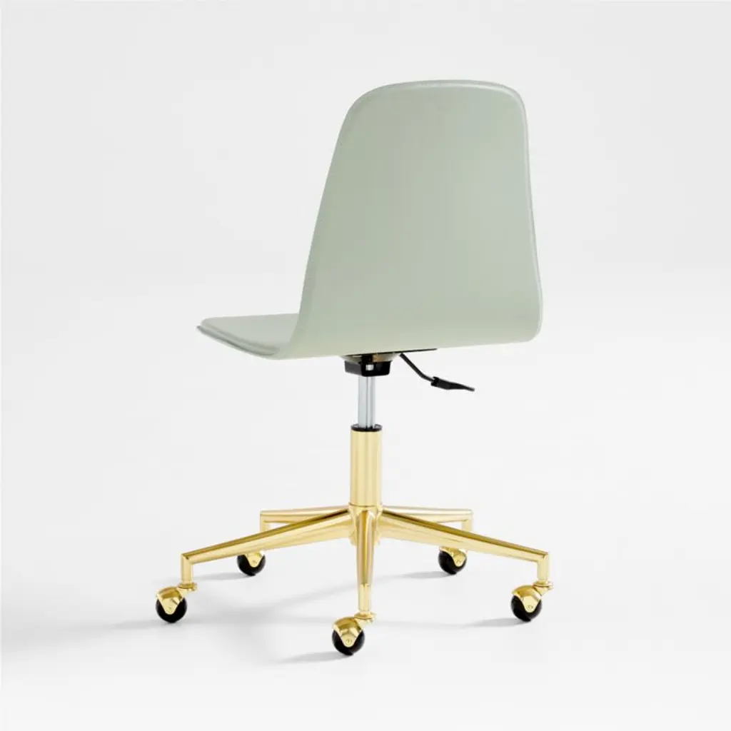 Our seamless, modern take on the classic desk chair, this supportive design lets the good times roll. Beauty meets functionality with a sleek, curved silhouette and 5-leg metal base in a shiny gold finish. The padded sage green seat swivels 360 degrees for easy maneuvering. Designed to grow with kids, this chair also adjusts up and down, and rolling caster wheels travel smoothly over wood, carpet or area rug.