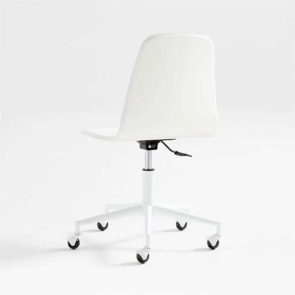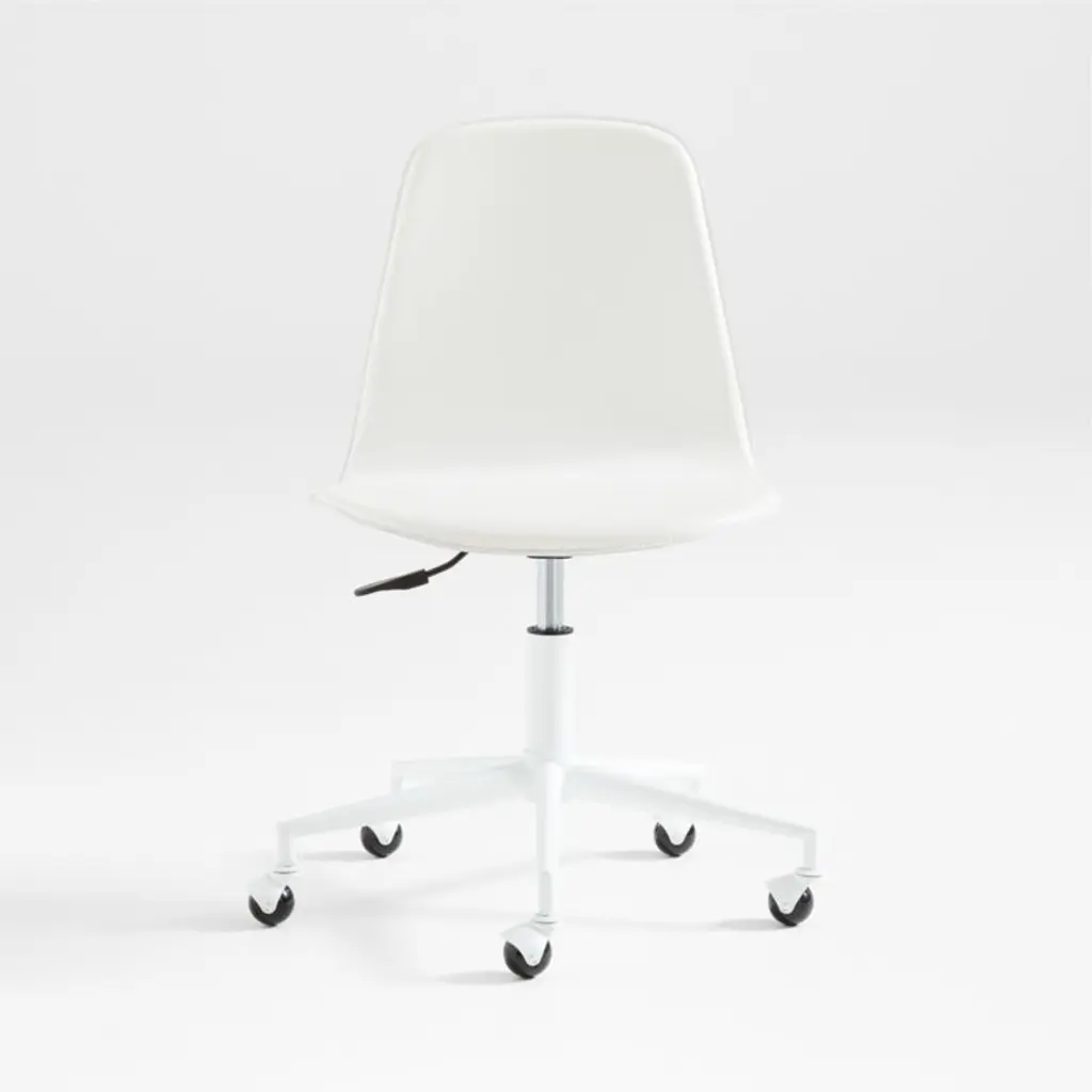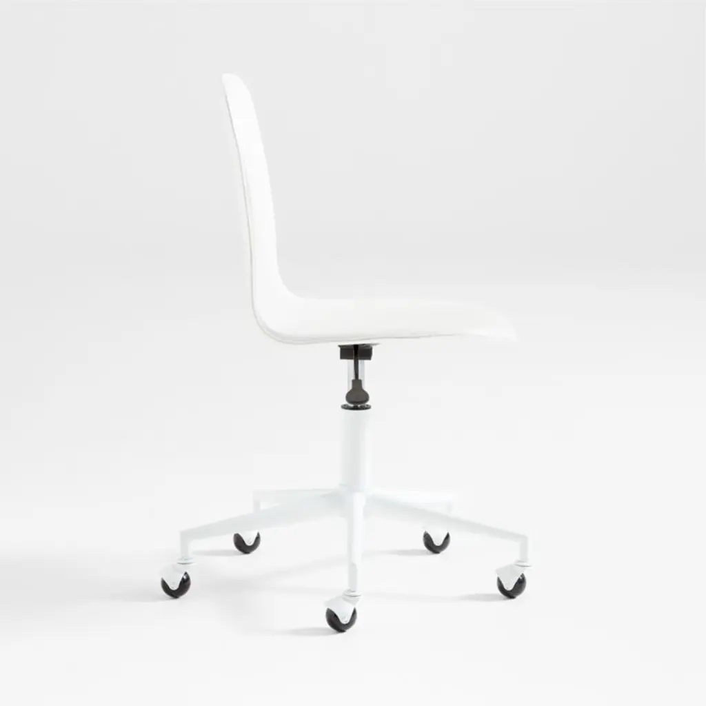 Our seamless, modern take on the classic desk chair, this supportive design lets the good times roll. Beauty meets functionality with a sleek, curved silhouette and 5-leg metal base in a bright white finish. The padded white seat swivels 360 degrees for easy maneuvering. Designed to grow with kids, this chair also adjusts up and down, and rolling caster wheels travel smoothly over wood, carpet or area rug.