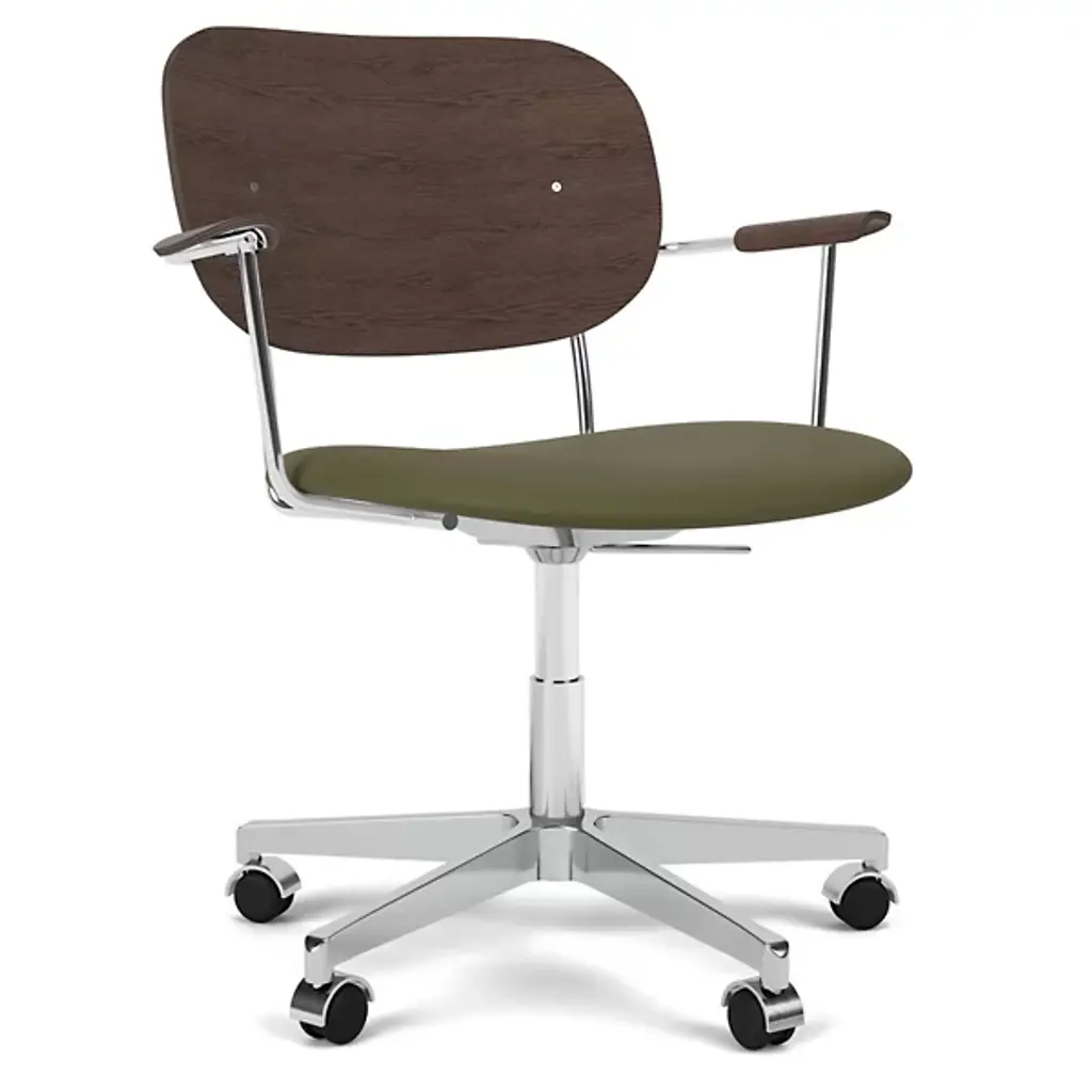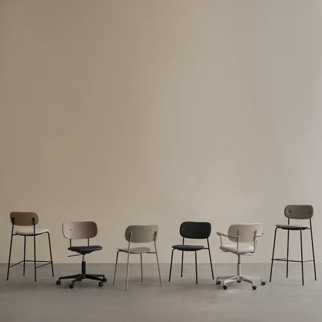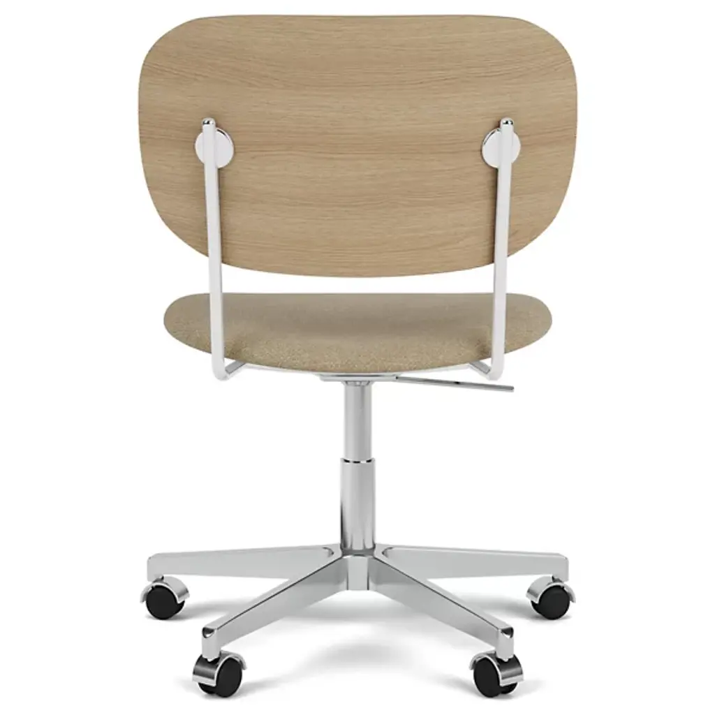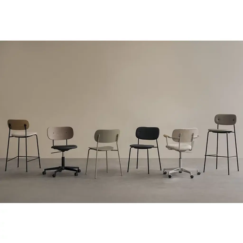 The Co Task Chair, Upholstered Seat from Audo Copenhagen helps you stay on track. It is designed by Norm Architects and Els van Hoorebeeck, who artfully blend contemporary and Scandinavian styles. This task chair caster wheels so you can move effortlessly. It is composed of oak for durability and a natural look. Height adjustability and flex tilt capability allow you to customize your seating experience. Your task chair is foam-filled for comfort and is enhanced by aluminum and steel.