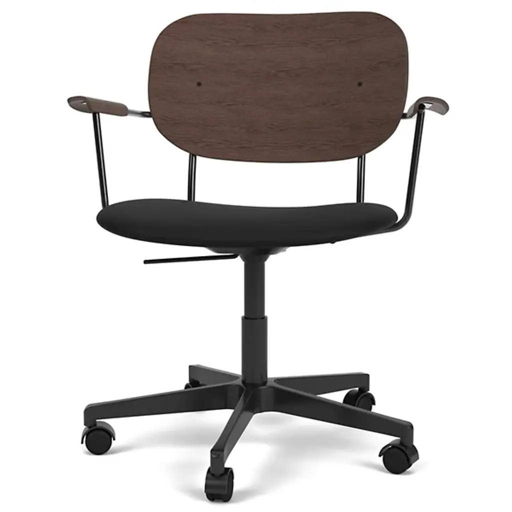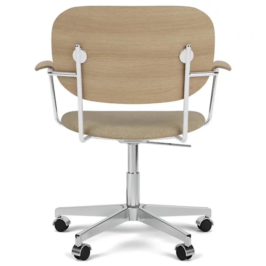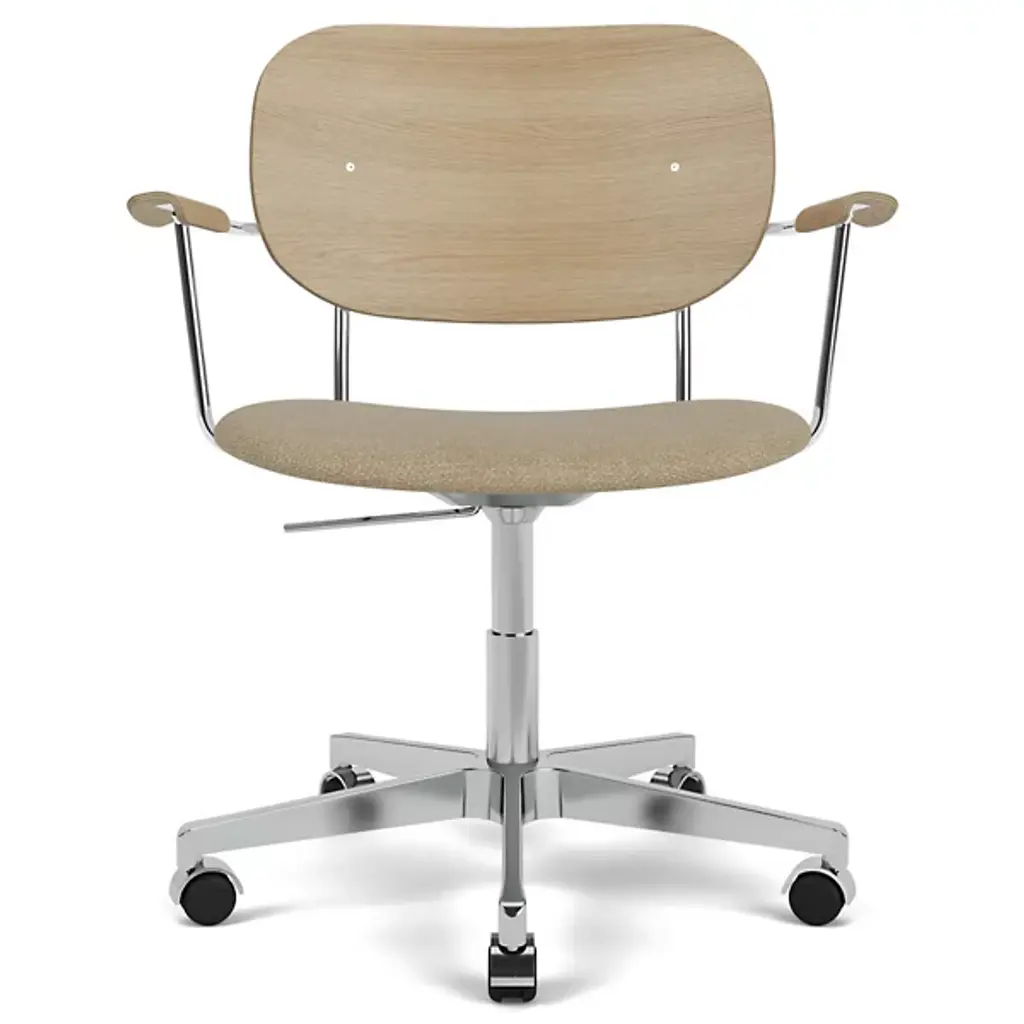 The Co Task Chair w/Armrest, Upholstered Seat from Audo Copenhagen is designed by Norm Architects and Els van Hoorebeeck. It is composed of plywood and oak. This finely upholstered seating solution boasts caster wheels for easy mobility. It is filled with foam for maximum comfort. A steel and aluminum frame adds a contemporary touch and durability. It includes an armrest for your convenience and exudes a Scandinavian sense of style. Flex tilt capability and height adjustability offer customization.