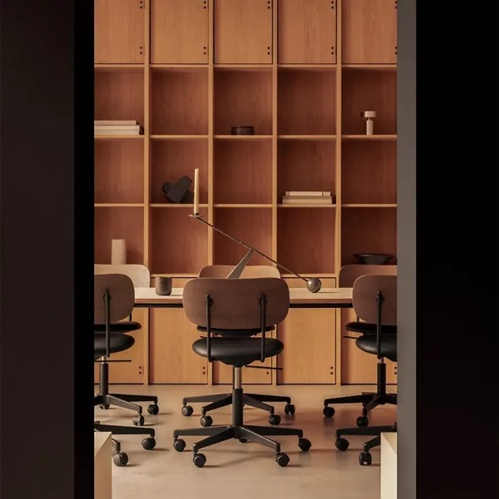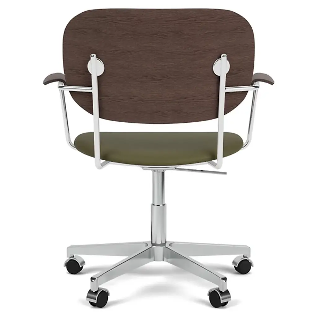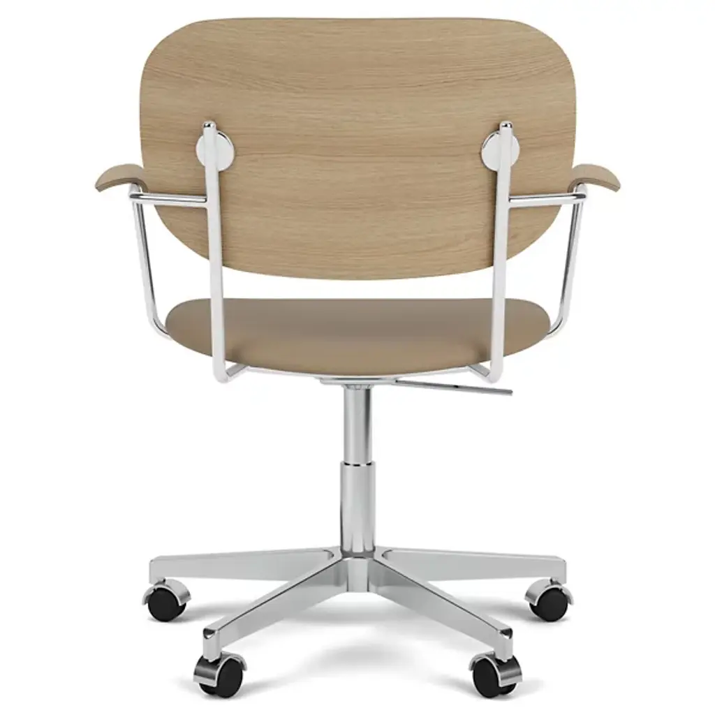 The Co Task Chair w/Armrest, Upholstered Seat from Audo Copenhagen is designed by Norm Architects and Els van Hoorebeeck. It is composed of plywood and oak. This finely upholstered seating solution boasts caster wheels for easy mobility. It is filled with foam for maximum comfort. A steel and aluminum frame adds a contemporary touch and durability. It includes an armrest for your convenience and exudes a Scandinavian sense of style. Flex tilt capability and height adjustability offer customization.