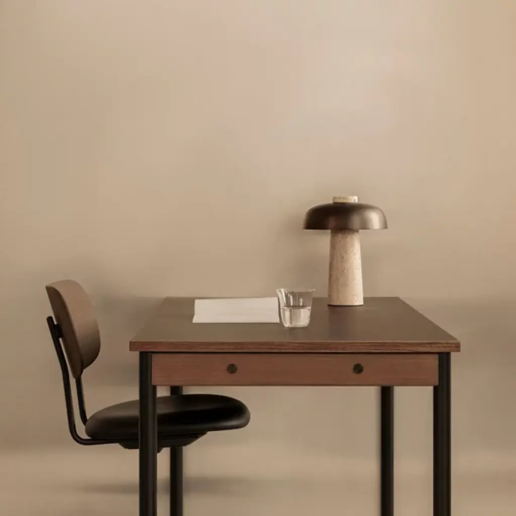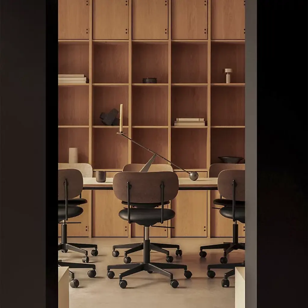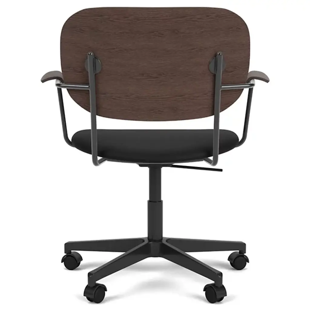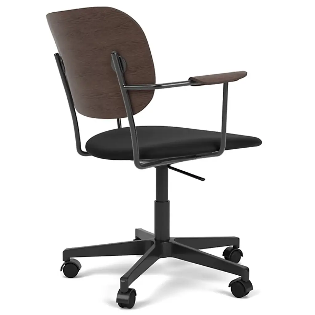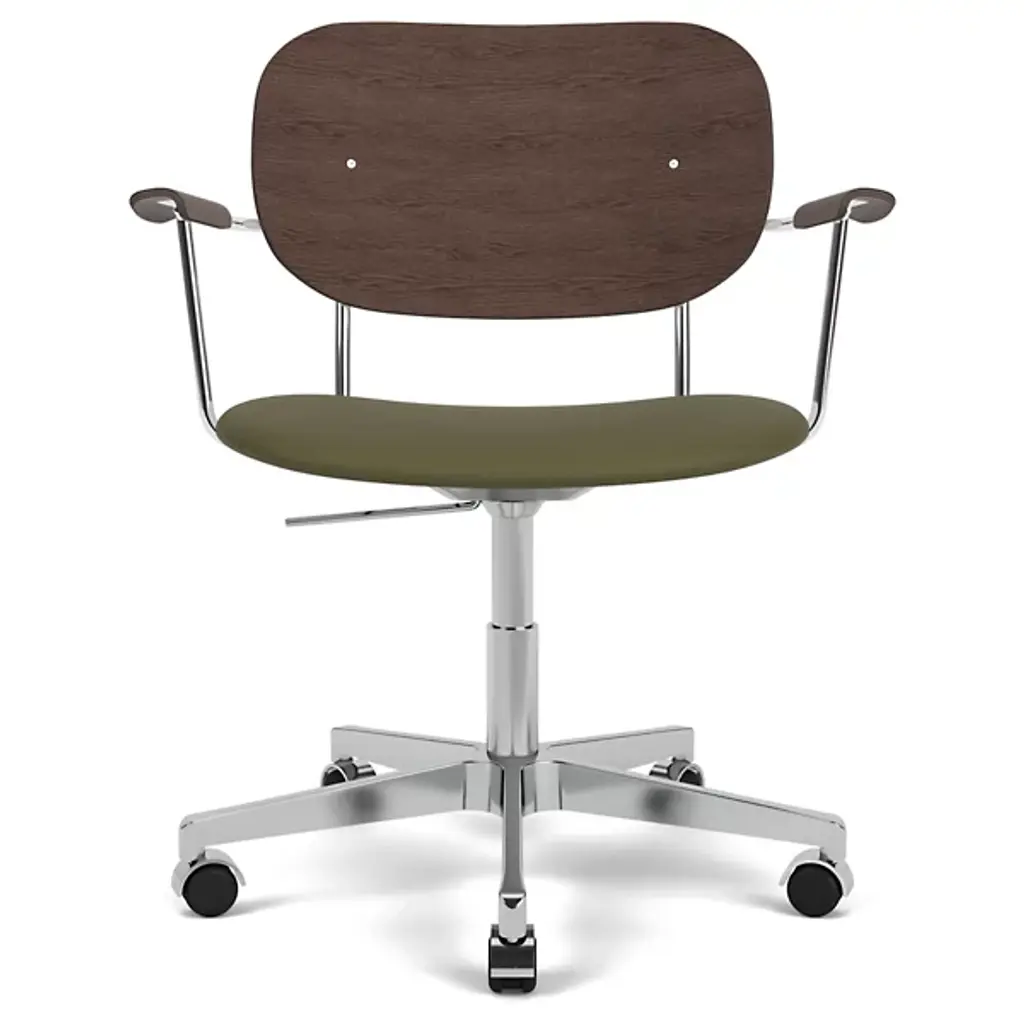 The Co Task Chair w/Armrest, Upholstered Seat from Audo Copenhagen is designed by Norm Architects and Els van Hoorebeeck. It is composed of plywood and oak. This finely upholstered seating solution boasts caster wheels for easy mobility. It is filled with foam for maximum comfort. A steel and aluminum frame adds a contemporary touch and durability. It includes an armrest for your convenience and exudes a Scandinavian sense of style. Flex tilt capability and height adjustability offer customization.