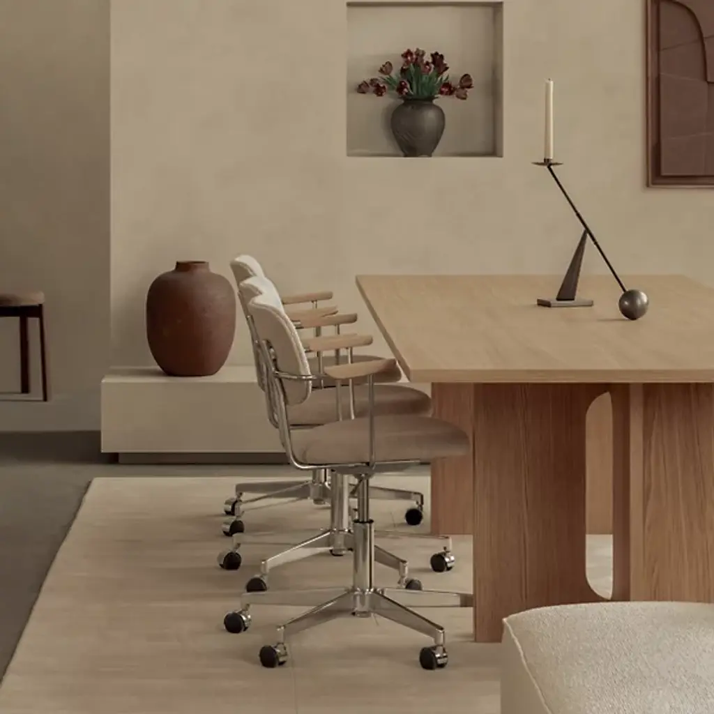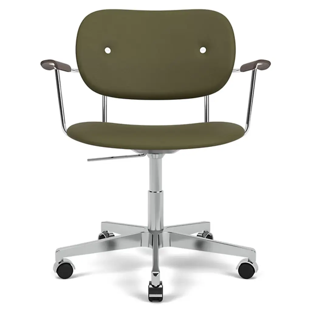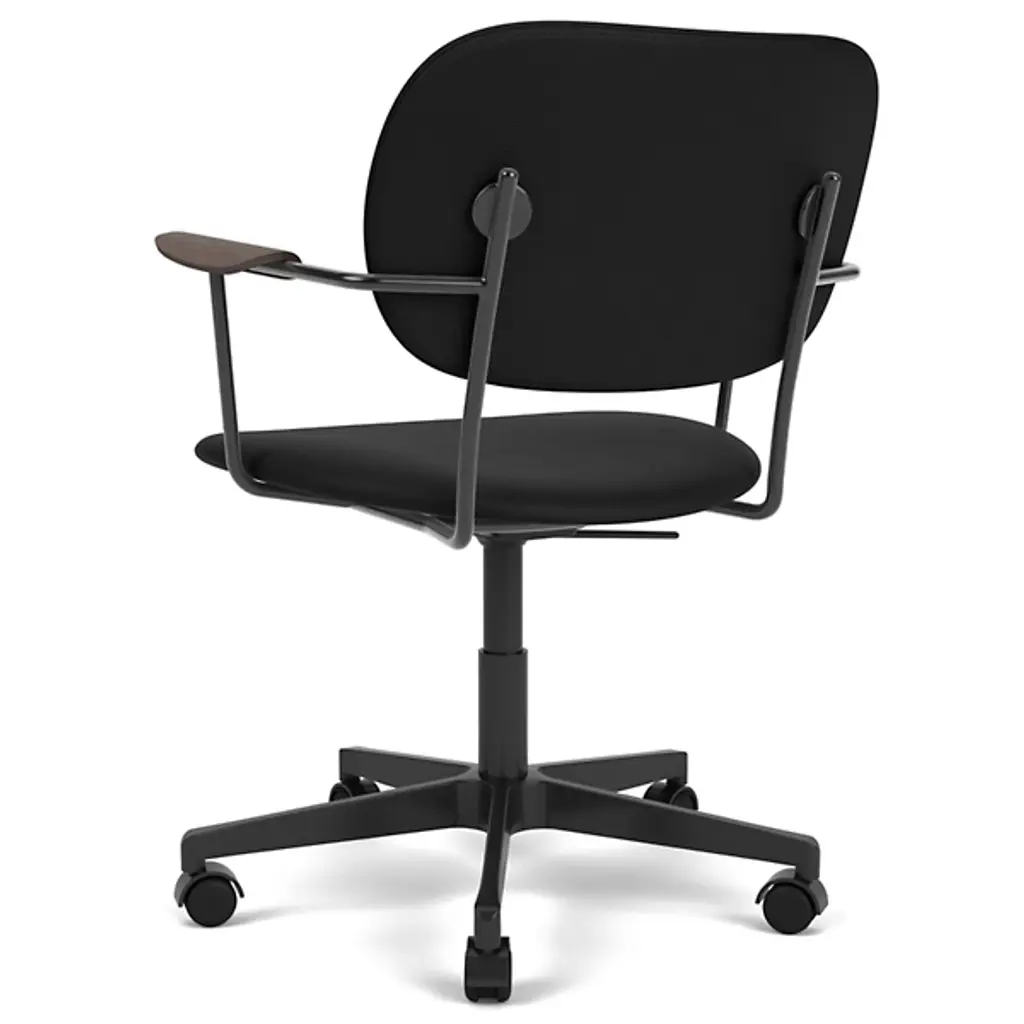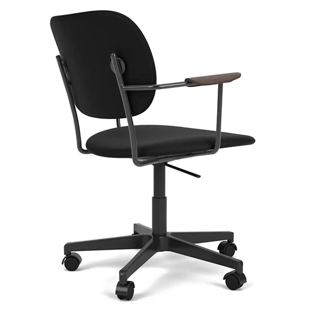 The Co Upholstered Task Chair with Armrest from Audo Copenhagen offers a functional, fabulously modern character to its surroundings. Designed by Norm Architects, it has a flex tilt feature and an easily adjustable height, exuding a simple Scandinavian style. Caster wheels offer easy mobility, while the rounded back is softened by a contoured seatback, offering support and a sense of fluidity echoed by the seat's design. It is handsomely upholstered and contrasted with wood armrests to create a small natural note.