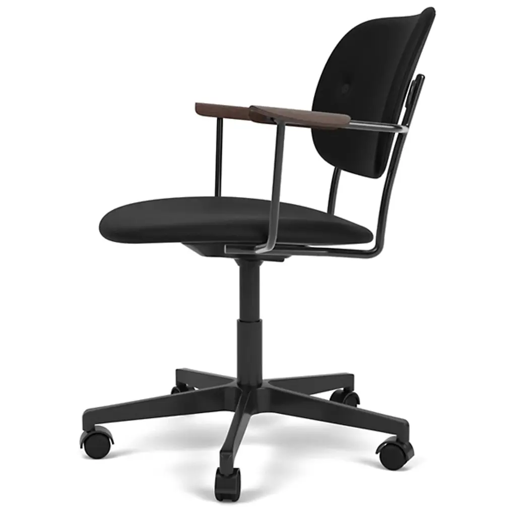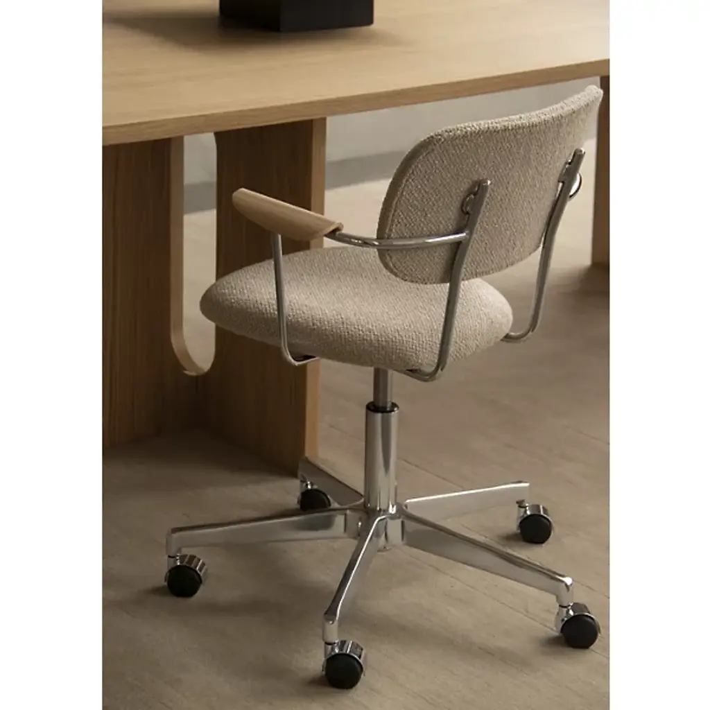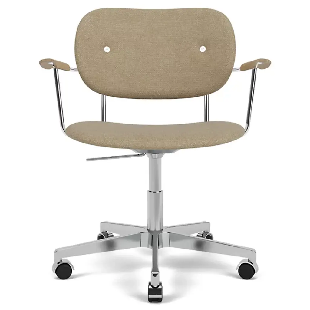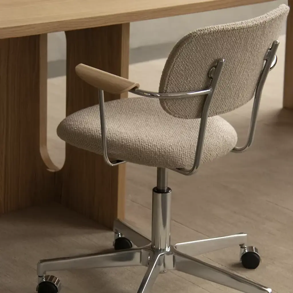 The Co Upholstered Task Chair with Armrest from Audo Copenhagen offers a functional, fabulously modern character to its surroundings. Designed by Norm Architects, it has a flex tilt feature and an easily adjustable height, exuding a simple Scandinavian style. Caster wheels offer easy mobility, while the rounded back is softened by a contoured seatback, offering support and a sense of fluidity echoed by the seat's design. It is handsomely upholstered and contrasted with wood armrests to create a small natural note.