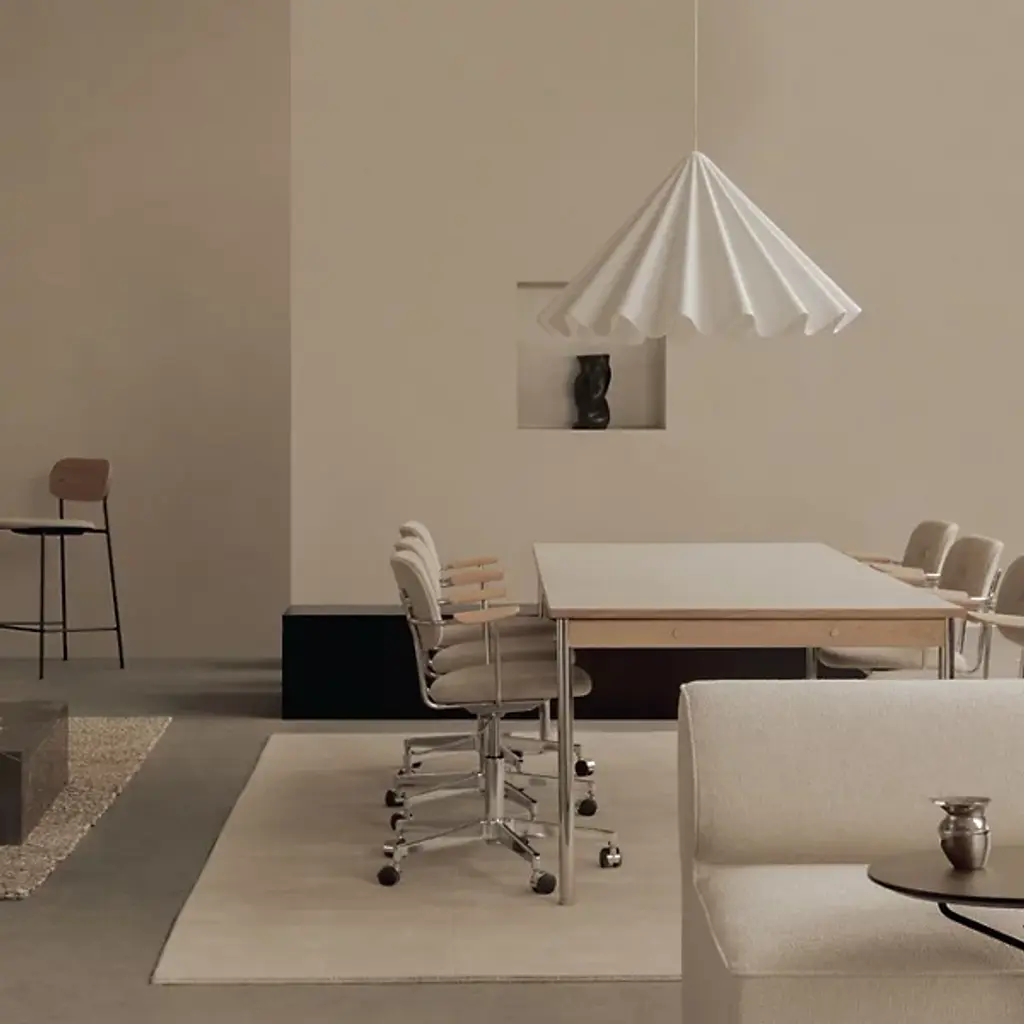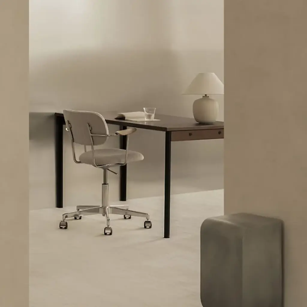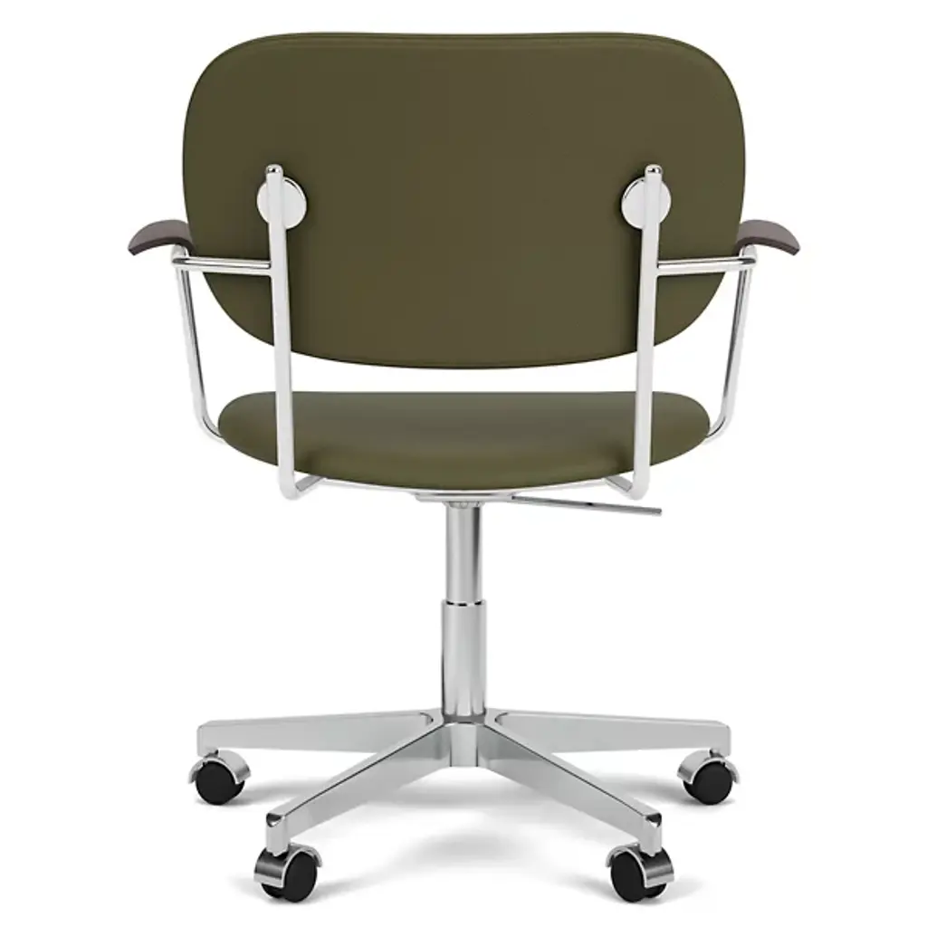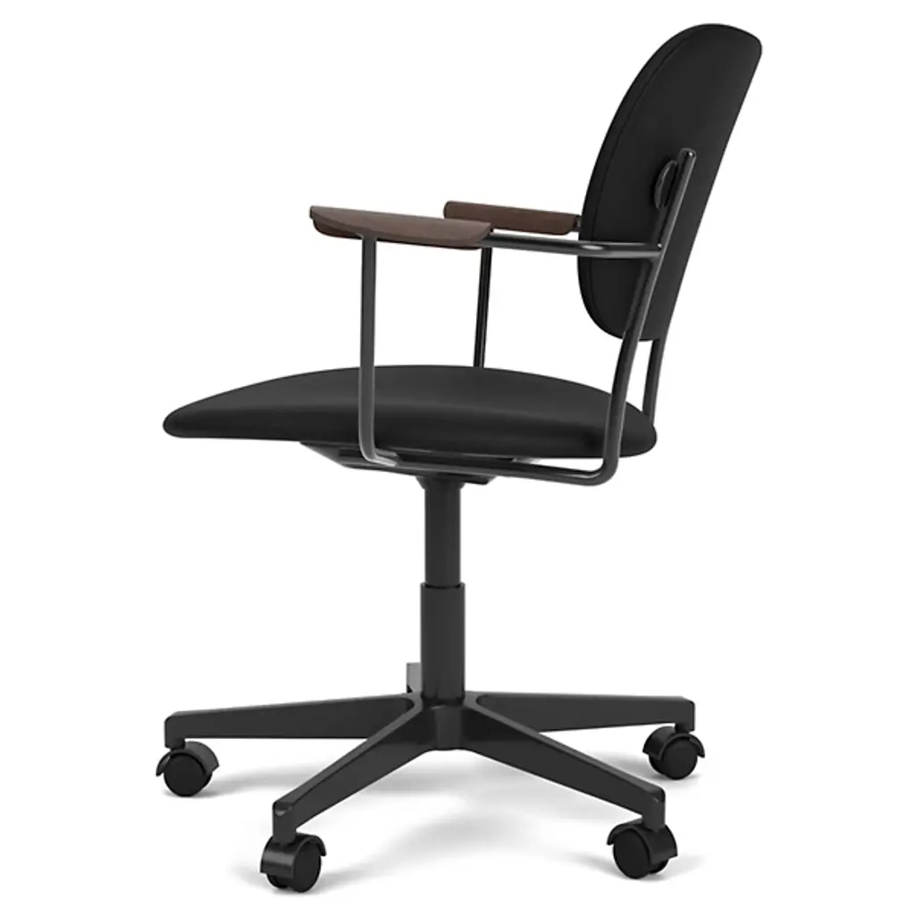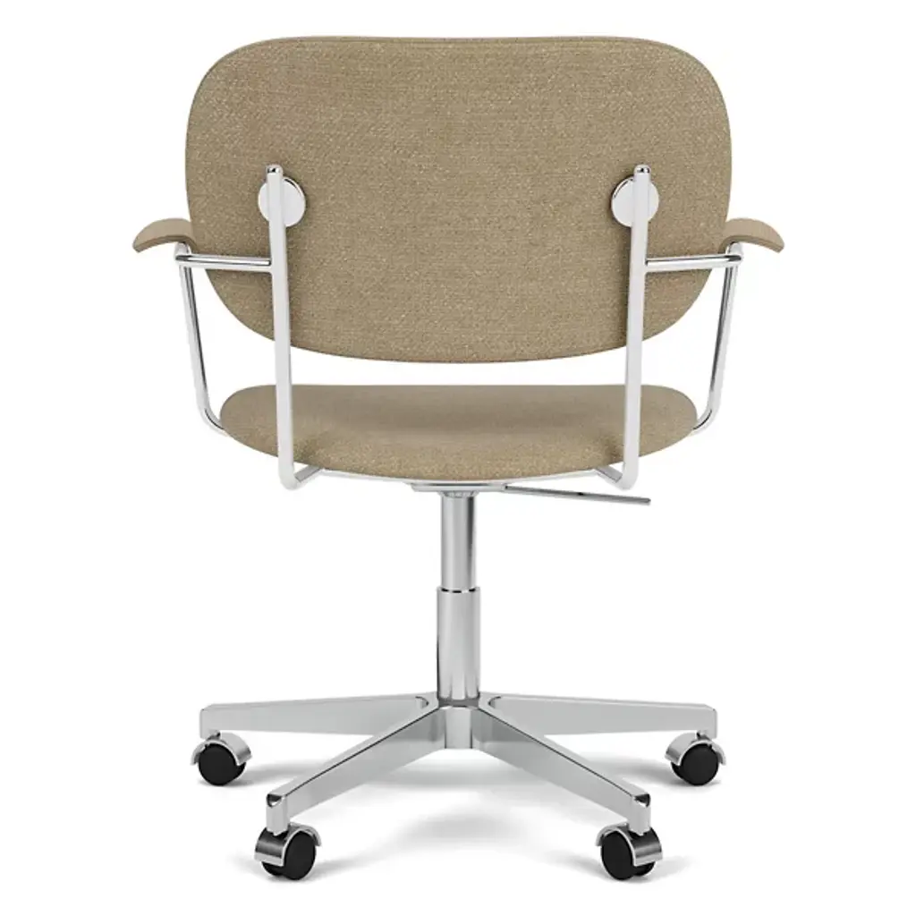 The Co Upholstered Task Chair with Armrest from Audo Copenhagen offers a functional, fabulously modern character to its surroundings. Designed by Norm Architects, it has a flex tilt feature and an easily adjustable height, exuding a simple Scandinavian style. Caster wheels offer easy mobility, while the rounded back is softened by a contoured seatback, offering support and a sense of fluidity echoed by the seat's design. It is handsomely upholstered and contrasted with wood armrests to create a small natural note.