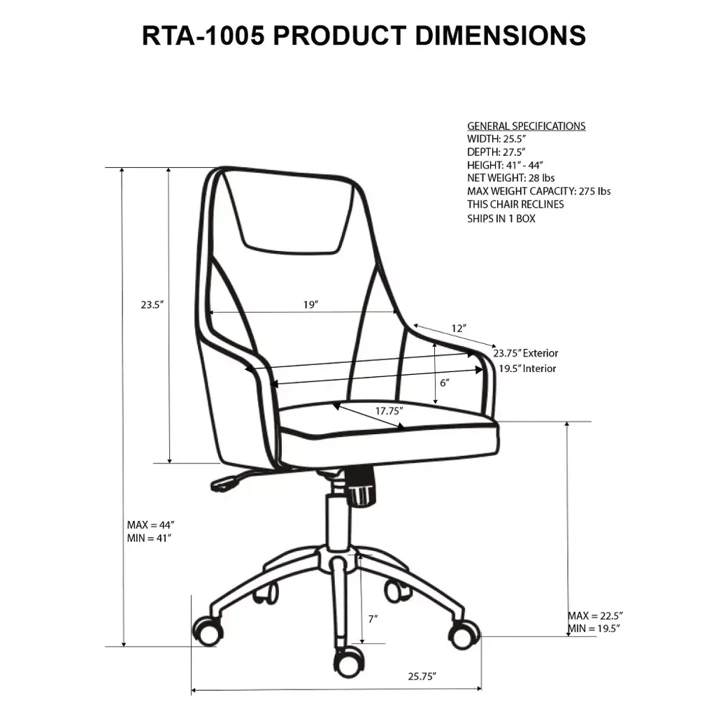 The Techni Mobili High back task chair is beautifully upholstered with a clean, comfortable design you will appreciate from the second you enter your work space. The Techni Mobili High back office chair features a dedicated headrest and a chrome finish base. It is upholstered entirely in fabric. The seat is height adjustable through a pneumatic gas lift seat mechanism, and the chair also has swivel tilt with tension control so that finding your sweet spot is easy. Max Weight Capacity: 220 lbs. Color: Gray