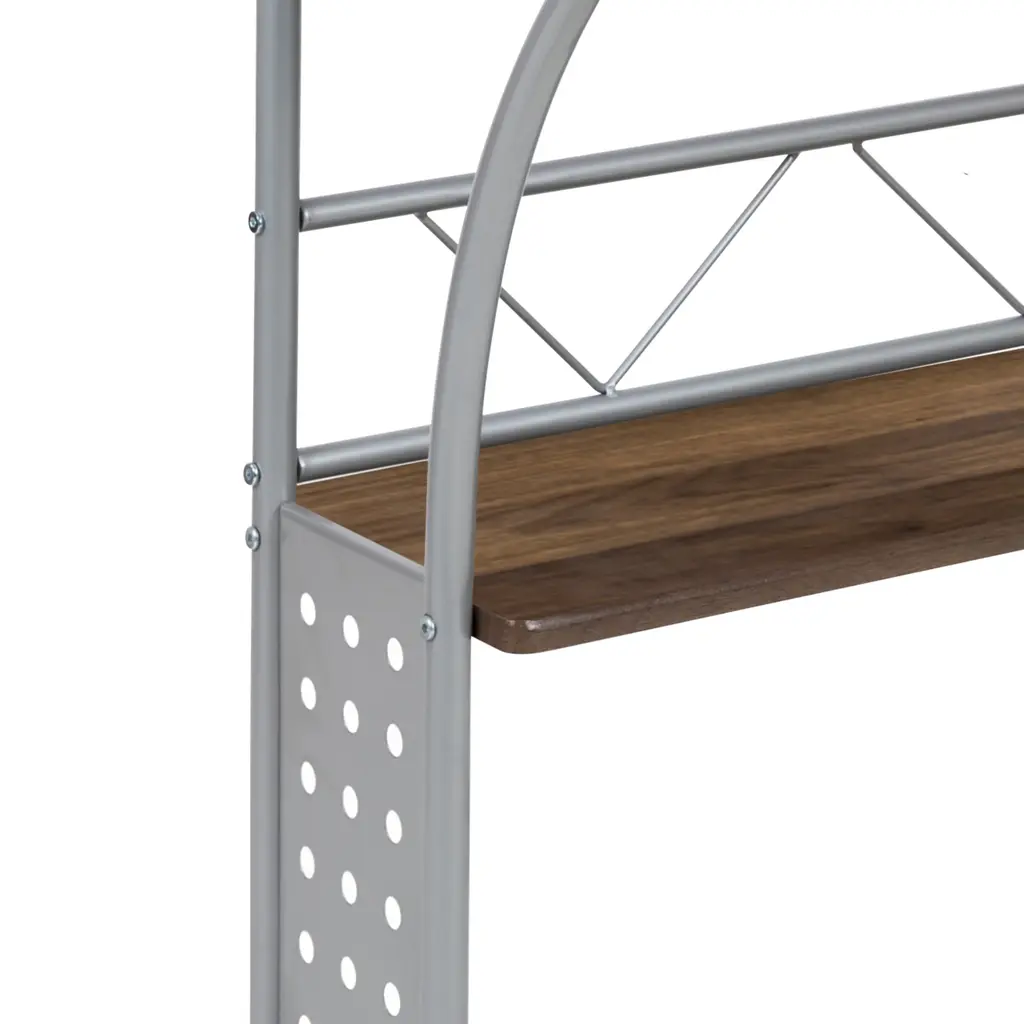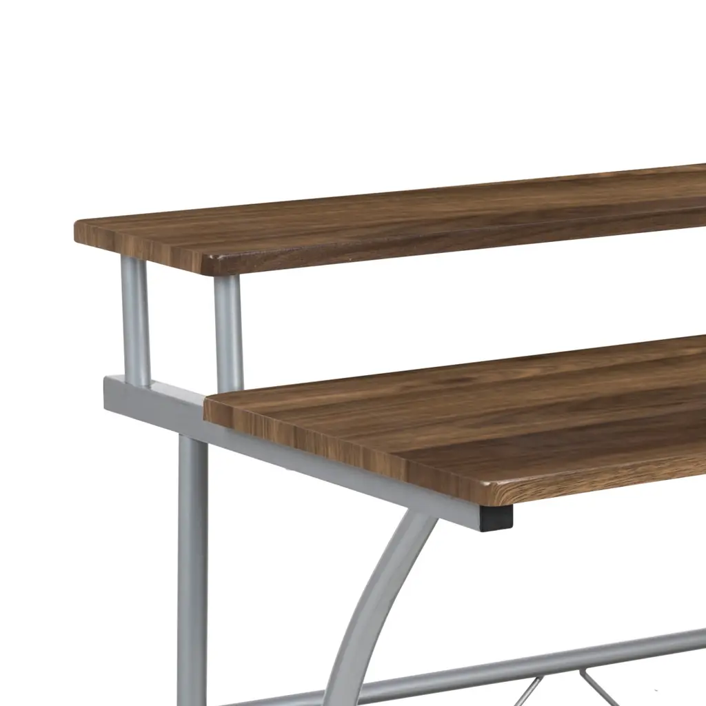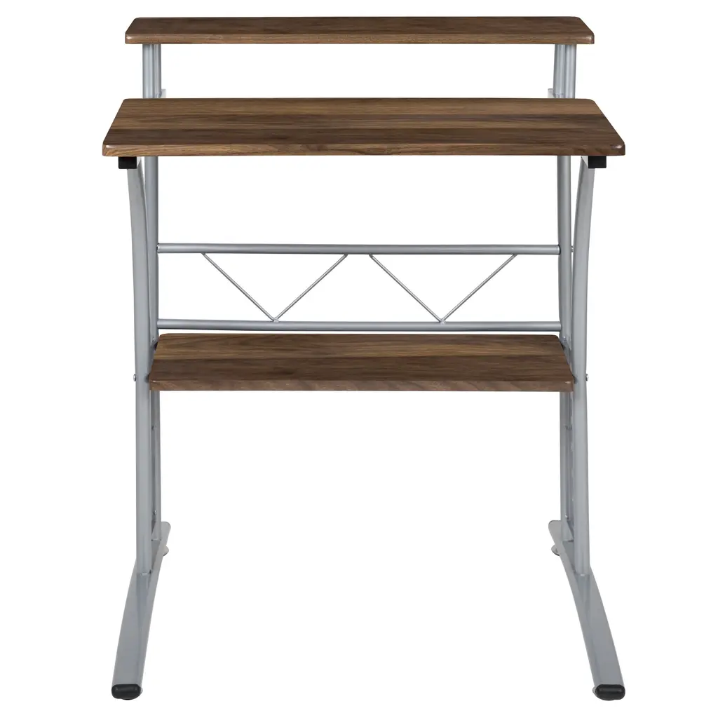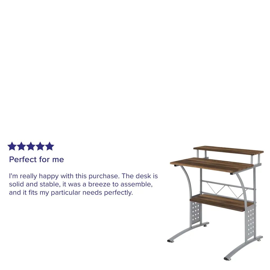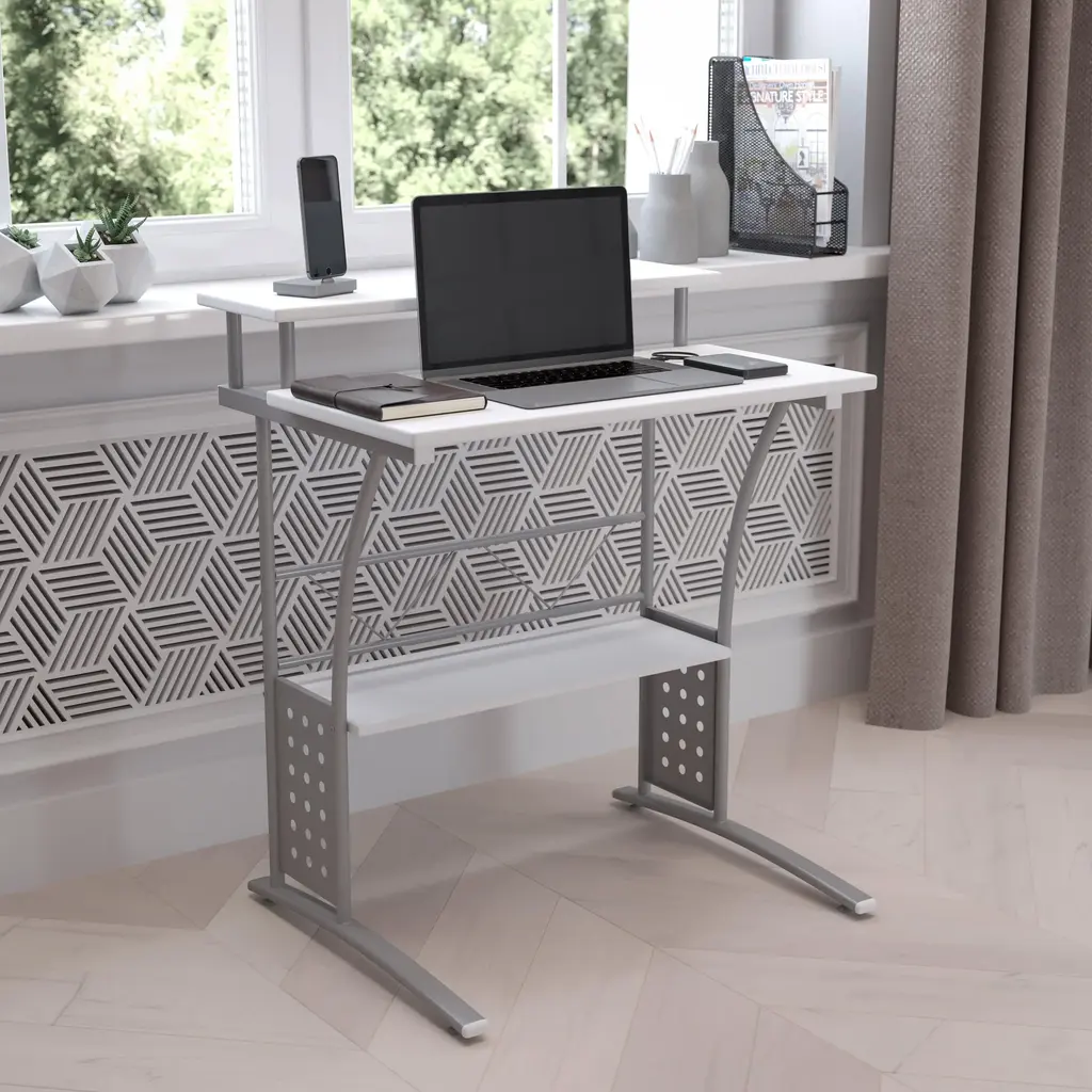 Streamline your home office with this on-trend mixed media computer desk that definitely makes a statement. Offering an efficient workstation that fits well in small spaces, this office desk with storage shelves is ideal for apartment living or dorm rooms. The contrasting perforated design frame pairs beautifully with the laminate shelving for a modern look. The generous desk surface boasts a smooth finish with a raised top shelf for your monitor or keepsakes and a lower bottom shelf for your hard-drive and other supplies. The two shelf desk has a powder coated steel frame for long-lasting durability. Self-leveling floor glides keep your desk from wobbling on uneven floor surfaces and protect your floors by sliding smoothly when you need to move the desk. The compact open storage shelf desk has a modern design that works well for both studying and daily tasks. Pair this home office computer desk with one of our executive swivel office chairs to complet your set-up.