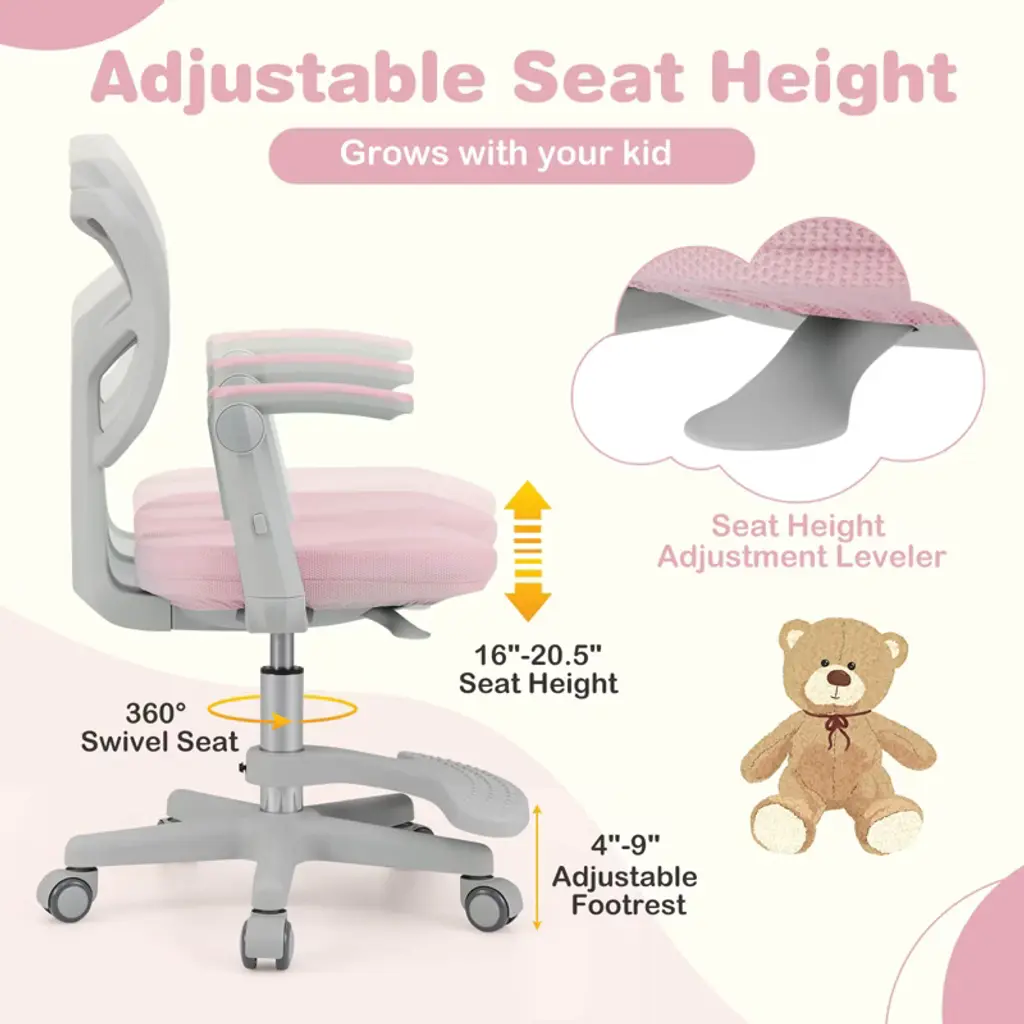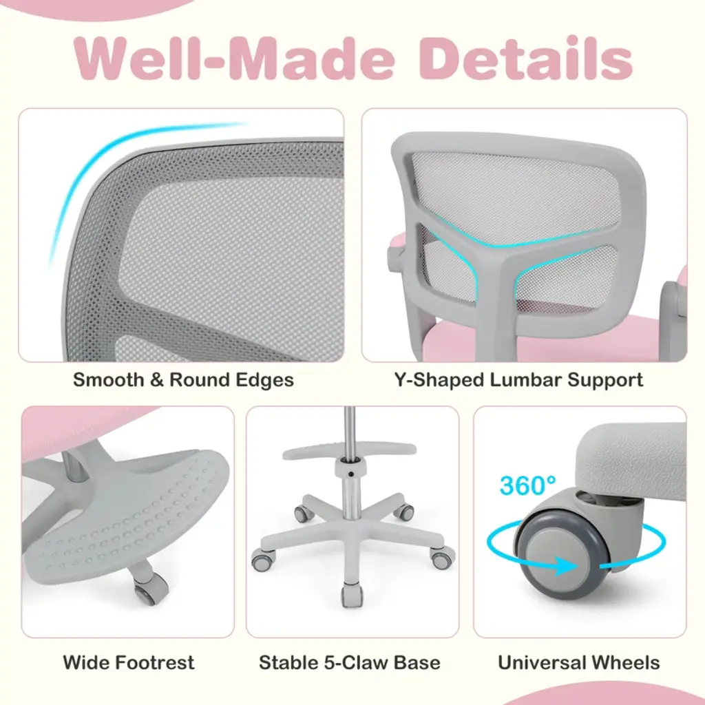 Invest in this kids study chair designed for long-lasting comfort and support. With a swivel seat and adjustable height, footrest, and armrests, this kids desk chair ensures a tailored fit for your child's changing needs. The ergonomic mesh backrest and Y-shaped lumbar support encourage a healthy sitting posture, while the soft, removable cushion adds comfort and hygiene. The stable base with smooth universal wheels ensures easy mobility, making it ideal for various activities. FeaturesAdjustable seat height meets the needs of growing kids Easy to operate with the seat height adjustment leveler Offers easy access with the swivel seat Includes a wide footrest with adjustable height Adjustable armrests available for 90° rotation and 1.8" lifting Designed for sitting comfort with a padded seat cushion Ergonomic design helps to cultivate the correct sitting posture Mesh backrest enhances air circulation Removable seat cushion makes cleaning a breeze Easy movement with the universal wheels High stability with the 5-claw base Crafted with well-made details for lasting useColor: Purple/Pink/Green/Gray/Blue Material: PU + Nylon + Foam + Polyester Overall Dimension: 22.5" x 21.5" x 31.5"-36" (L x W x H) Seat Dimension: 17.5" x 16" x 16"-20.5" (L x W x H) Backrest Dimension: 16" x 12" Footrest Dimension: 15" x 4.5" x 4"-9" (L x W x H) Weight Capacity: 330 lbs Net Weight: 17 lbs Package Includes: 1 x Kids Study Chair 1 x User Guide