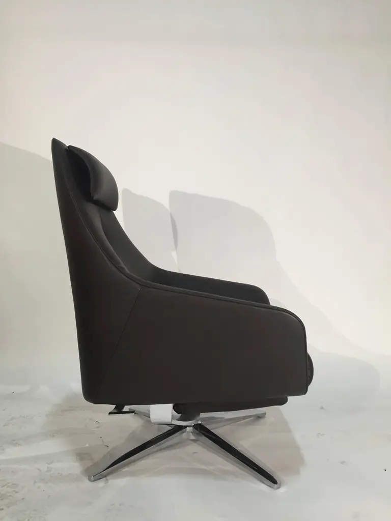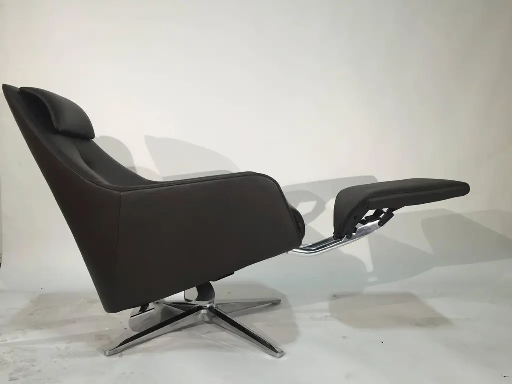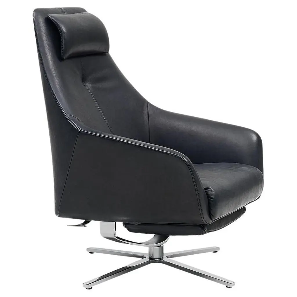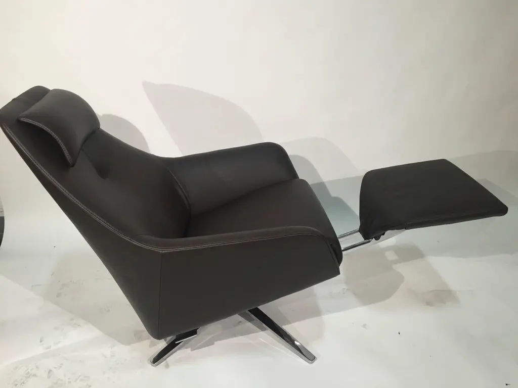 Maximum relax comfort. DS-277 is impressive for its formally exciting transition between the seat and back shell as a characteristic feature. A variety of leather qualities are available for the outer and inner shell. Infinitely height-adjustable headrest. When tilting to the rear, an otherwise invisible footrest can be extended for maximum relax comfort.On a par with a king’s throne and a leading entrepreneur’s executive chair – these were the requirements the new chair designed by Christian Werner was to meet. The German furniture designer made sure to choose a contemporary form with a slender silhouette, unobtrusive yet captivating for its style at the same time. In order to meet the high level of luxury and well-being, he worked with the designers at de Sede and developed a hidden relax function – the armchair can be tilted backwards and a previously invisible footrest extended. A characteristic detail is the seam on the outside. It connects the backrest and armrest with one another and at the same time acts as a clear separation line – executed with the very high level of craftsmanship that is typical of de Sede.Additional information:Material: LeatherCategory: Select - BlackType: Nappa leather, lighty pigmentedThickness: 1.2 to 1.4 mmCharacteristics: Elegant in appearance, particularly durable, less sensitive to humidity, spots and light exposure thanks to an easy-care finish. Living unites practical considerations with a high aesthetic.Dimensions: 74 W x 153 D x 100 H cmSeat height: 46 cmArmrest height: 55 cmAvailable in other upholstery options: Living, touch, natural, coloral, craft, velour.