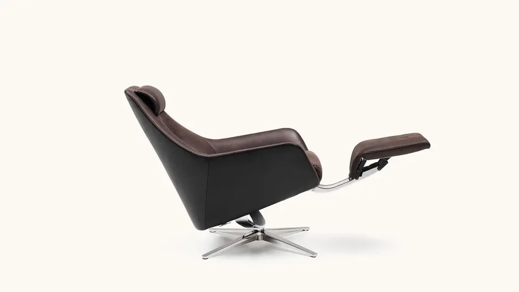 Maximum relax comfort. DS-277 is impressive for its formally exciting transition between the seat and back shell as a characteristic feature. A variety of leather qualities are available for the outer and inner shell. Infinitely height-adjustable headrest. When tilting to the rear, an otherwise invisible footrest can be extended for maximum relax comfort.On a par with a king’s throne and a leading entrepreneur’s executive chair – these were the requirements the new chair designed by Christian Werner was to meet. The German furniture designer made sure to choose a contemporary form with a slender silhouette, unobtrusive yet captivating for its style at the same time. In order to meet the high level of luxury and well-being, he worked with the designers at De Sede and developed a hidden relax function – the armchair can be tilted backwards and a previously invisible footrest extended. A characteristic detail is the seam on the outside. It connects the backrest and armrest with one another and at the same time acts as a clear separation line – executed with the very high level of craftsmanship that is typical of De Sede.Additional information:Material: LeatherCategory: Select - CafeType: Nappa leather, lighty pigmentedThickness: 1.2 to 1.4 mmCharacteristics: Elegant in appearance, particularly durable, less sensitive to humidity, spots and light exposure thanks to an easy-care finish. Living unites practical considerations with a high aesthetic.Dimensions: 74 W x 153 D x 100 H cmSeat height: 46 cmArmrest height: 55 cmAvailable in other upholstery options: Living, touch, natural, coloral, craft, velour.