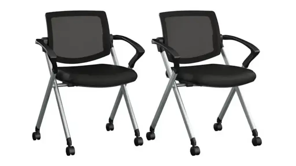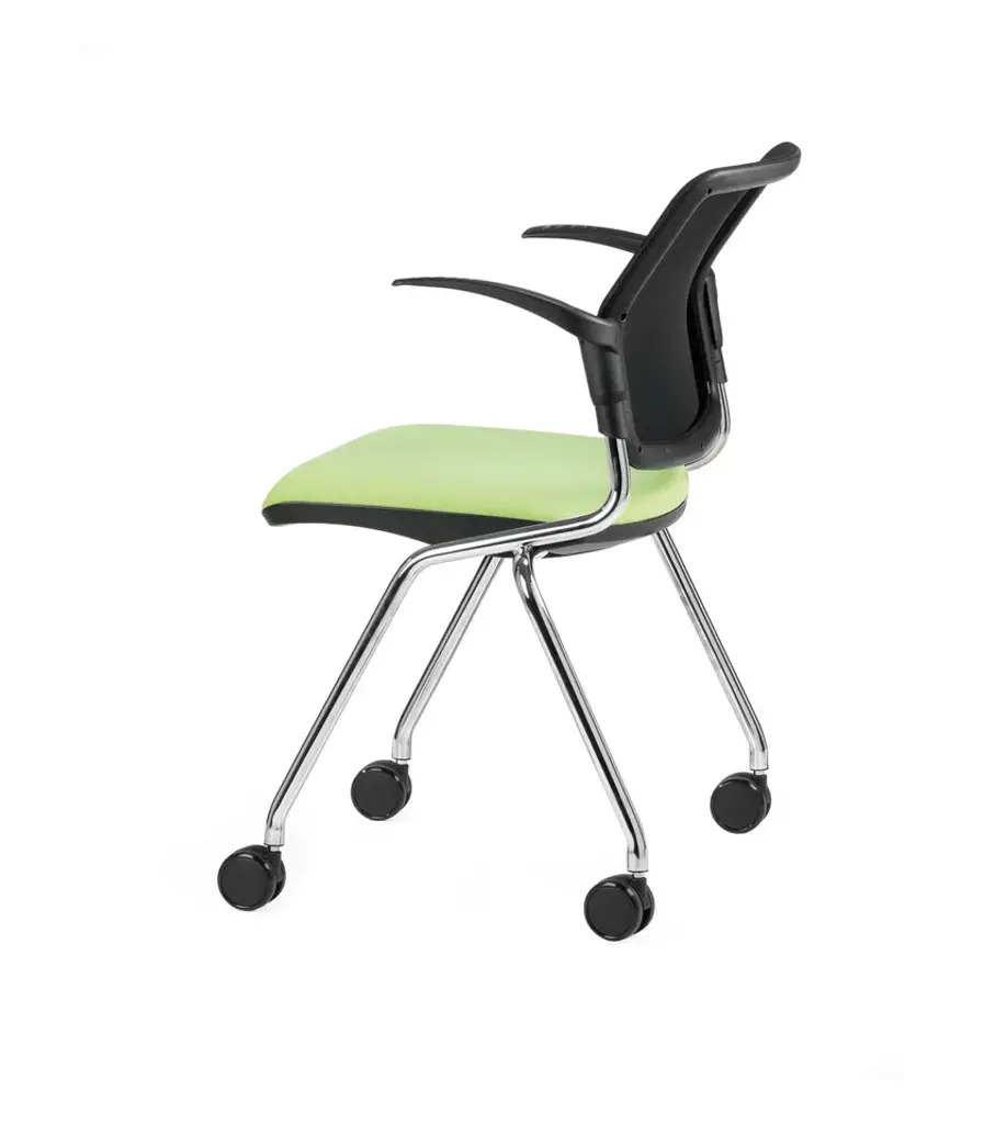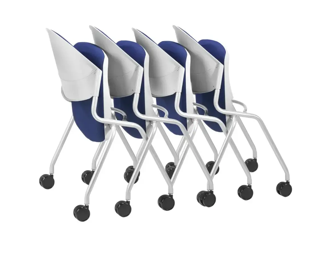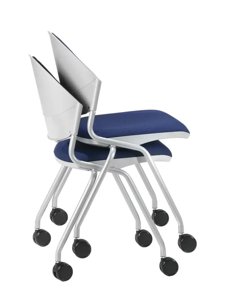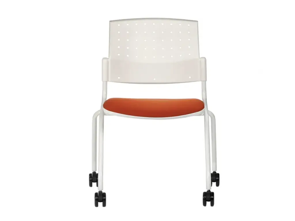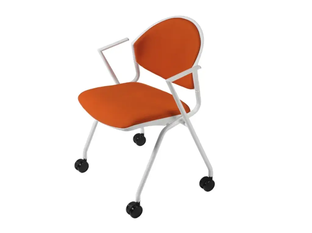 Delfy 088 R S - Upholstered fabric reception chair with casters.Nesting - Stacking chairs with flip-up seat for frontal nesting.Seat always padded and upholstered in fabric or leather.UnderSeat and back in copolymer available in various colors.3 backs available: round for Delfi, square for DelfiBrio, mesh for DelfiNet.4 legs metal base with or without arms and adjustable glides.Available version with 4 castors and/or 2 and 2.Available version with anti-panic writing tablet.Ideal for: conference rooms, clinics, hospitals, schools, front desk.Optional: Front panel padded and upholstered seat or seat and back, connecting ganging, left tablet, big size tablet for PC, transport dolly, floor metal bracket alignment.