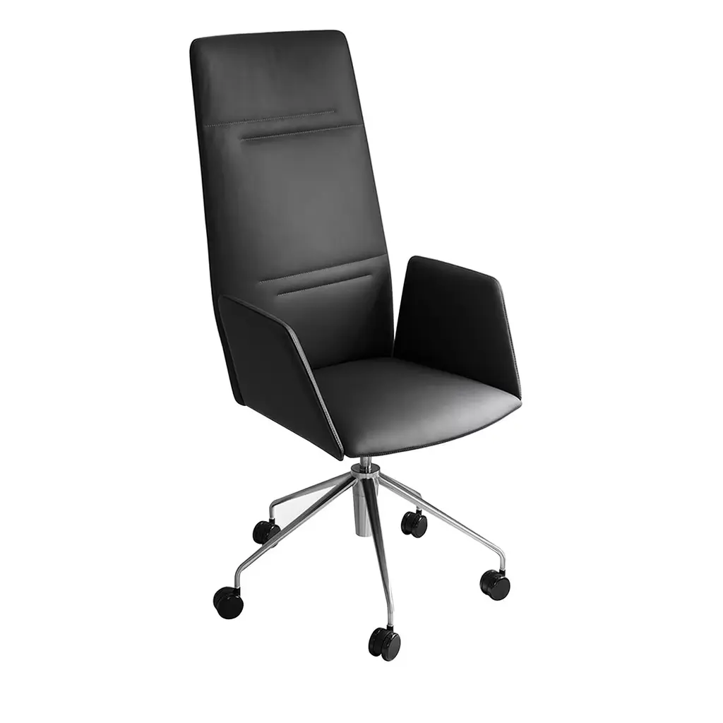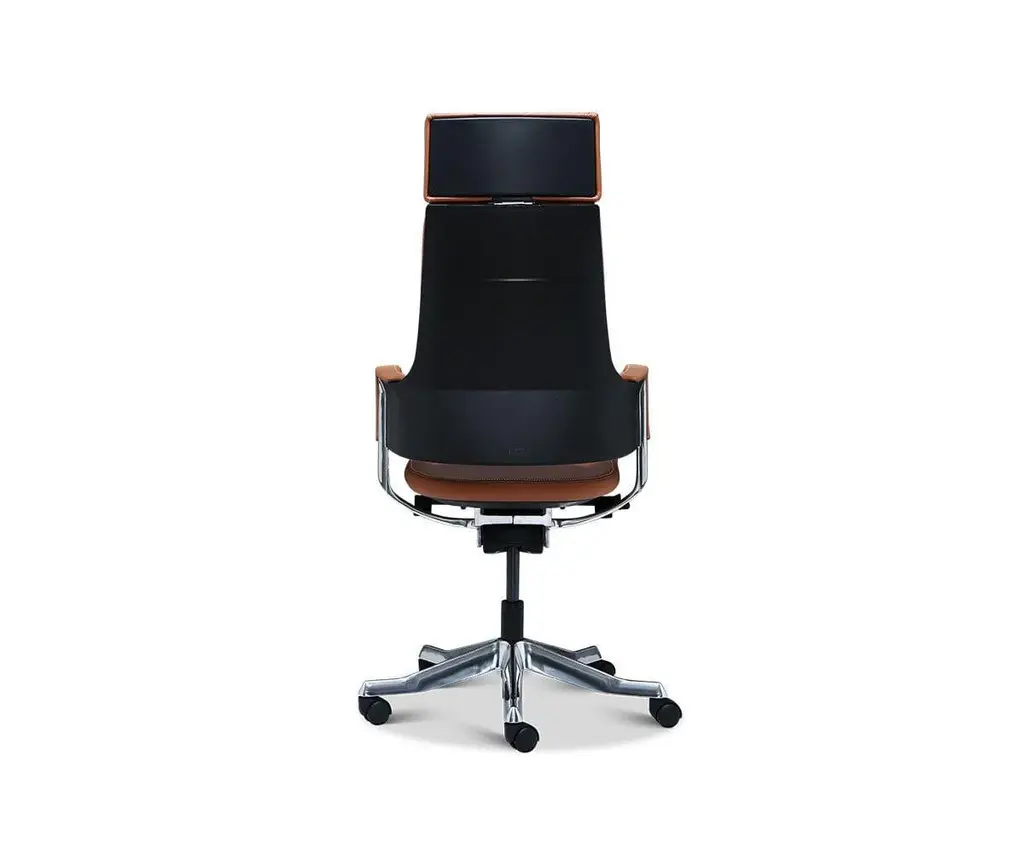 The Delphi Leather Desk Chair is a futuristic design with comfort in mind. Featuring a high-back and wrapped armrests, this leather-upholstered chair makes a strong statement.