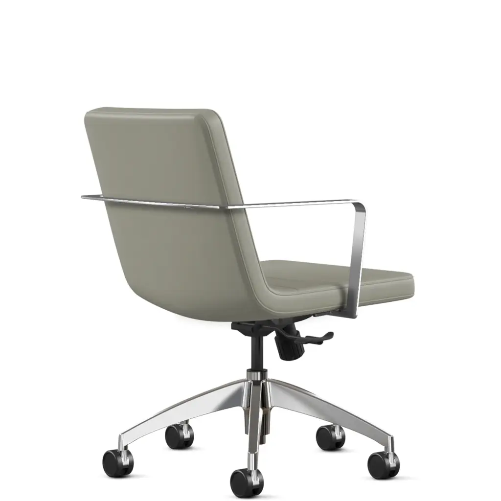 Classic midcentury look. Choose from multiple colors in our contract-grade, extra durable textiles. Hudson is a woven with a subtle texture. Pauly is a soft vinyl that offers a leather look. Polished aluminum base with chrome-accented casters. Swivel tilt control has an upright back lock, center knob for back recline tension, pneumatic height adjustment, and 360° swivel