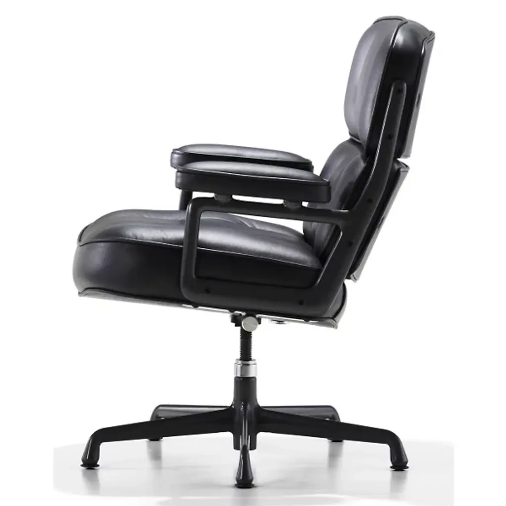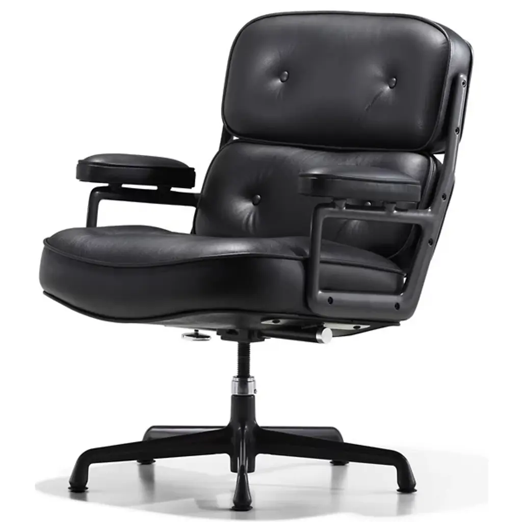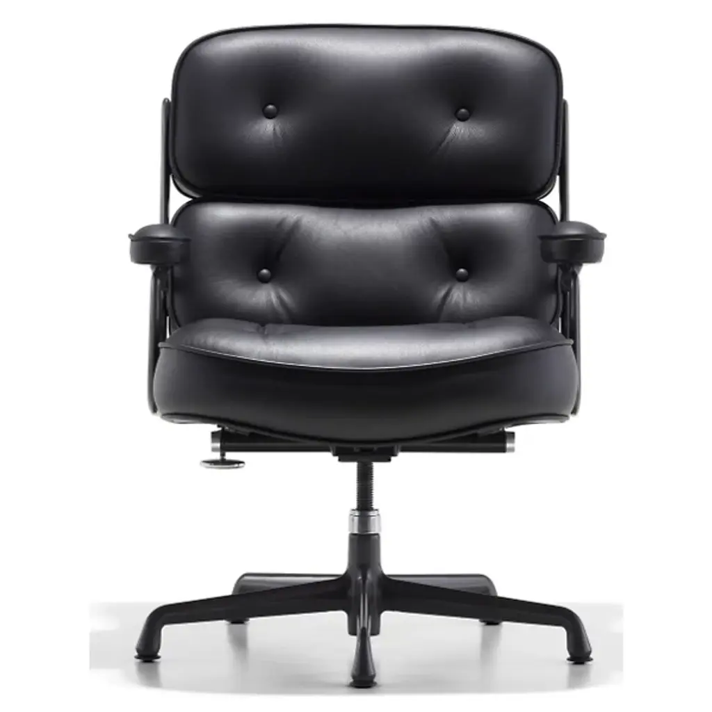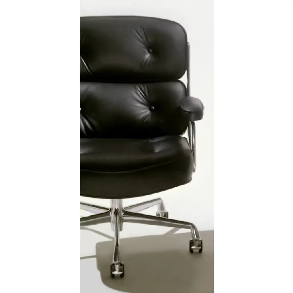 The Eames® Executive Chair by Herman Miller® is also known as a Time-Life Chair, in that it was originally designed in 1960 to furnish the ultra-modern lobbies of the Time-Life Building. The generously sized chair has thick cushions and armrests upholstered in supple leather. Its lightweight aluminum frame has five glides or rolling castors and is height adjustable.