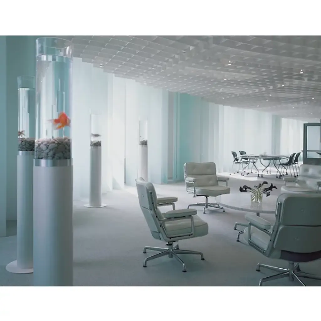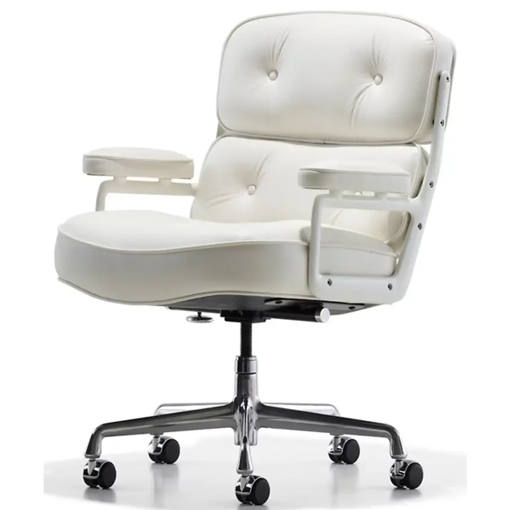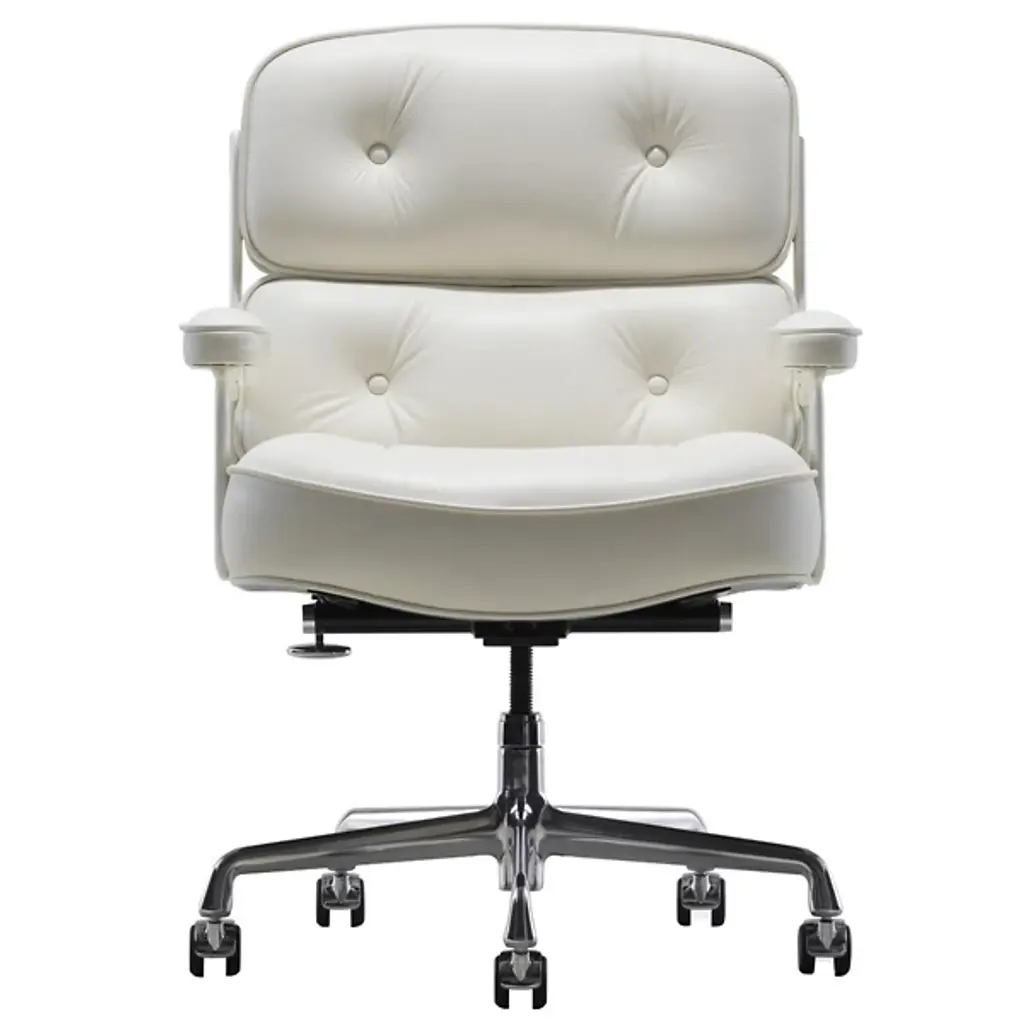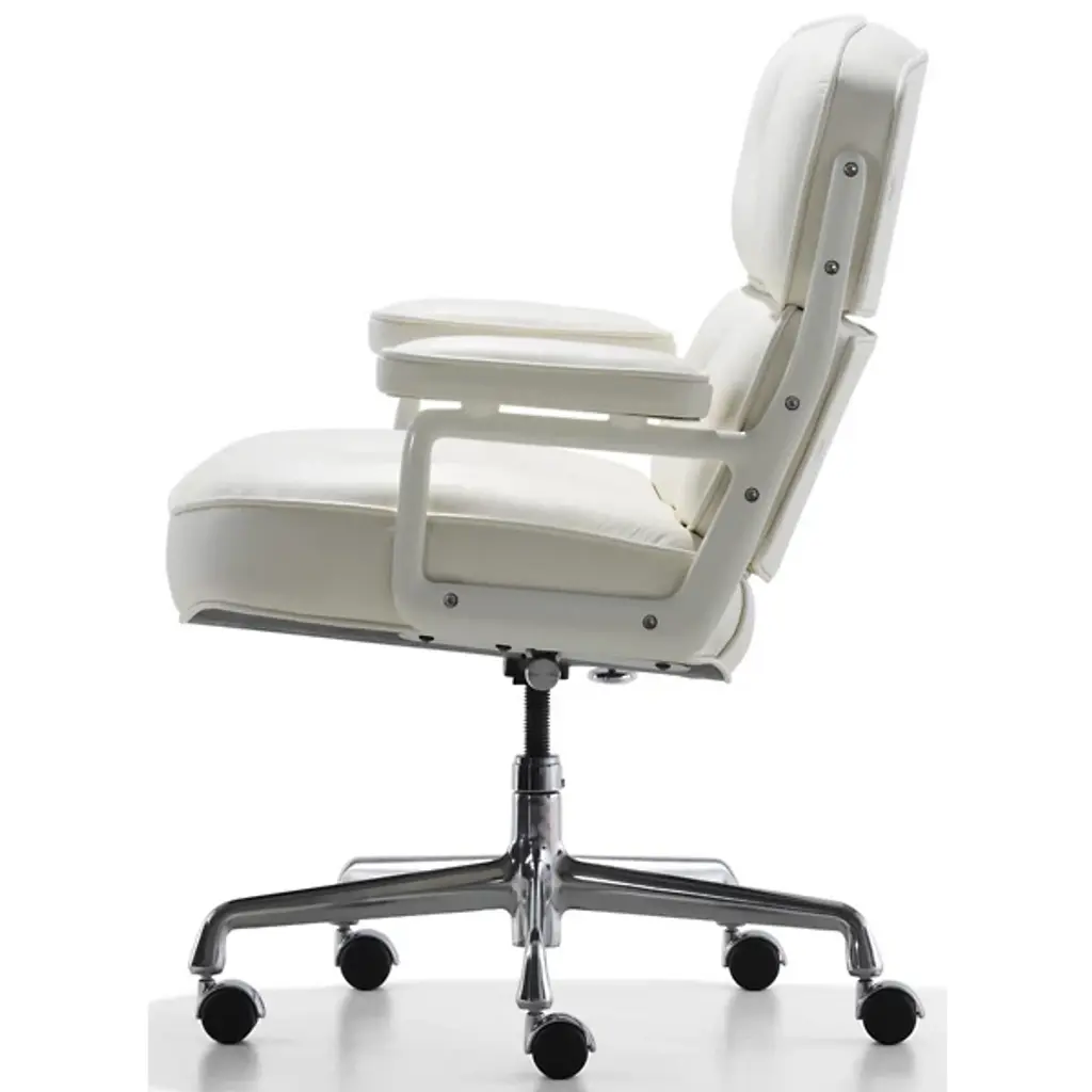 The Eames® Executive Chair by Herman Miller® is also known as a Time-Life Chair, in that it was originally designed in 1960 to furnish the ultra-modern lobbies of the Time-Life Building. The generously sized chair has thick cushions and armrests upholstered in supple leather. Its lightweight aluminum frame has five glides or rolling castors and is height adjustable.