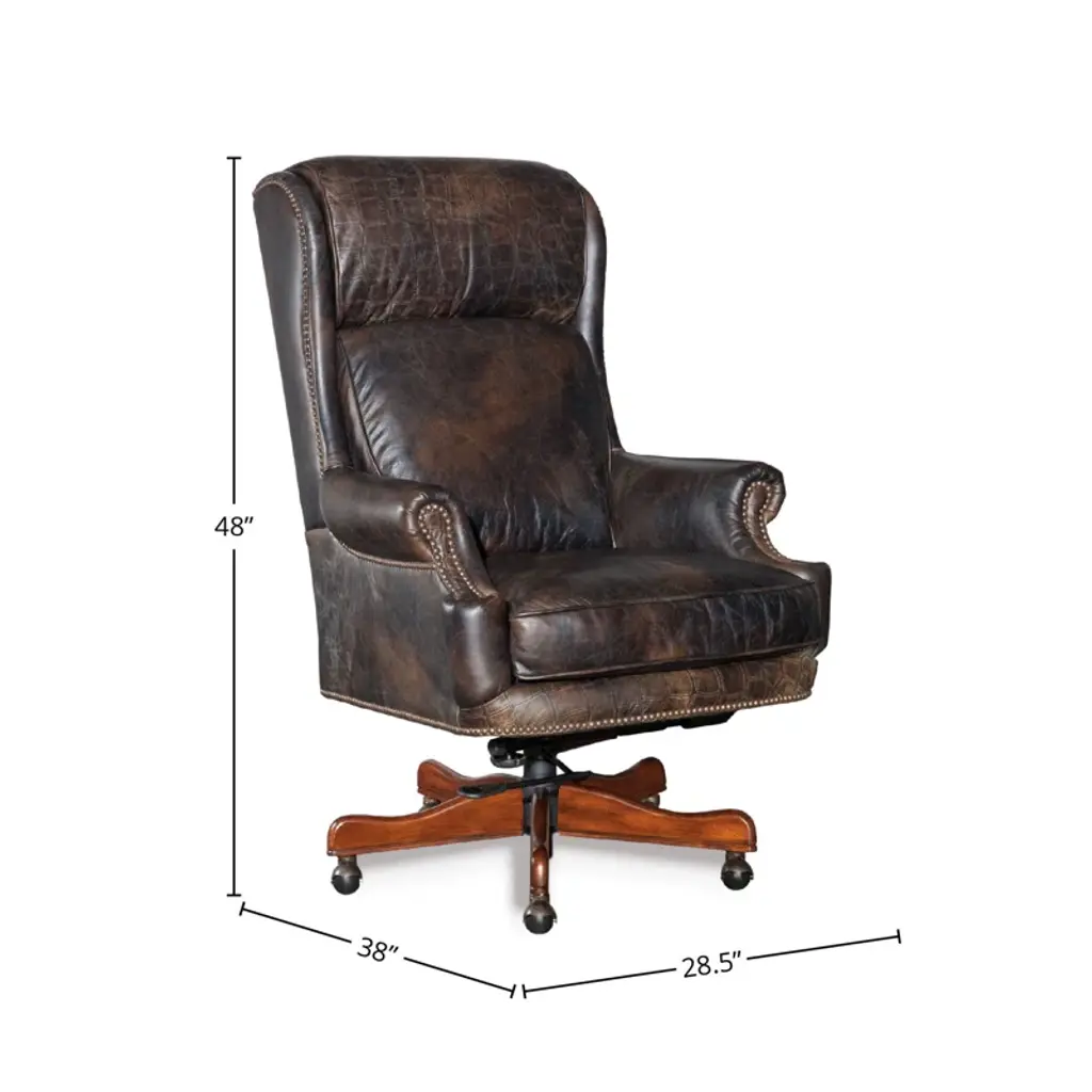 Developed by one of America's premier manufacturers to offer quality furniture at affordable prices. Each piece is meticulously hand-crafted using the most exquisite leathers in the world. The Old Saddle Fudge with Croc Accents Executive Swivel Tilt Chair is crafted using Old Saddle Fudge leather. with Croc Accents.