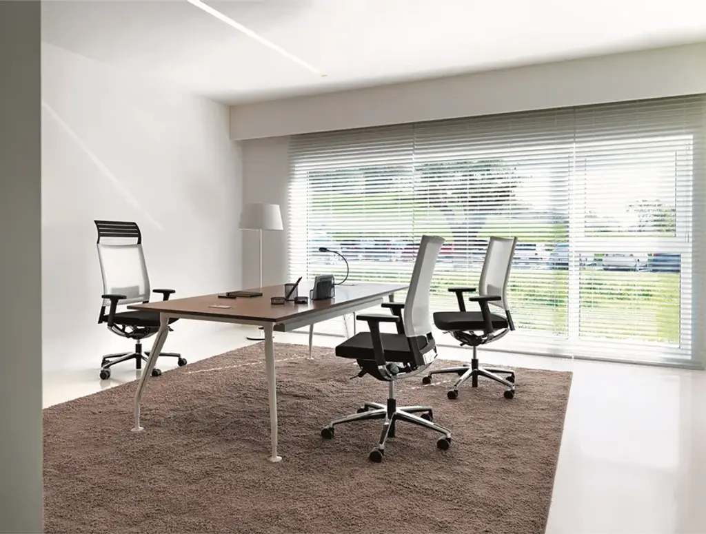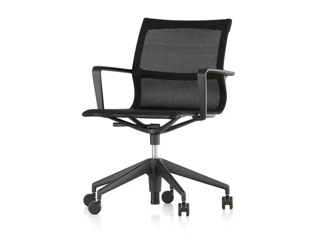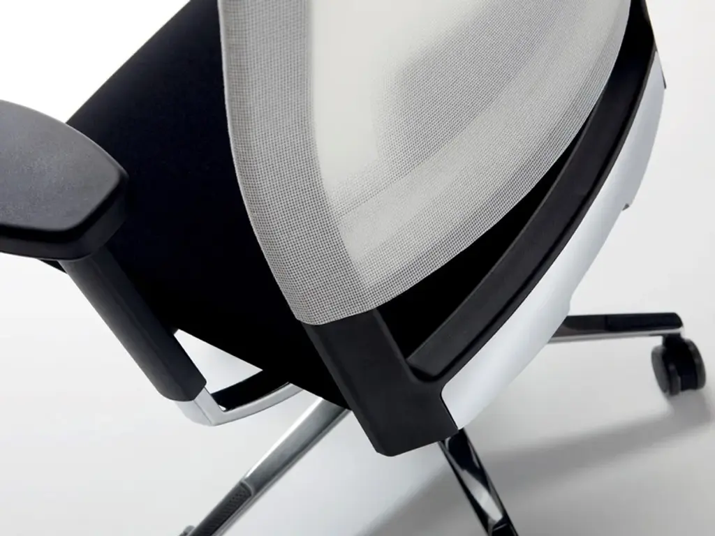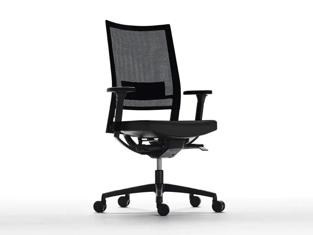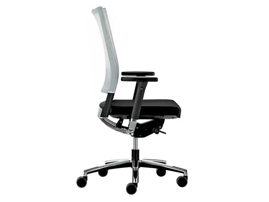 Expo 15 is a medium mesh back armchair with tilt and adjustable lumbar support, swivel height adjustable upholstered seat , height adjustable aluminium armrest with pivoting, width and depth adjustable black polyurethane arm pad, aluminium base, rubber castors Ø65.Mesh backrest. Padded seat covered in leather or fabric. Black plastics, polished arms and base.CERTIFICATIONSD.L. 81/80 / EN 1335