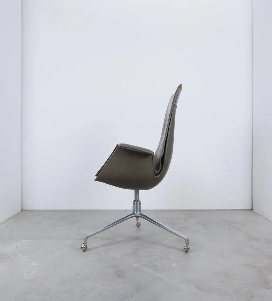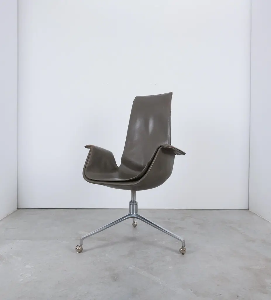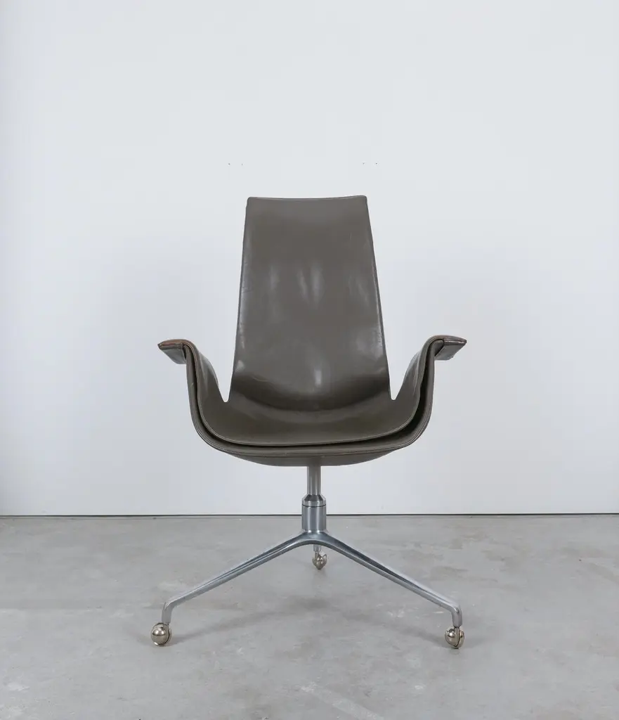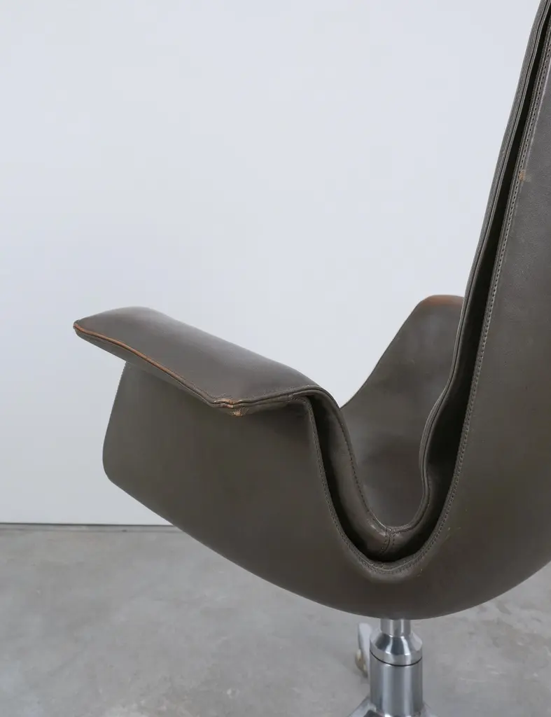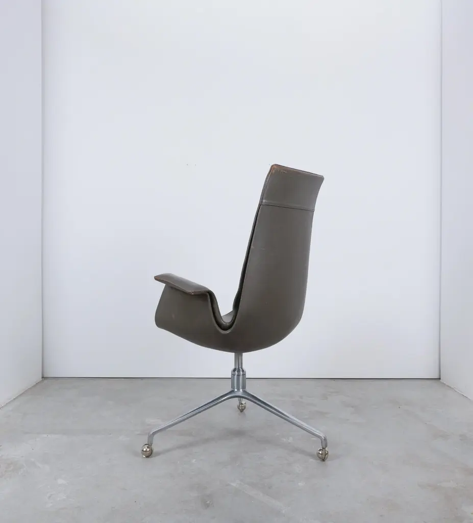 Fabricius and Kastholm tarmac High Back Bird Desk Chair Swivel Base FK 6725, 1964- Original midcentury leather desk chair (seat height 19") designed by Preben Fabricius & Jørgen Kastholm for Kill International in 1964 We have a total of 4 identical pieces available.Beautiful swiveling high back desk chair on casters and a tripod base of polished cast aluminum and stainless steel. Early Kil model from tarmac (grey, green, brown) leather in very good condition. The overall condition is also very good, the leather is in original condition with minor signs of wear, no holes, little scratching and lively rub off at the sleaves (arm-rests). We have treated the leather with a special leather conditioner to preserve the color and smoothness for years to come. With a seat height of 19" it's the higher executive version and can be perfectly used for a desk. The oblique lines of the design especially in the front seat section, do not only shape a beautiful and iconic chair but also serve the functional aspect for a desk chair to fit under a table.