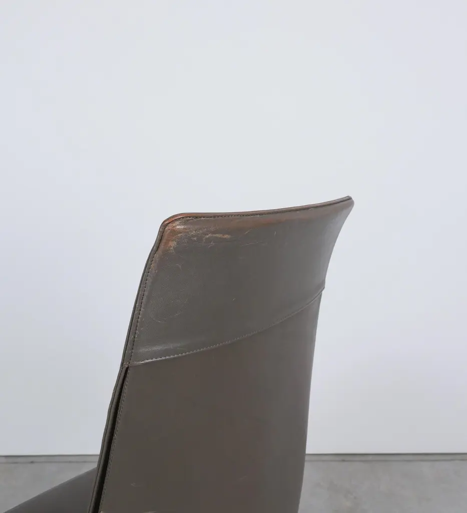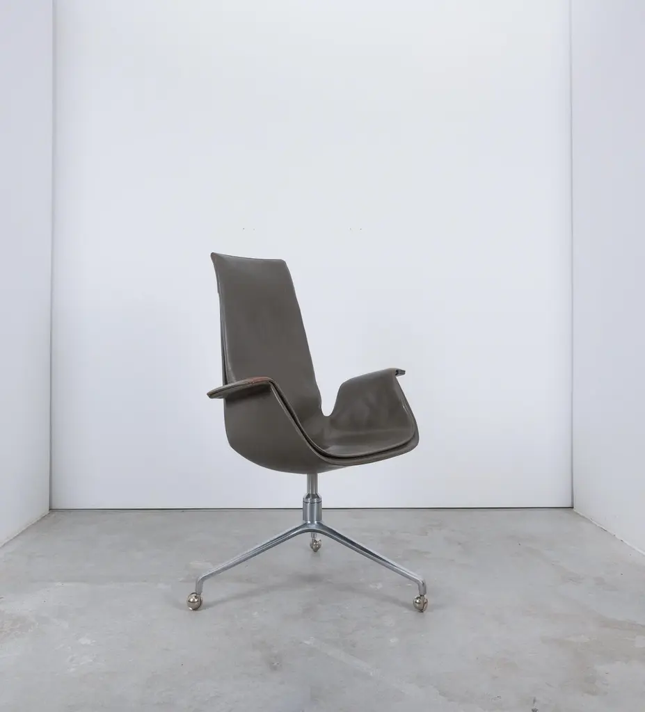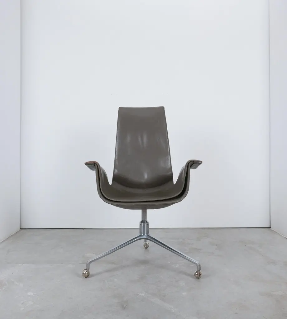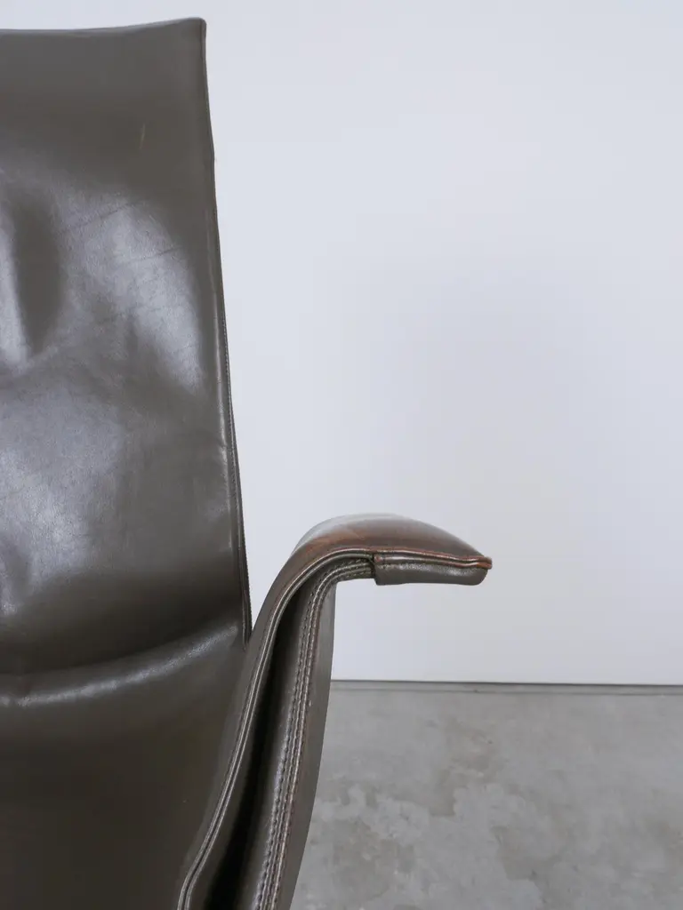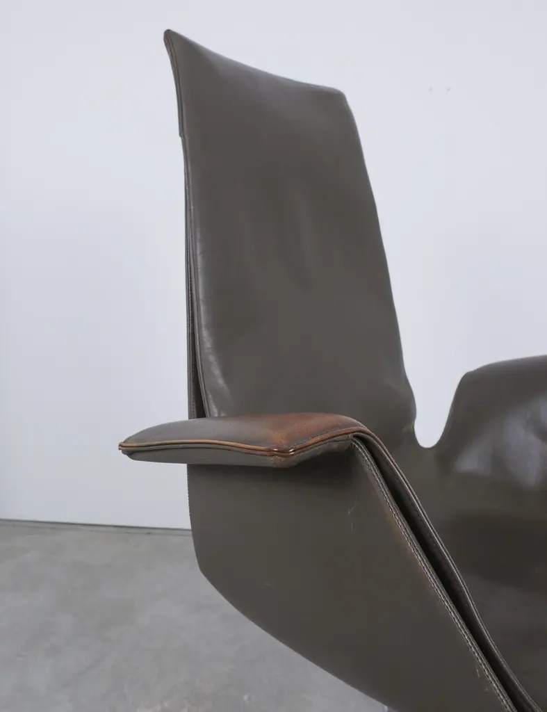 Fabricius and Kastholm tarmac High Back Bird Desk Chair Swivel Base FK 6725, 1964- Original midcentury leather desk chair (seat height 19") designed by Preben Fabricius & Jørgen Kastholm for Kill International in 1964 We have a total of 4 identical pieces available.Beautiful swiveling high back desk chair on casters and a tripod base of polished cast aluminum and stainless steel. Early Kil model from tarmac (grey, green, brown) leather in very good condition. The overall condition is also very good, the leather is in original condition with minor signs of wear, no holes, little scratching and lively rub off at the sleaves (arm-rests). We have treated the leather with a special leather conditioner to preserve the color and smoothness for years to come. With a seat height of 19" it's the higher executive version and can be perfectly used for a desk. The oblique lines of the design especially in the front seat section, do not only shape a beautiful and iconic chair but also serve the functional aspect for a desk chair to fit under a table.