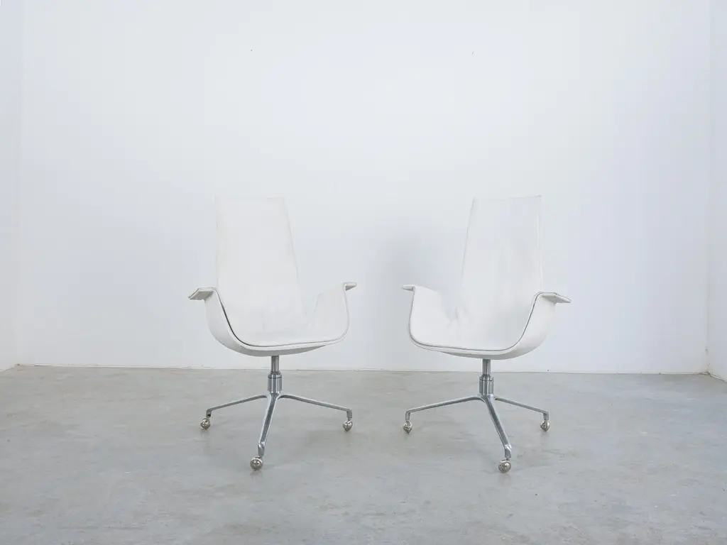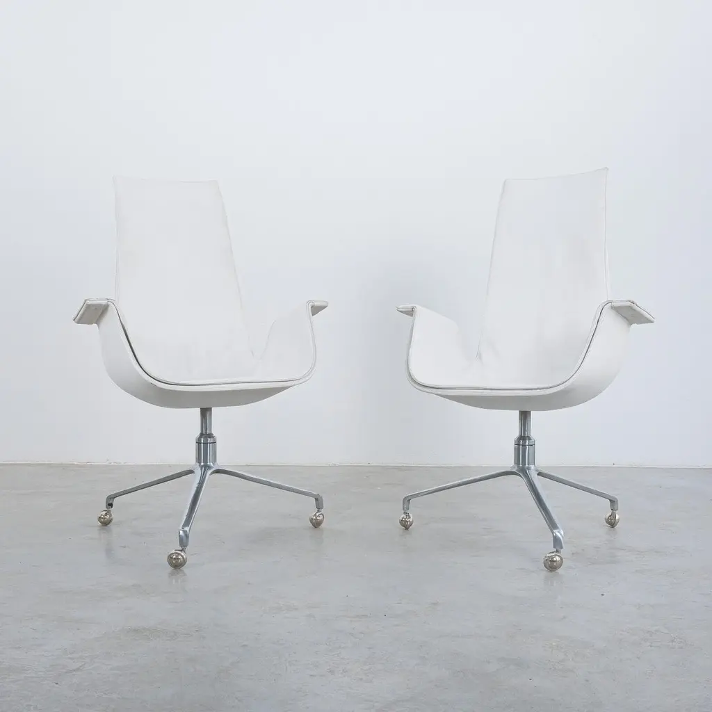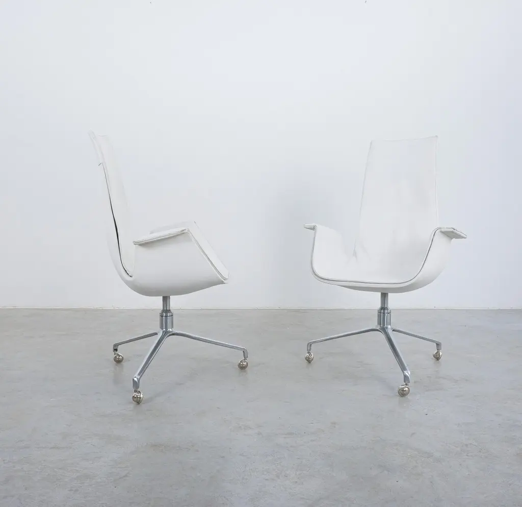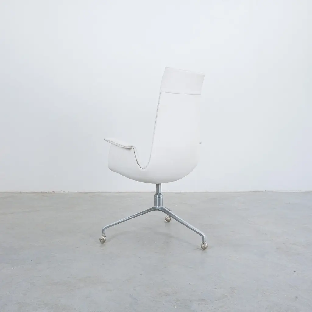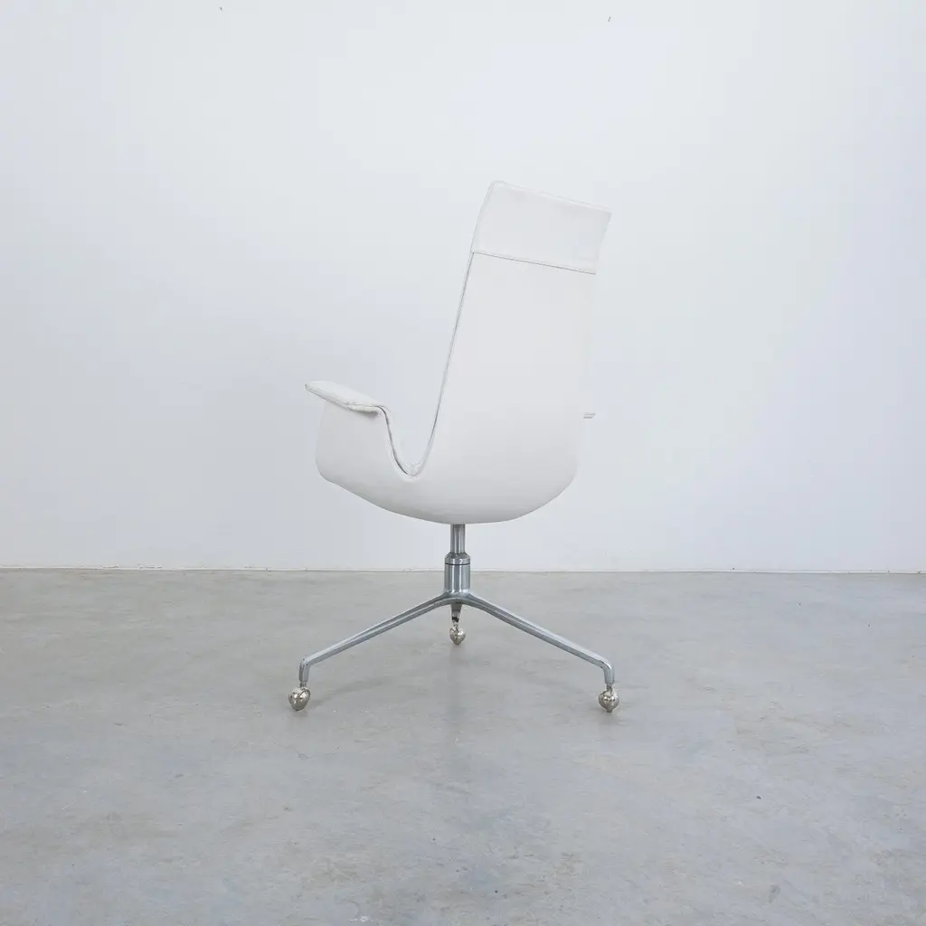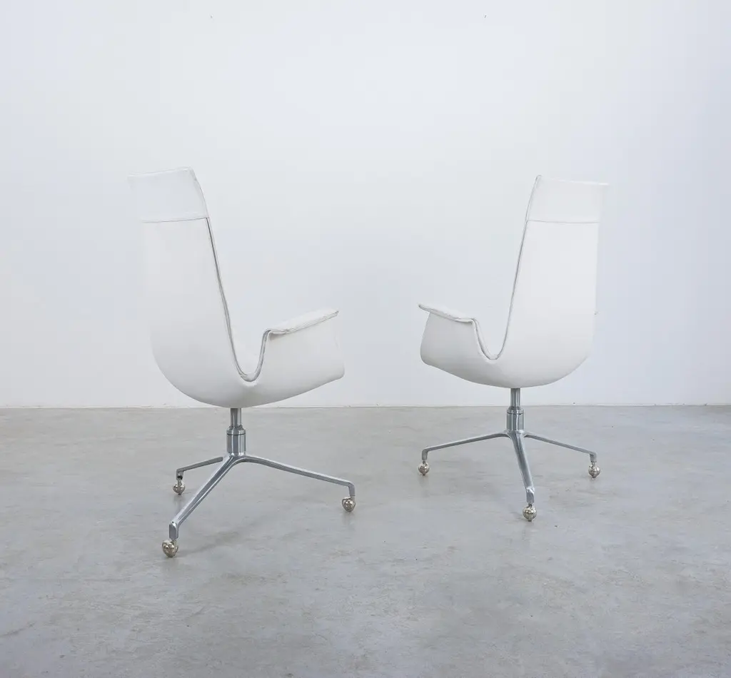 Fabricius and Kastholm 2x White High Back Bird Desk Chair Swivel Base FK 6725, 1964 (seat height 19") Two pieces available, priced per chair.Beautiful set of swiveling high back desk chairs on casters and a tripod base of polished cast stainless steel. Early Kil model from white dyed leather in good condition. The leather is in original condition with minor signs of wear, no holes, little scratching and rub-off. We have treated the leather 2 times with a special leather conditioner to preserve the color and smoothness for years to come. With a seat height of 19" it's the higher executive version and can be perfectly used for a desk. The oblique lines of the design especially in the front seat section, do not only shape a beautiful and iconic chair but also serve the functional aspect for a desk chair to fit under a table.