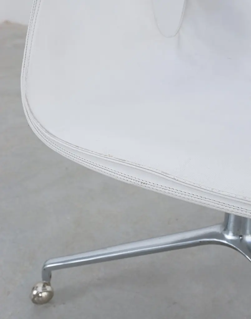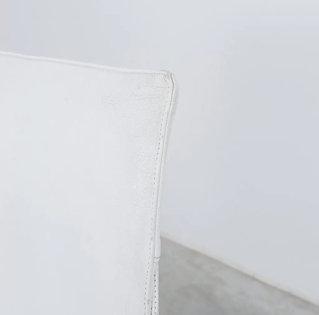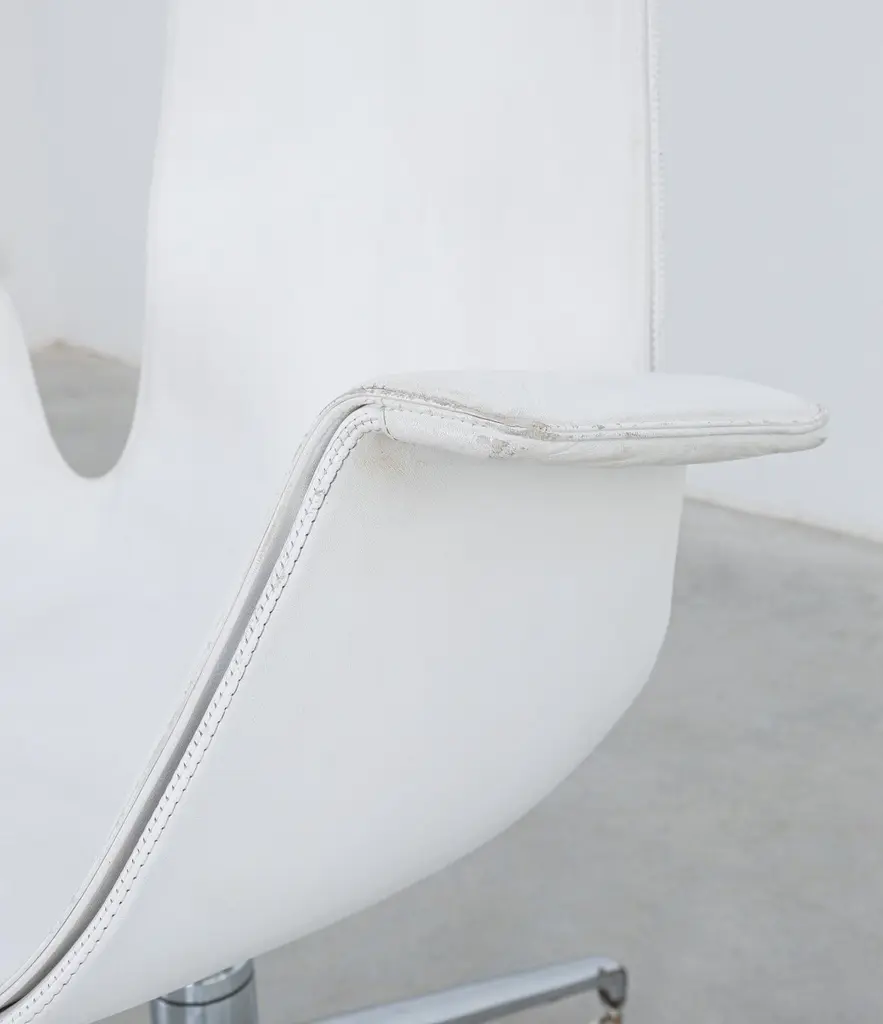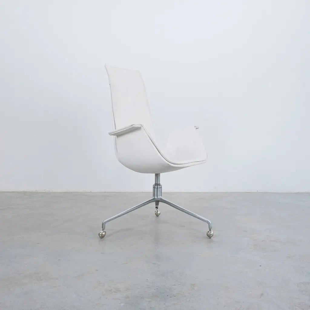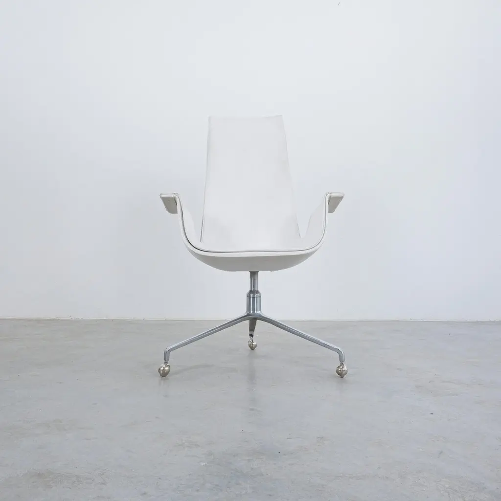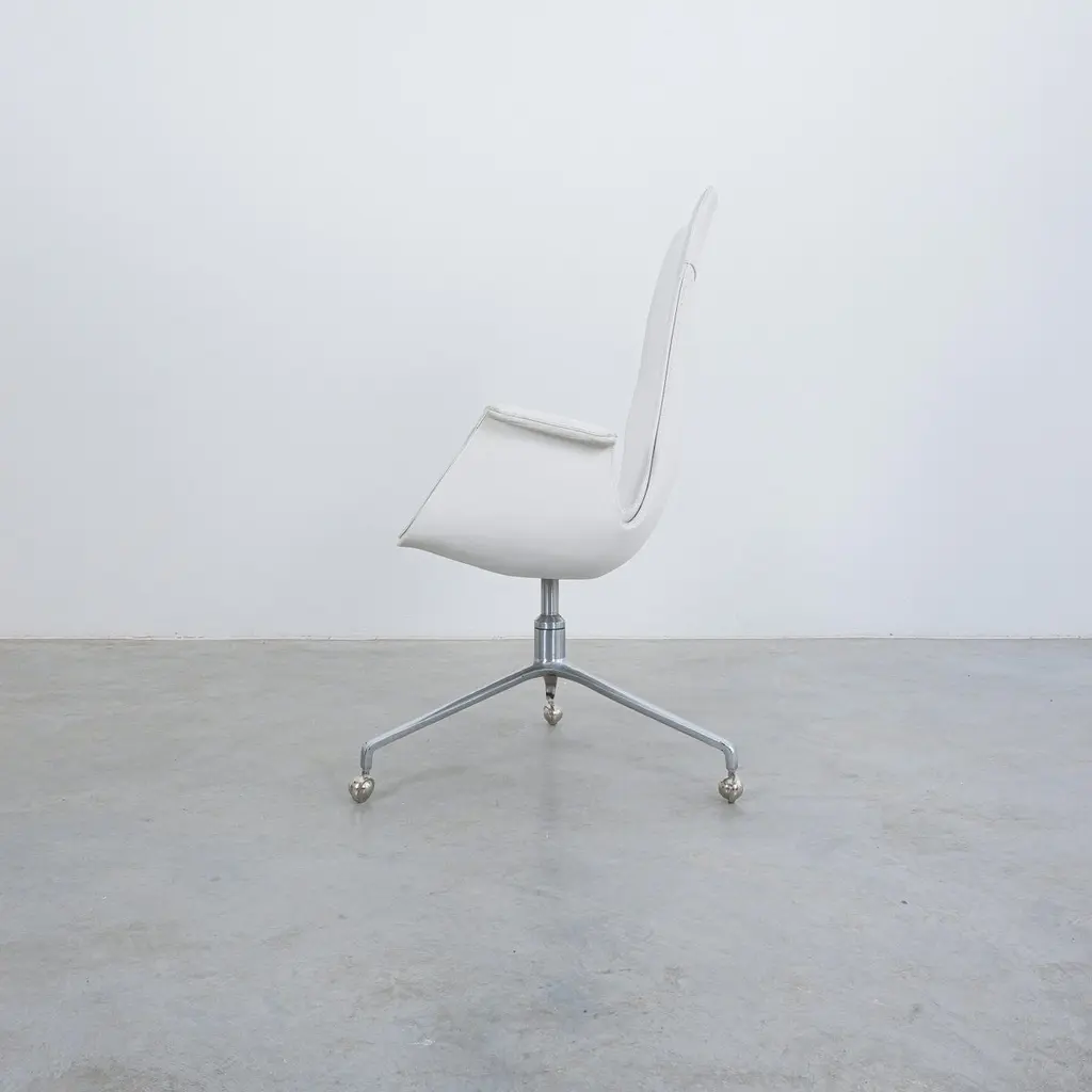 Fabricius and Kastholm 2x White High Back Bird Desk Chair Swivel Base FK 6725, 1964 (seat height 19") Two pieces available, priced per chair.Beautiful set of swiveling high back desk chairs on casters and a tripod base of polished cast stainless steel. Early Kil model from white dyed leather in good condition. The leather is in original condition with minor signs of wear, no holes, little scratching and rub-off. We have treated the leather 2 times with a special leather conditioner to preserve the color and smoothness for years to come. With a seat height of 19" it's the higher executive version and can be perfectly used for a desk. The oblique lines of the design especially in the front seat section, do not only shape a beautiful and iconic chair but also serve the functional aspect for a desk chair to fit under a table.