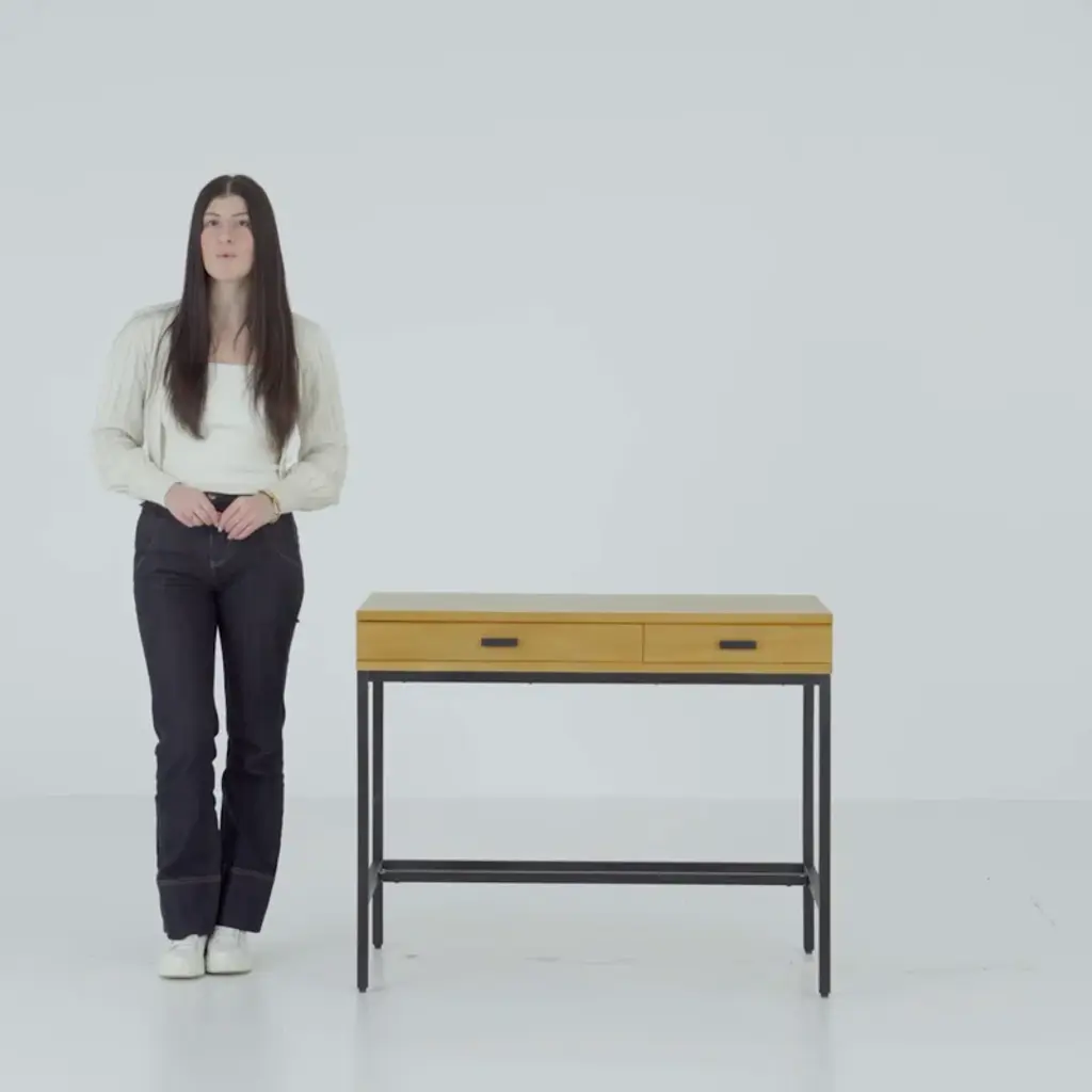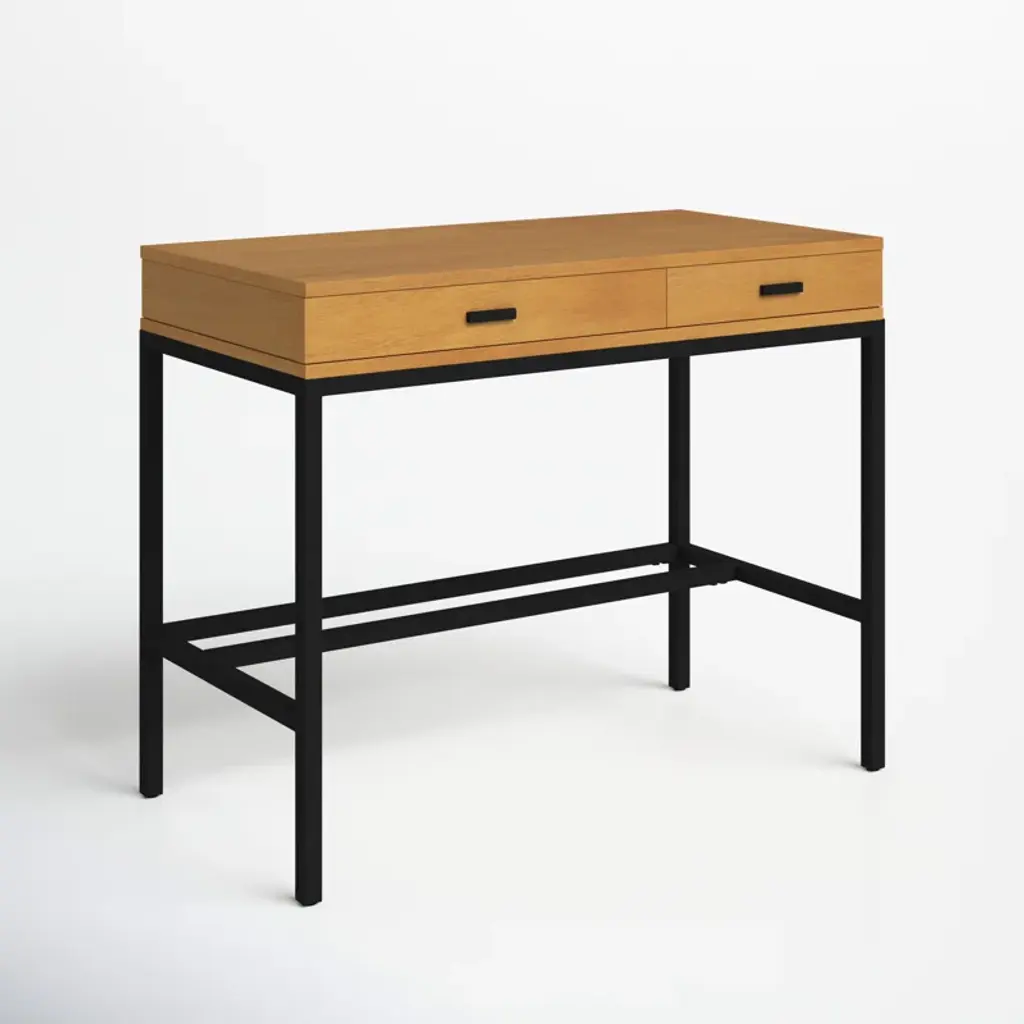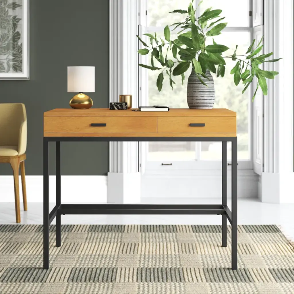 Simple and sophisticated, this desk has a neutral, understated look that's made to fit in just about anywhere. It's crafted from solid and engineered wood with a neutral finish. The two drawers are set on smooth ball-bearing glides and reinforced with mortise and tenon joinery. Metal hardware on the drawers ties the look together with a subtle nod to industrial style. The classic square silhouette is warm and welcoming, but our favorite detail is the versatility: Its understated style means you can go bold with an office chair.