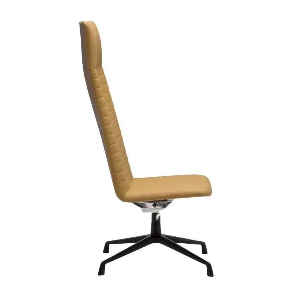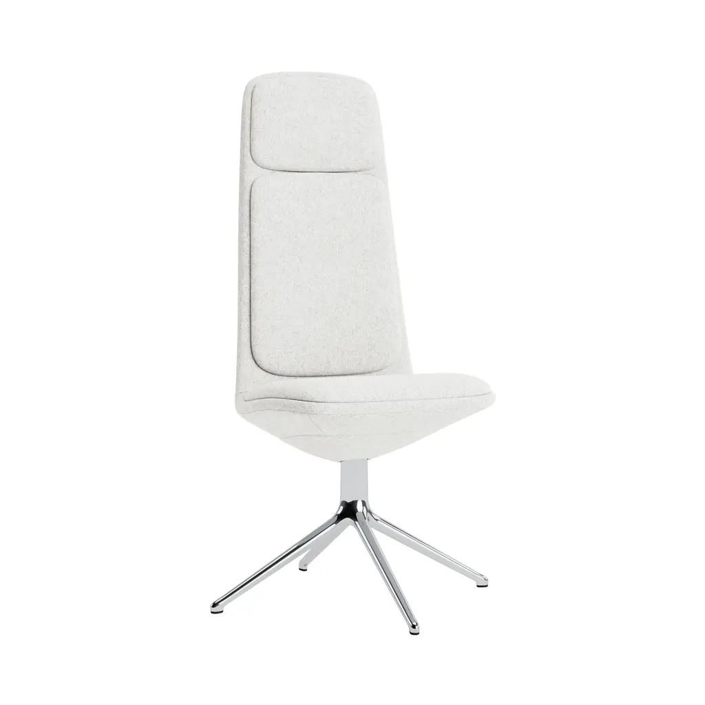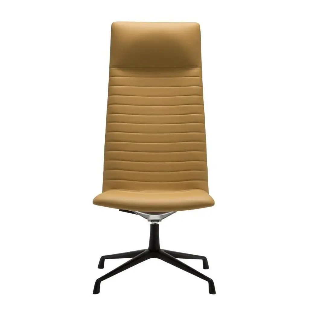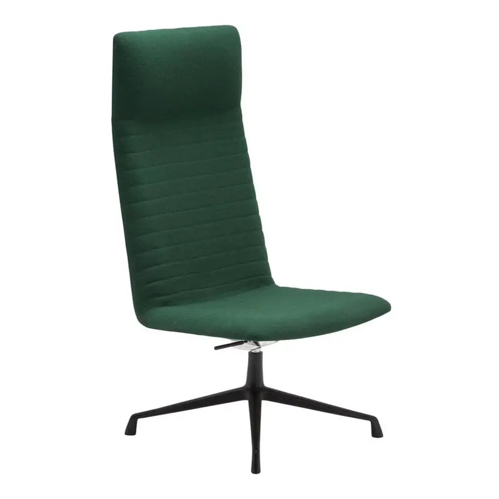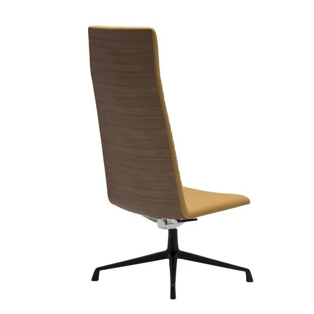 High back lounge chair with upholstered shell and aluminum swivel four-star base with self-return and finished in polished aluminum, white or black. Additional options include: parallel upholstery stitching, tilt mechanism and back finished in walnut veneer. The Flex family of seating has evolved with the addition of the new collection Flex Executive. This collection consists of conference chairs and armchairs that are available in three backrest versions: low, intermediate, and high. Additionally, two versions of lounge chairs, with two distinct backrest heights, complete the collection. Additional options include back finished in walnut veneer.
