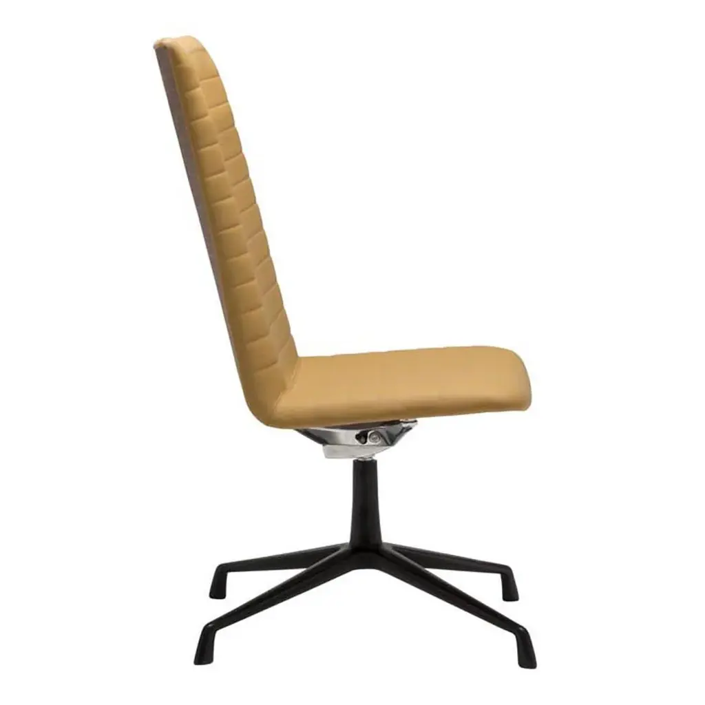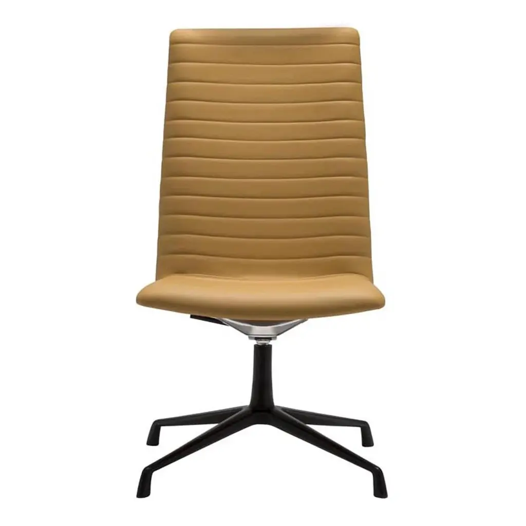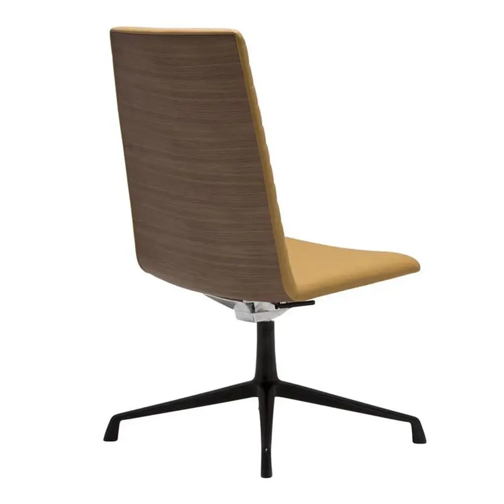 Intermediate back chair with upholstered shell and aluminum swivel four-star base with self-return and finished in polished aluminum, white or black. Additional options include: parallel upholstery stitching, tilt mechanism and back finished in walnut veneer. The Flex family of seating has evolved with the addition of the new collection Flex Executive. This collection consists of conference chairs and armchairs that are available in three backrest versions: low, intermediate, and high. Additionally, two versions of lounge chairs, with two distinct backrest heights, complete the collection. Additional options include back finished in walnut veneer.